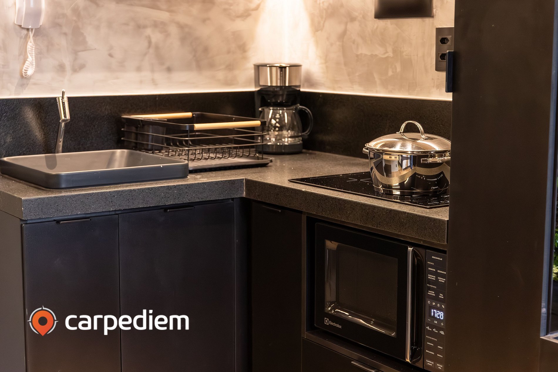 • Cozinha compacta e funcional, equipada com fogão, geladeira, micro-ondas, cafeteira, liquidificador, louças, talheres e itens básicos de cozinha