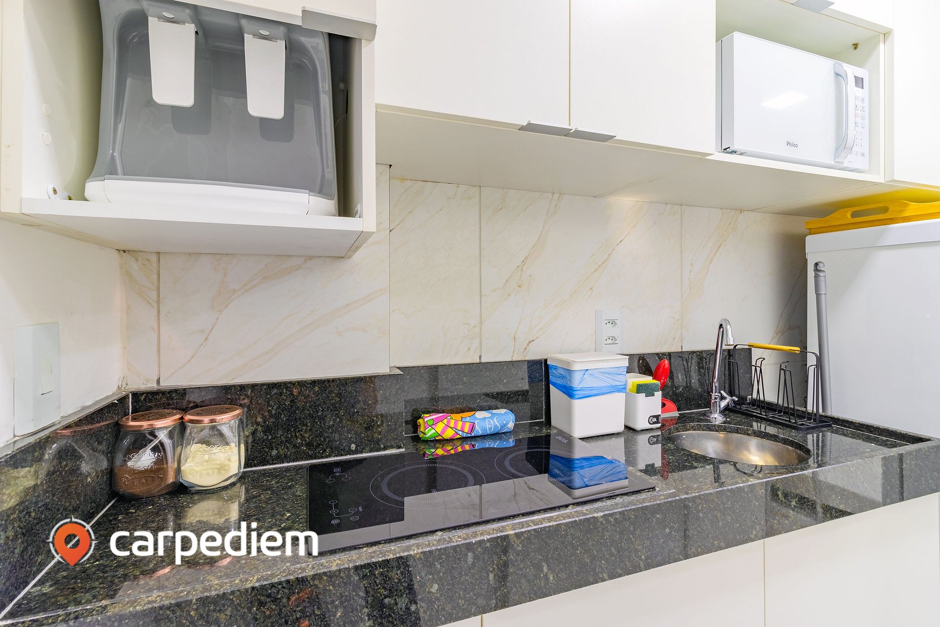 • Cozinha compacta e equipada: Ideal para quem busca independência durante a hospedagem, o espaço dispõe de fogão, geladeira, micro-ondas, cafeteira, torradeira, liquidificador, pia, além de louças, talheres, copos de vinho e itens básicos de cozinha.