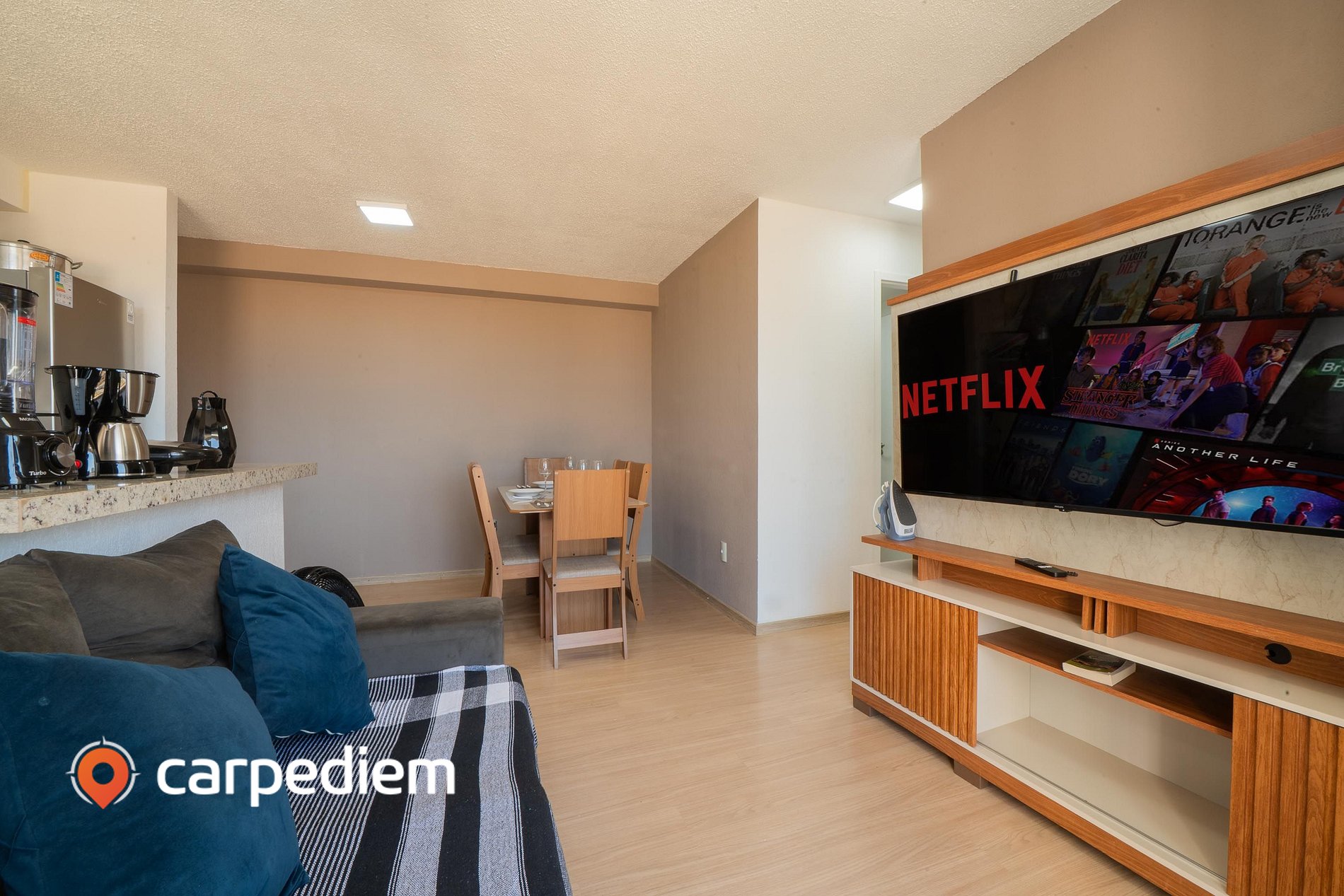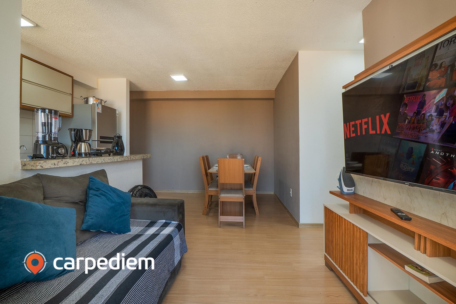 • Sala de estar: TV smart, mesa com 6 cadeiras, ventilador e cortina, mesa de jantar com 6 lugares.