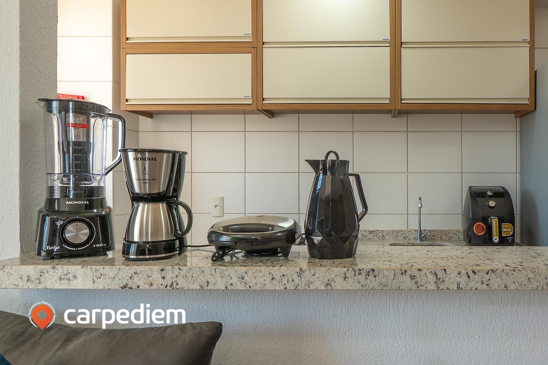 • Geladeira duplex, fogão de quatro bocas com forno, micro-ondas, airfryer, cafeteira com coador, torradeira, liquidificador, armários, além de panelas, louças e talheres.