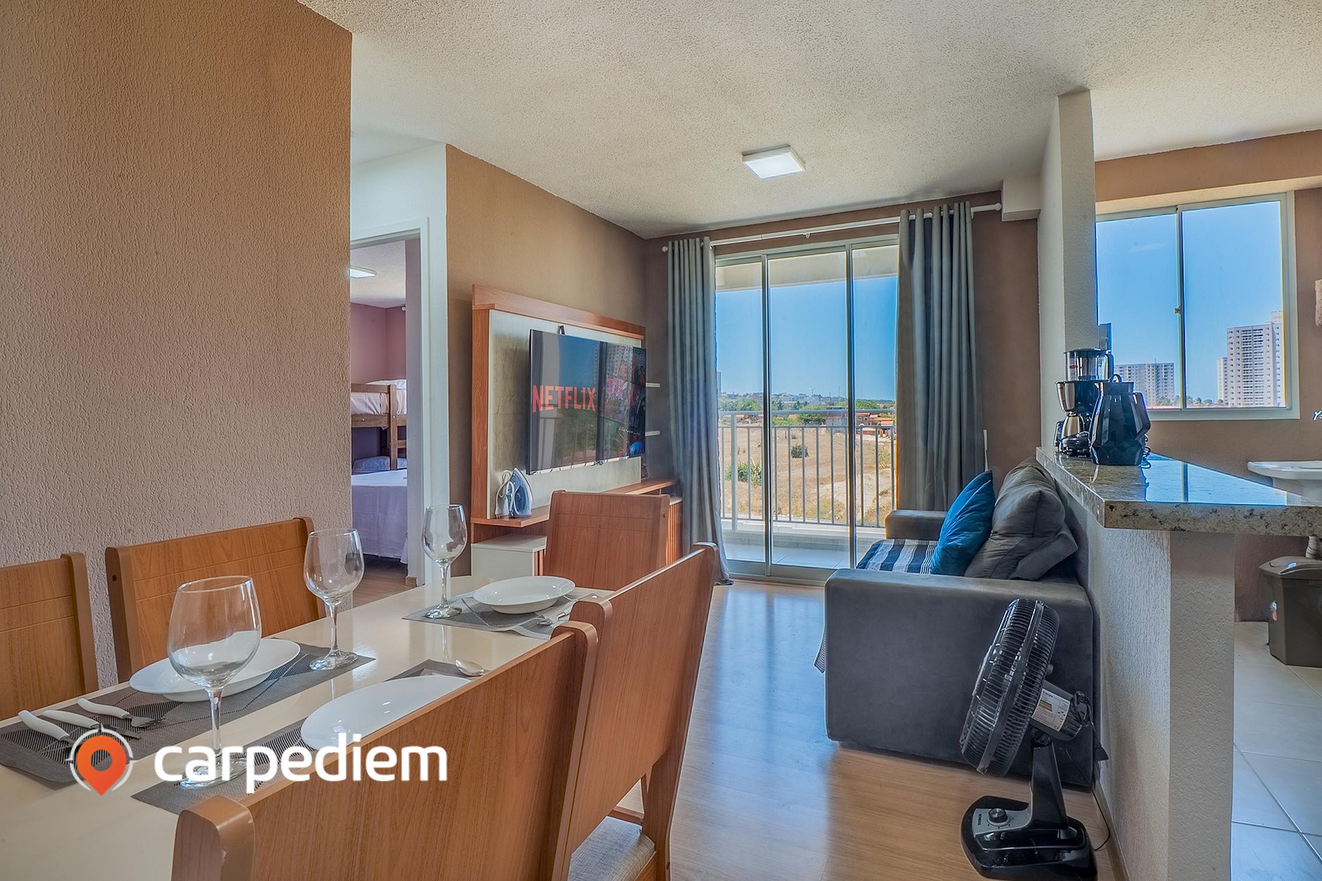 • Sala de estar: TV smart, mesa com 6 cadeiras, ventilador e cortina, mesa de jantar com 6 lugares.