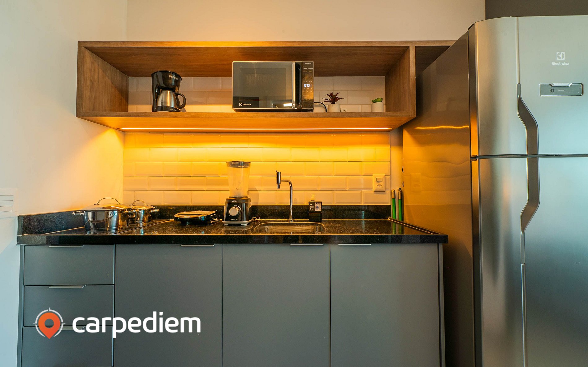 • Cozinha completa: geladeira duplex, cooktop de duas bocas, cafeteira, liquidificador. sanduicheira, panelas, louças e talheres.