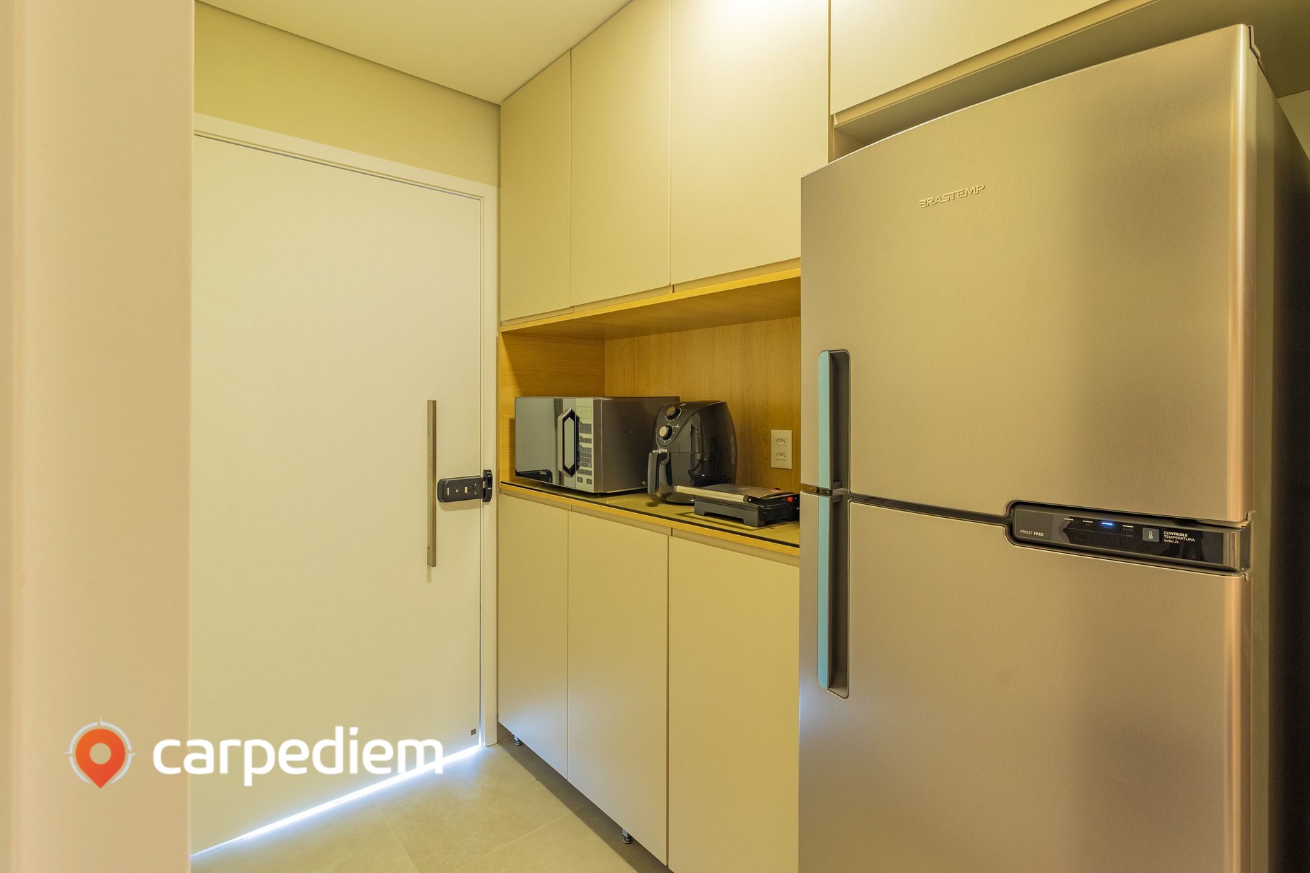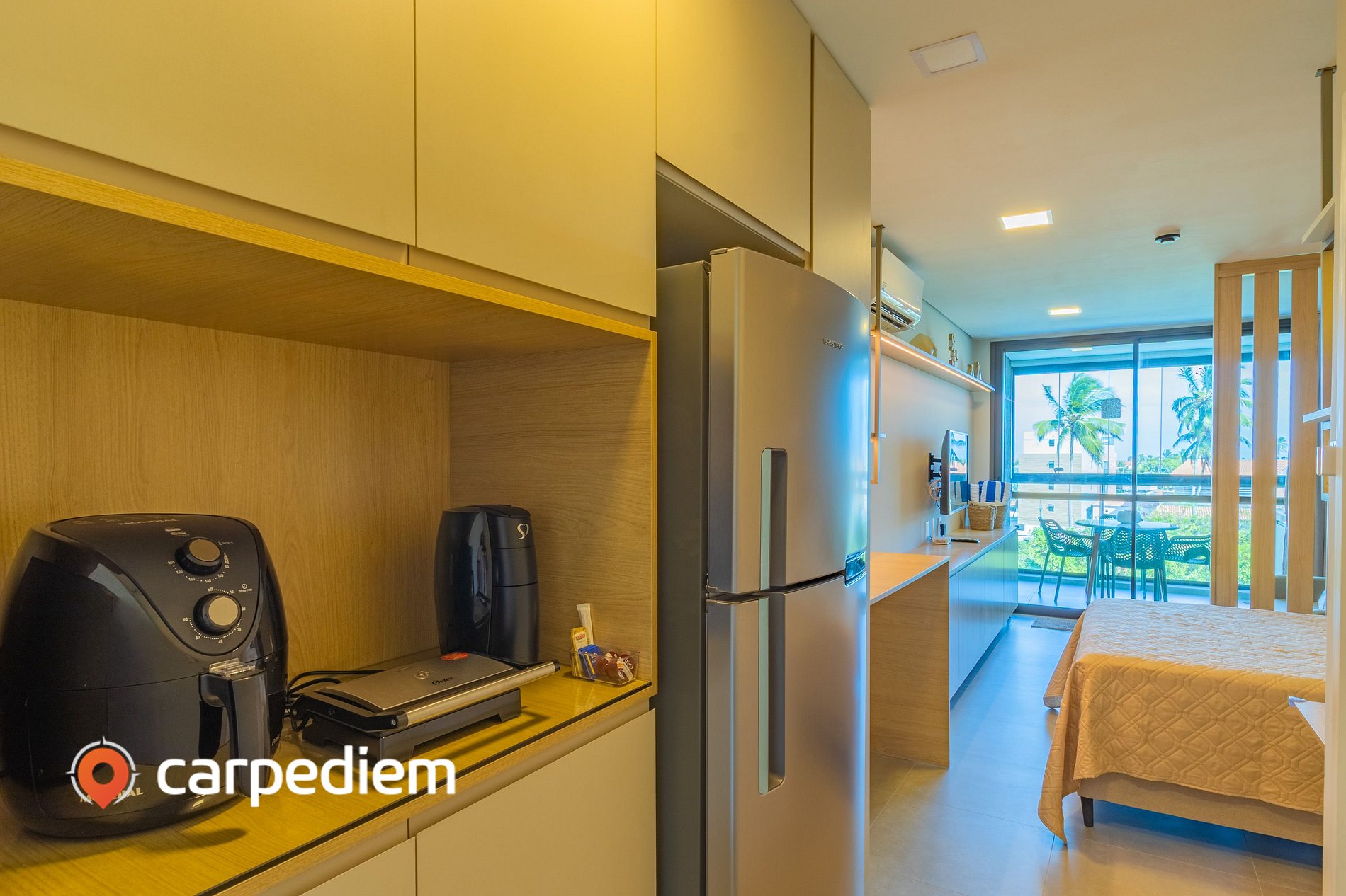 • Cozinha compacta equipada: armários planejados, geladeira frost free duplex, airfryer, torradeira e máquina de café para preparar suas refeições com facilidade.