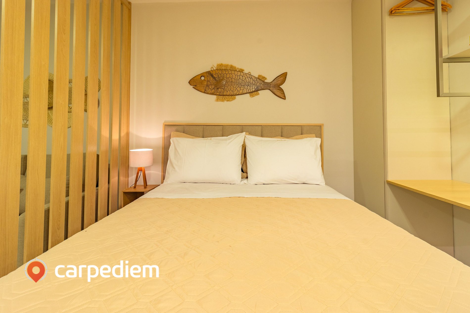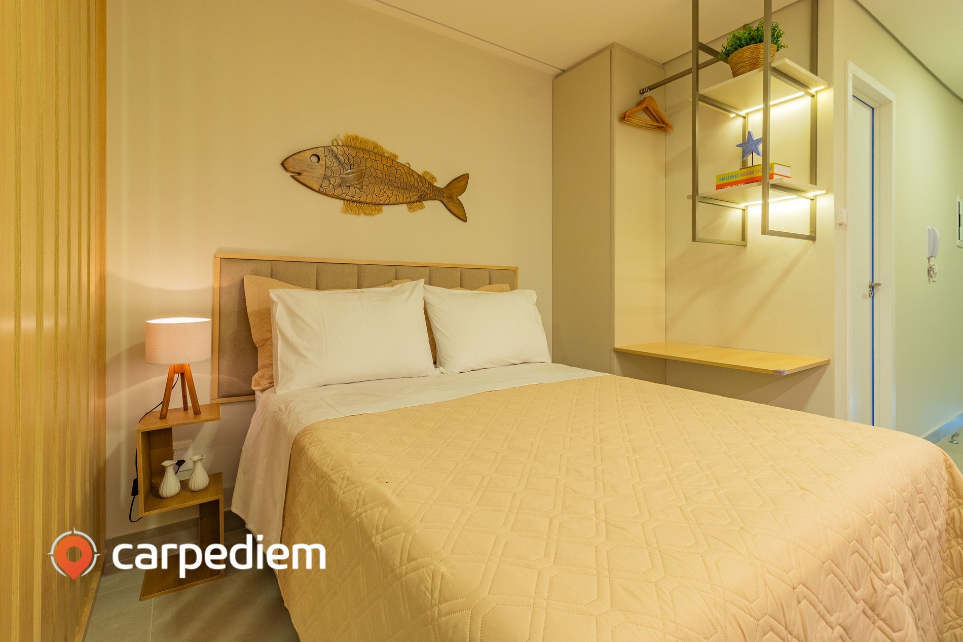 • Cama de casal confortável: perfeita para noites de descanso profundo em um ambiente moderno e aconchegante.