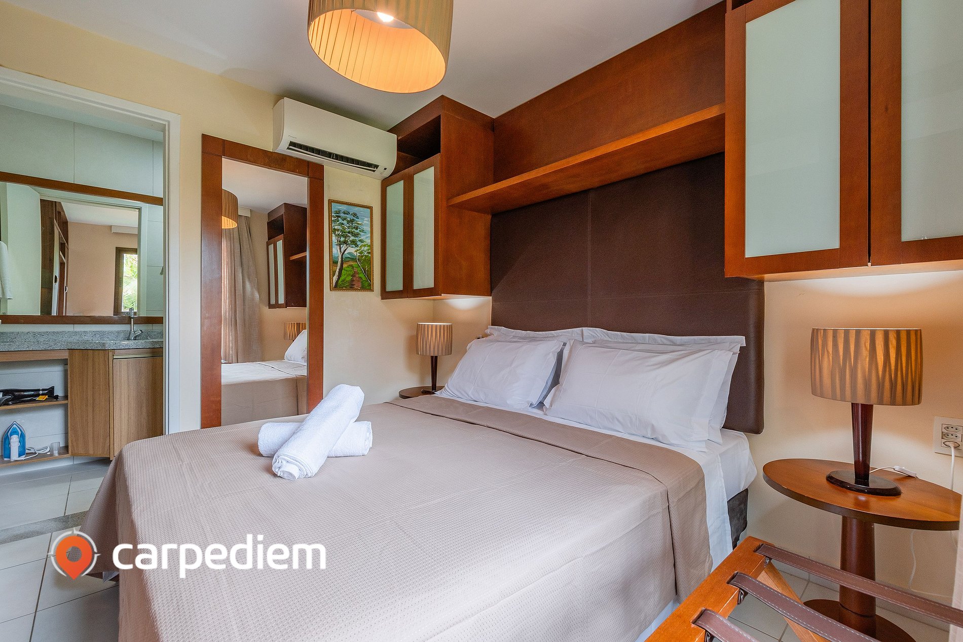 • Quarto suíte: Pensado para noites tranquilas e dias mais leves, o quarto oferece uma cama queen com tomada ao lado para maior praticidade. O ar-condicionado garante conforto térmico, enquanto a cortina blackout cria o ambiente ideal para descansar. O espaço conta ainda com guarda-roupas, espelho de corpo inteiro e mesinha de cabeceira com abajur. O banheiro privativo é completo, com box de vidro, espelho e armários.