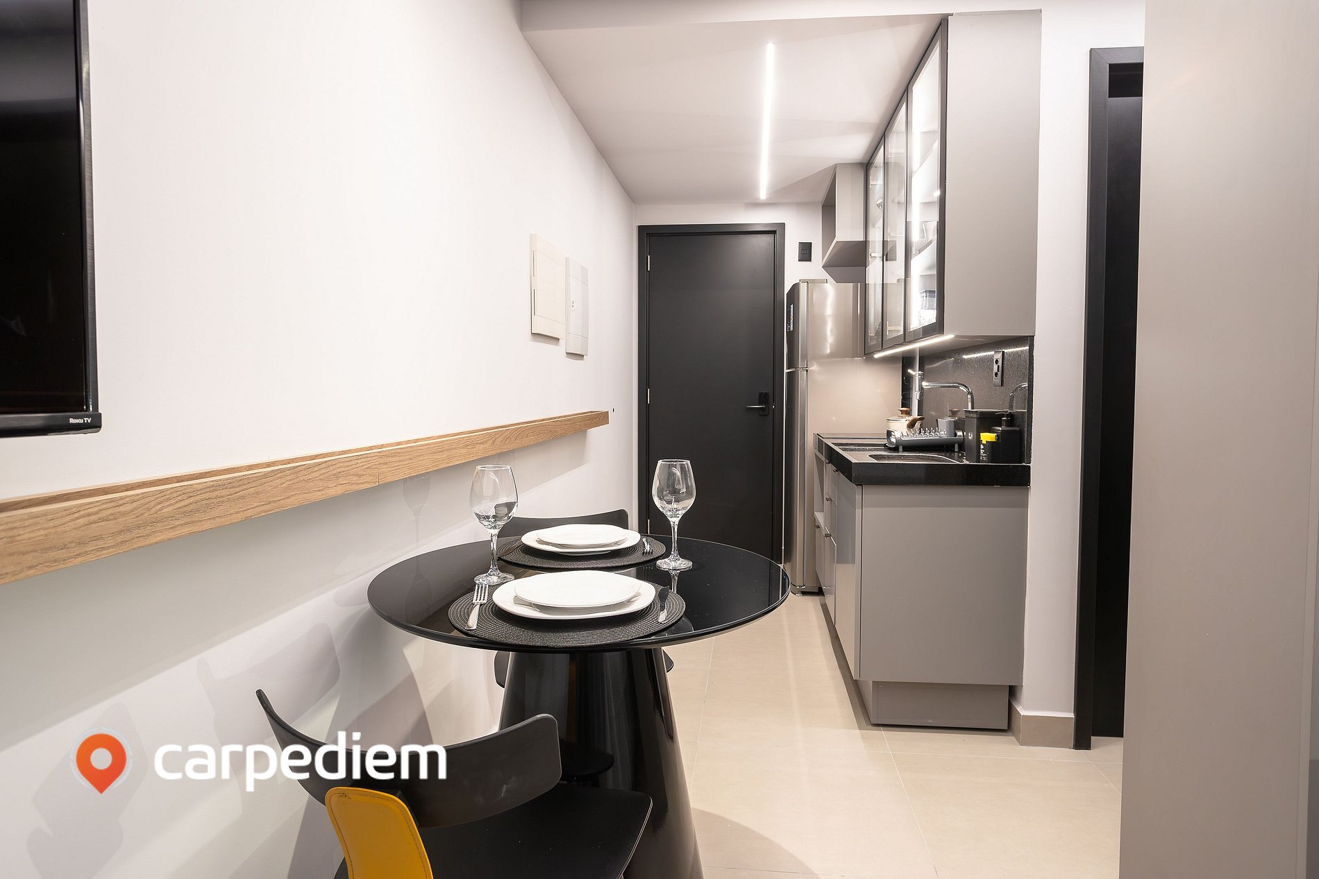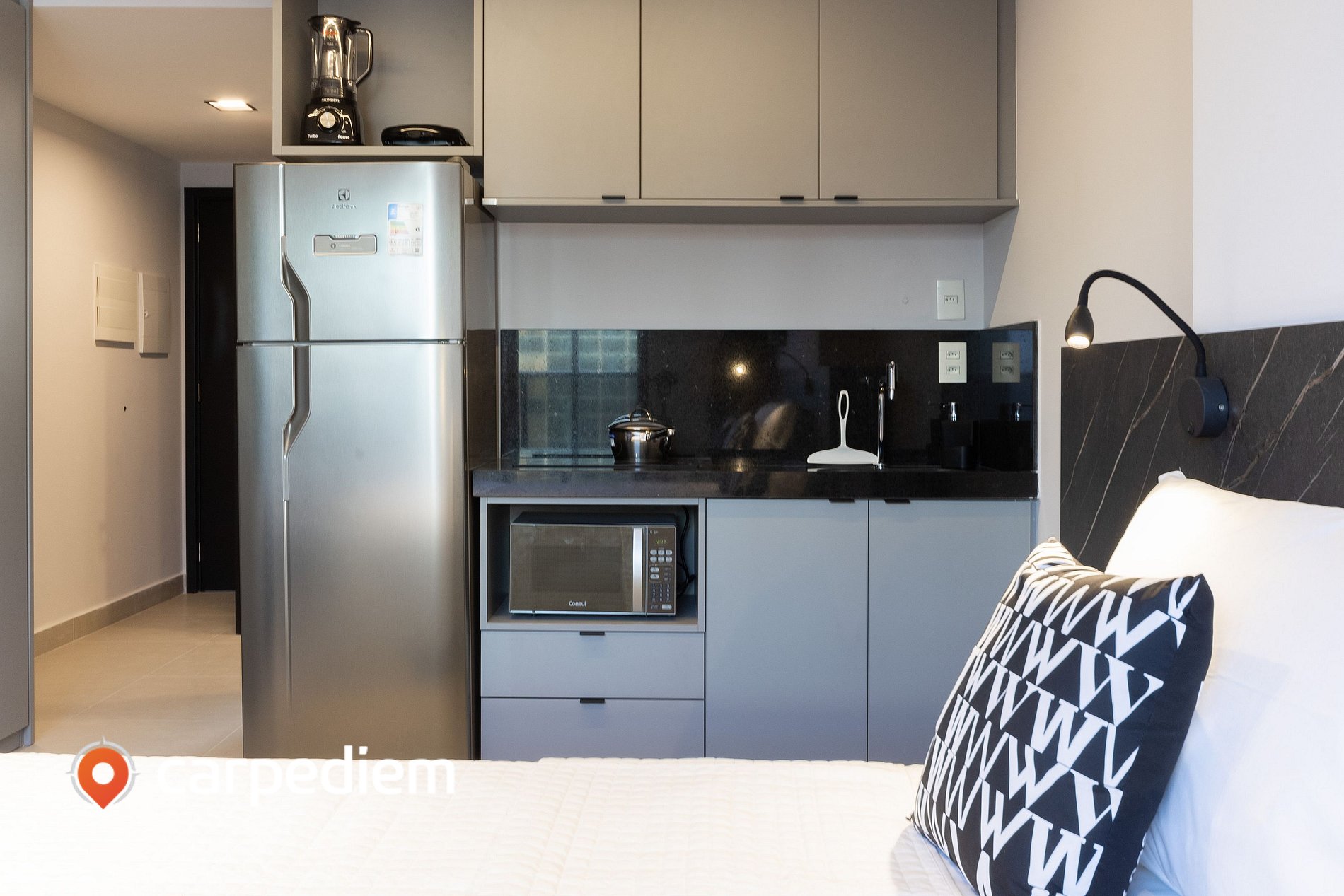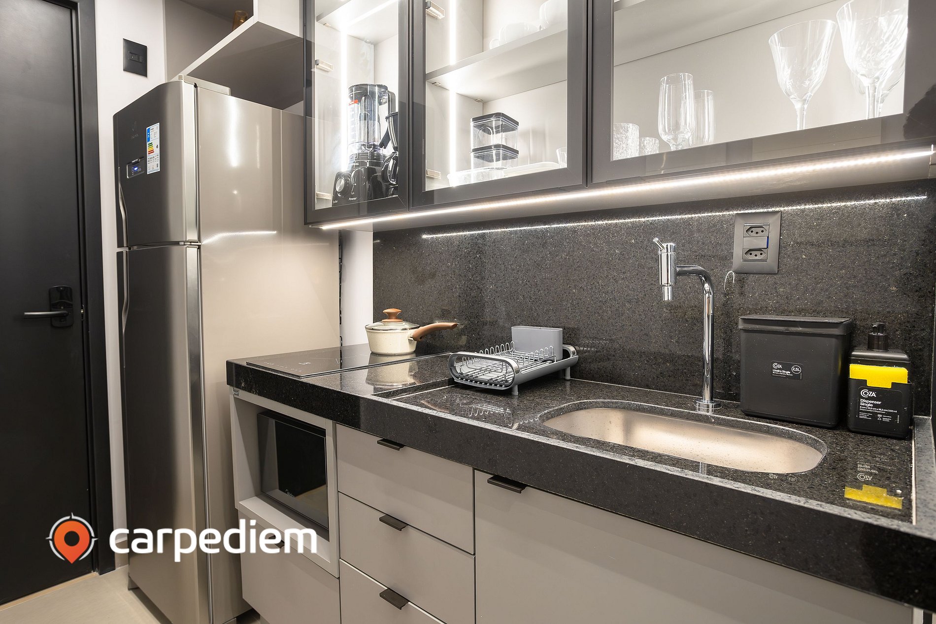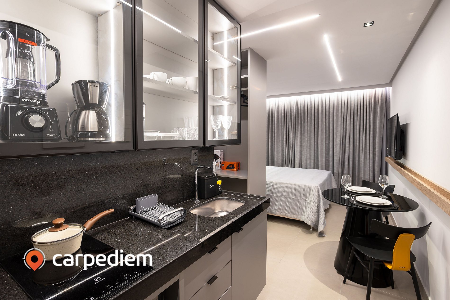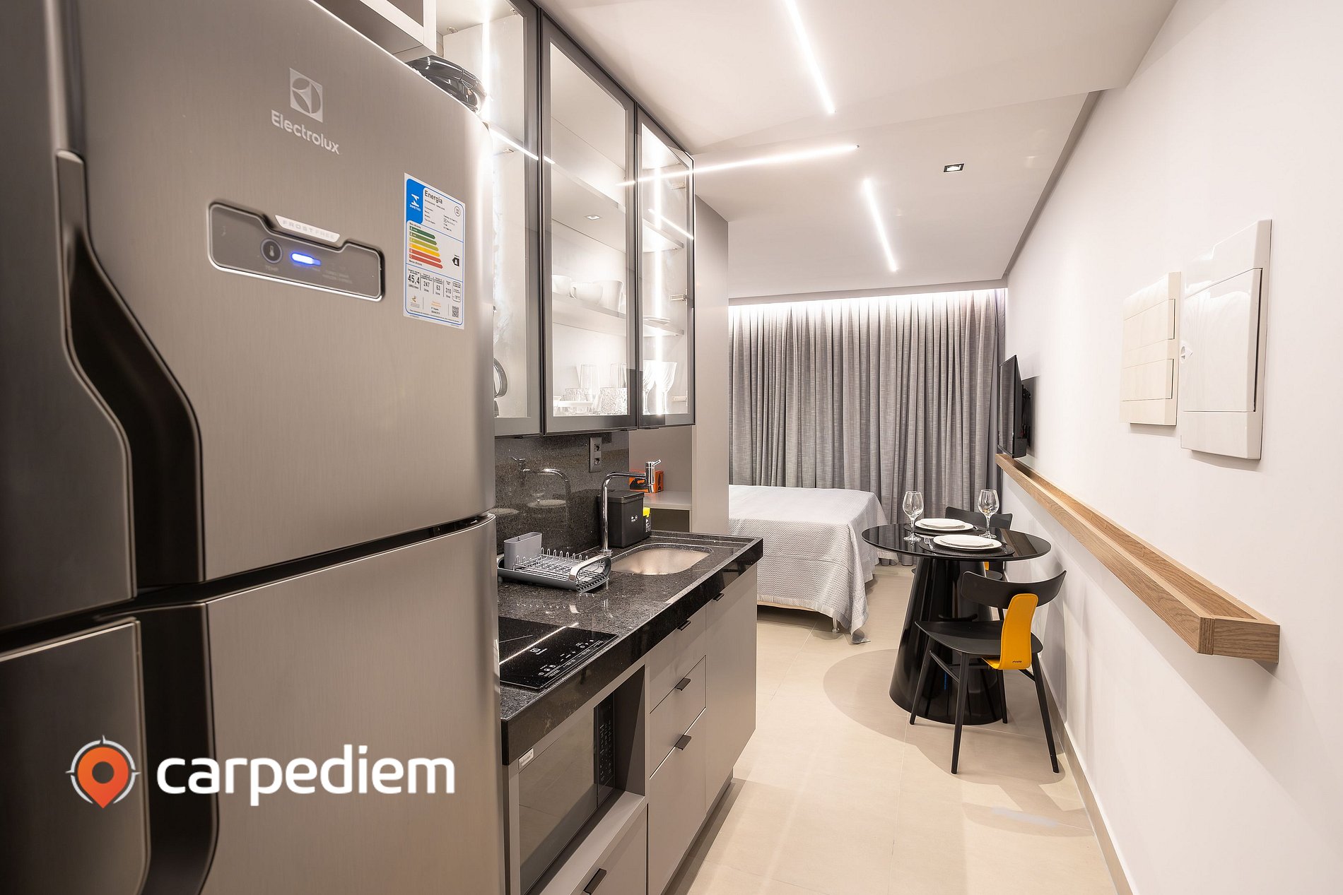 • Cozinha completa: geladeira duplex, cooktop, micro-ondas, máquina de café e utensílios para preparar qualquer refeição.