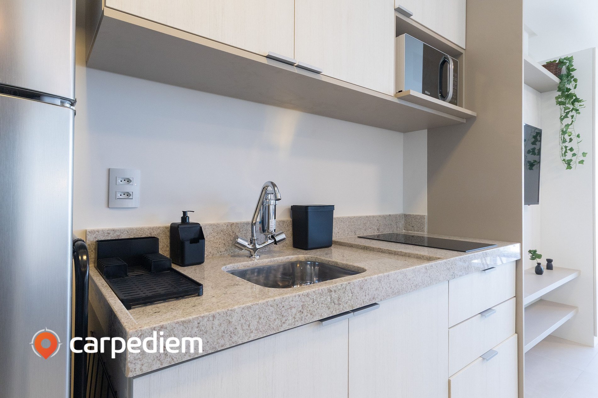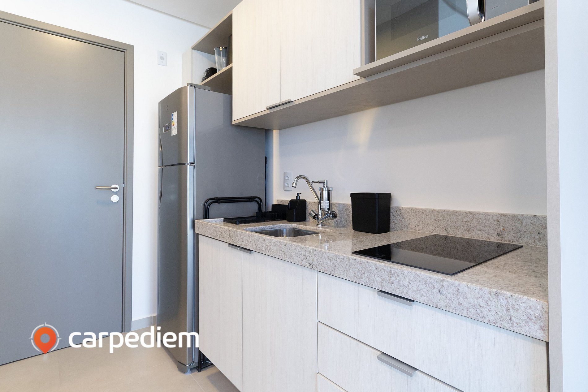 • Cozinha compacta e funcional: equipada com geladeira frost free duplex, cooktop de uma boca, micro-ondas, liquidificador, torradeira, cafeteira, panelas, utensílios, copos e xícaras. Pensada para quem gosta de praticidade no dia a dia.