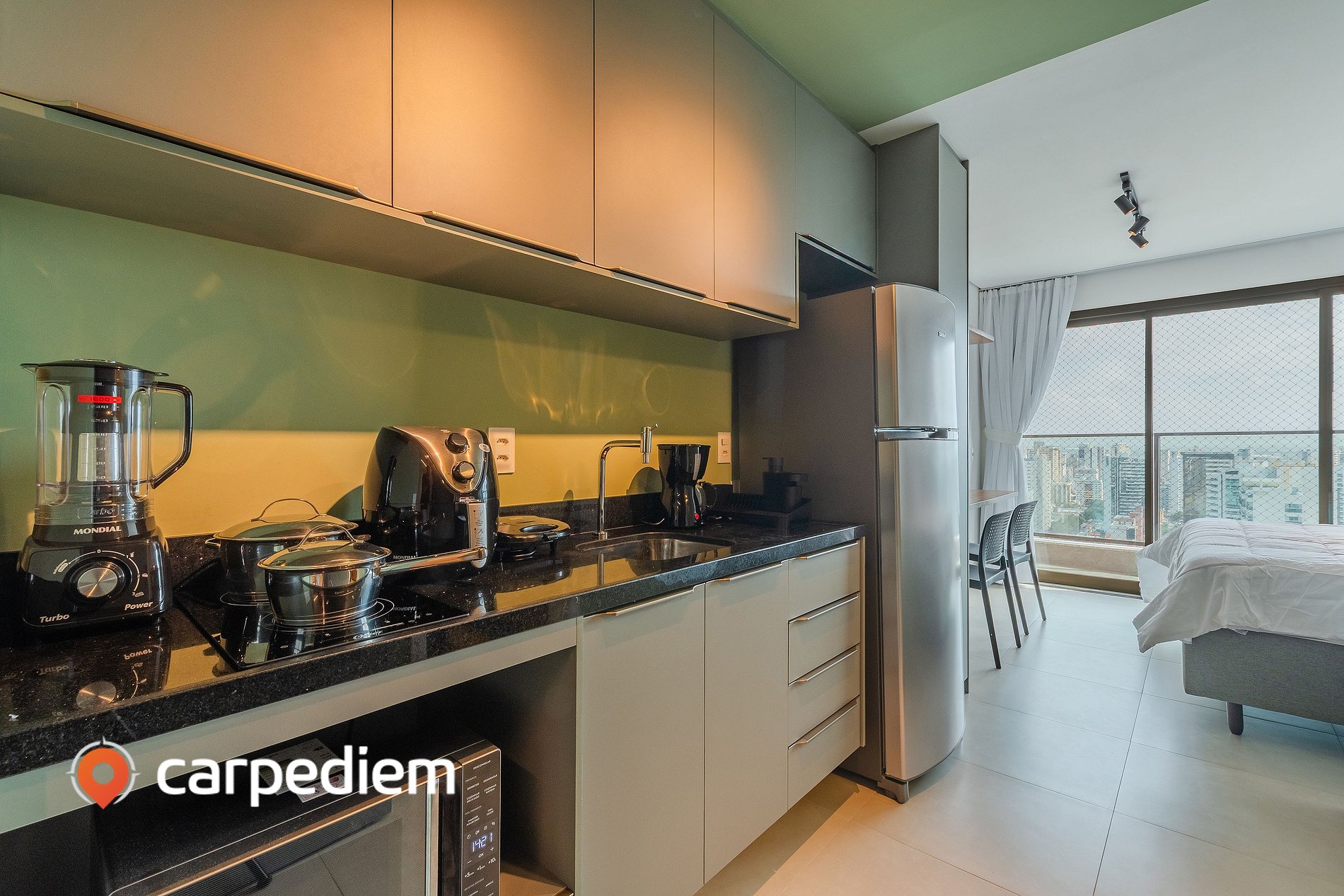 • Cozinha equipada: armários, geladeira, cooktop de duas bocas, cafeteira, liquidificador. sanduicheira, Airfryer, microondas, panelas, louças e talheres.