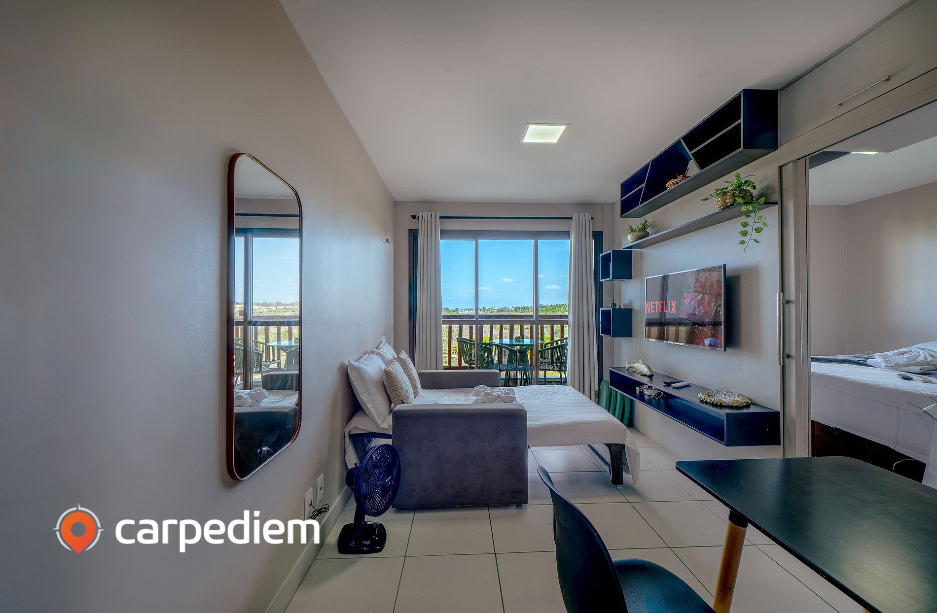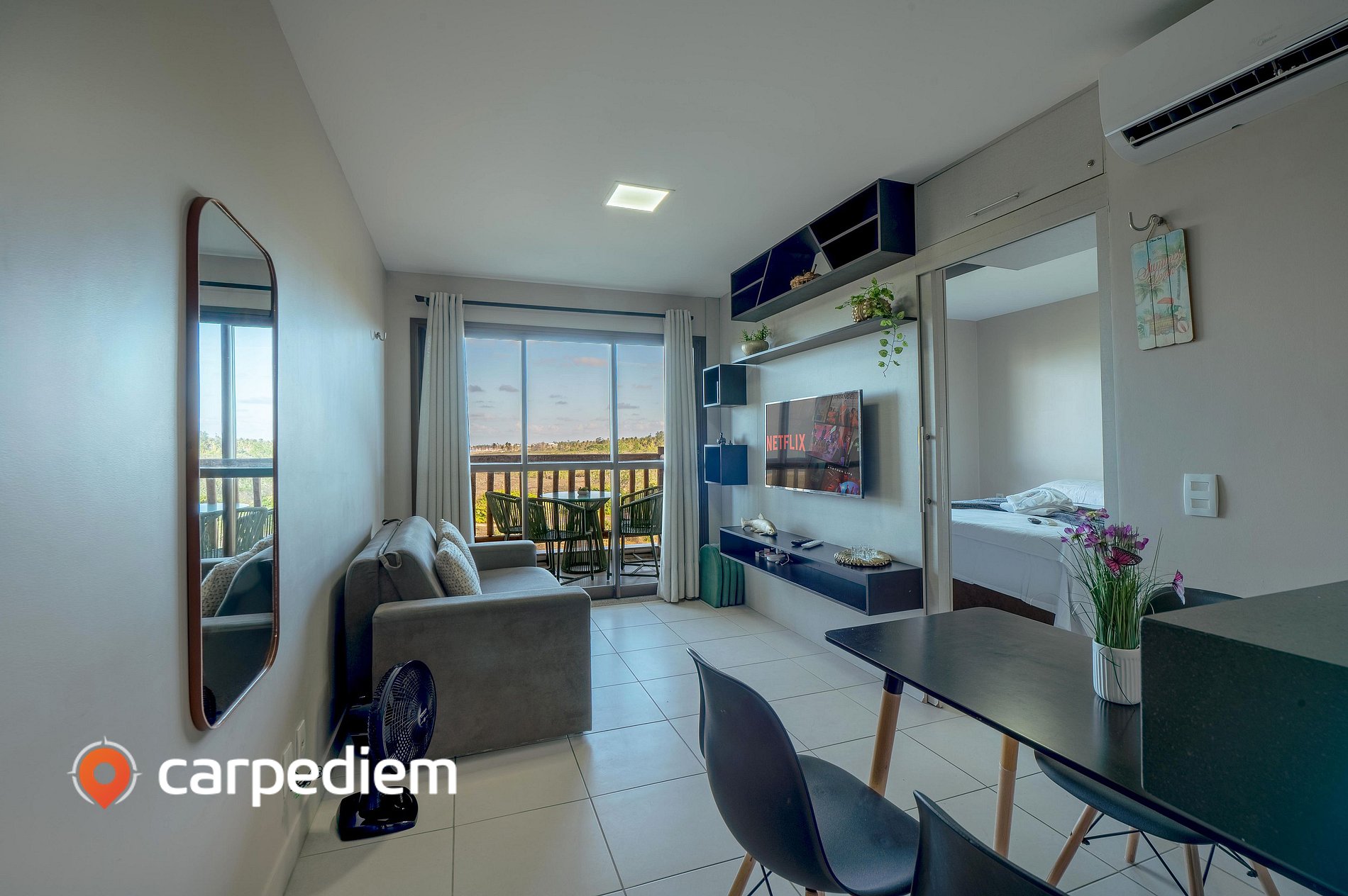 • Sala integrada e aconchegante, com sofá-cama casal, TV smart, ventilador, ar-condicionado, espelho e mesa de jantar com 4 cadeiras — um ambiente confortável para relaxar após um dia de praia.