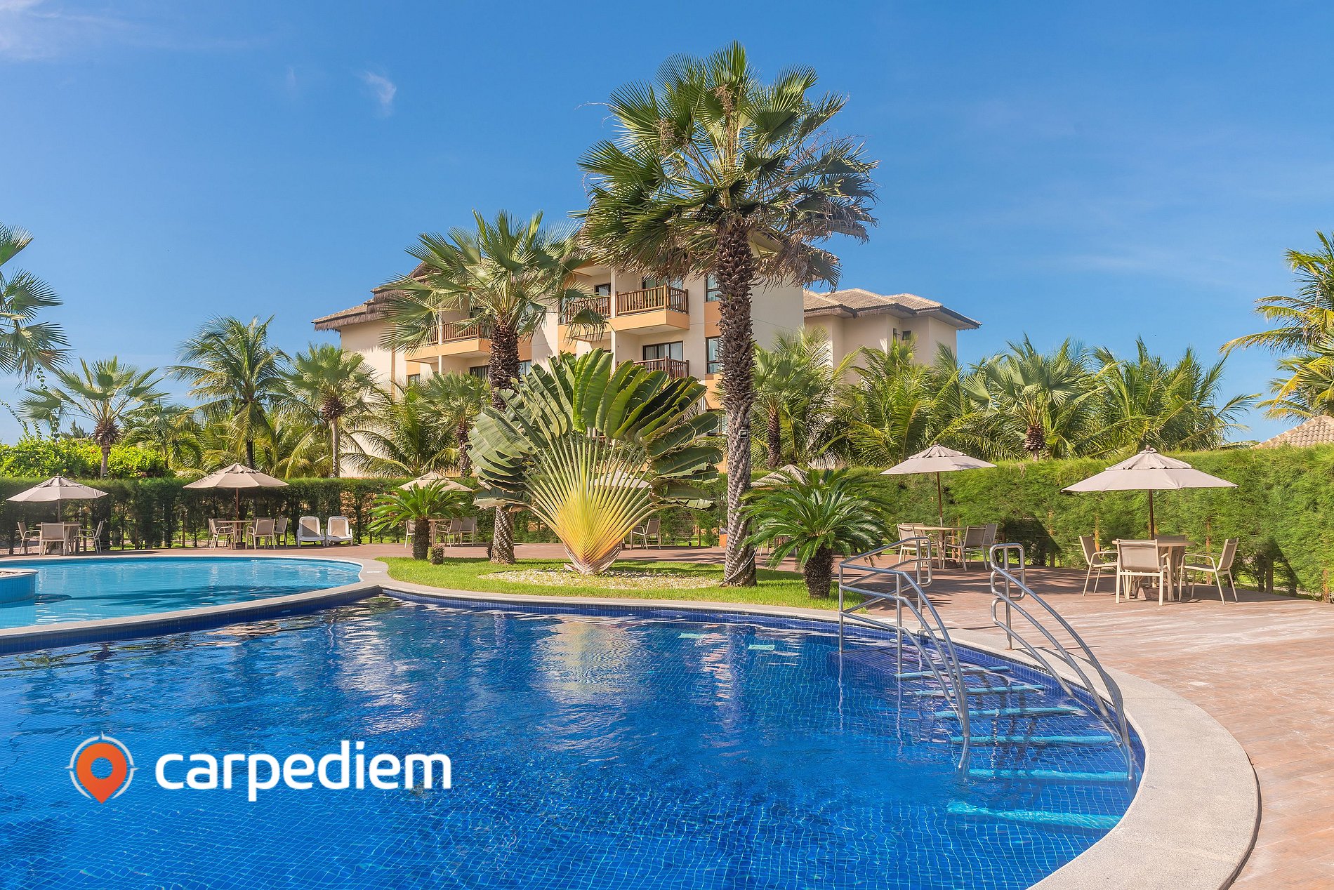 • Piscinas amplas com paisagismo tropical, rodeadas por palmeiras e espreguiçadeiras para dias inteiros de descanso ao sol.