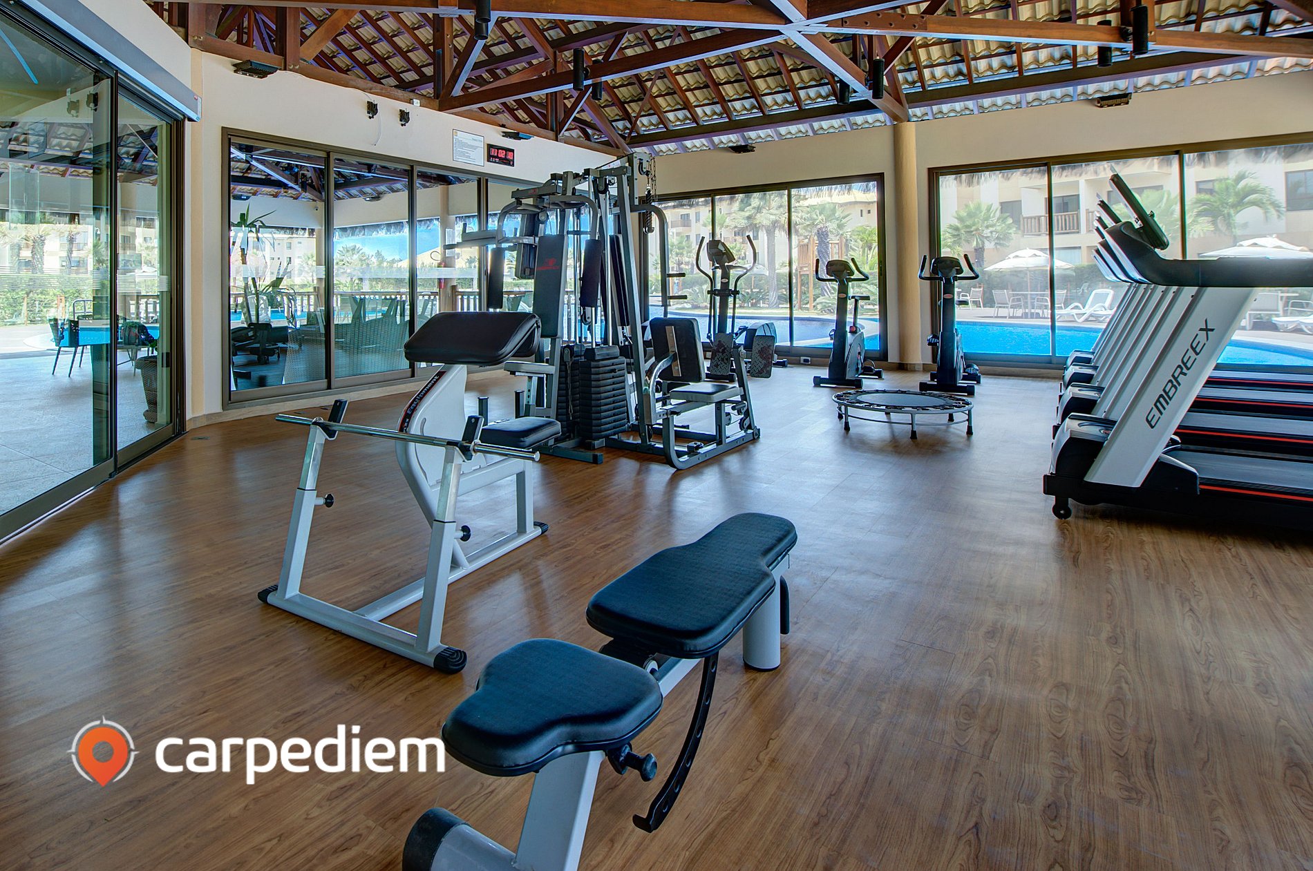 • Academia equipada com vista para a piscina, mantendo sua rotina mesmo durante a viagem.