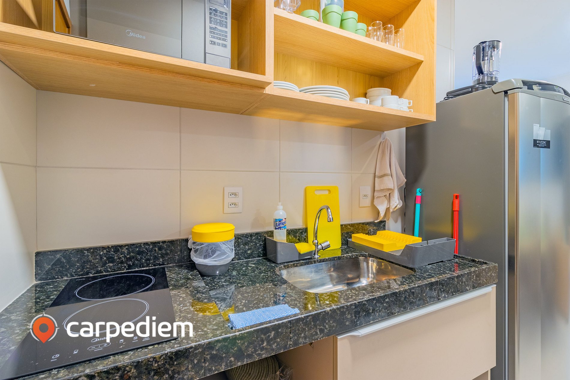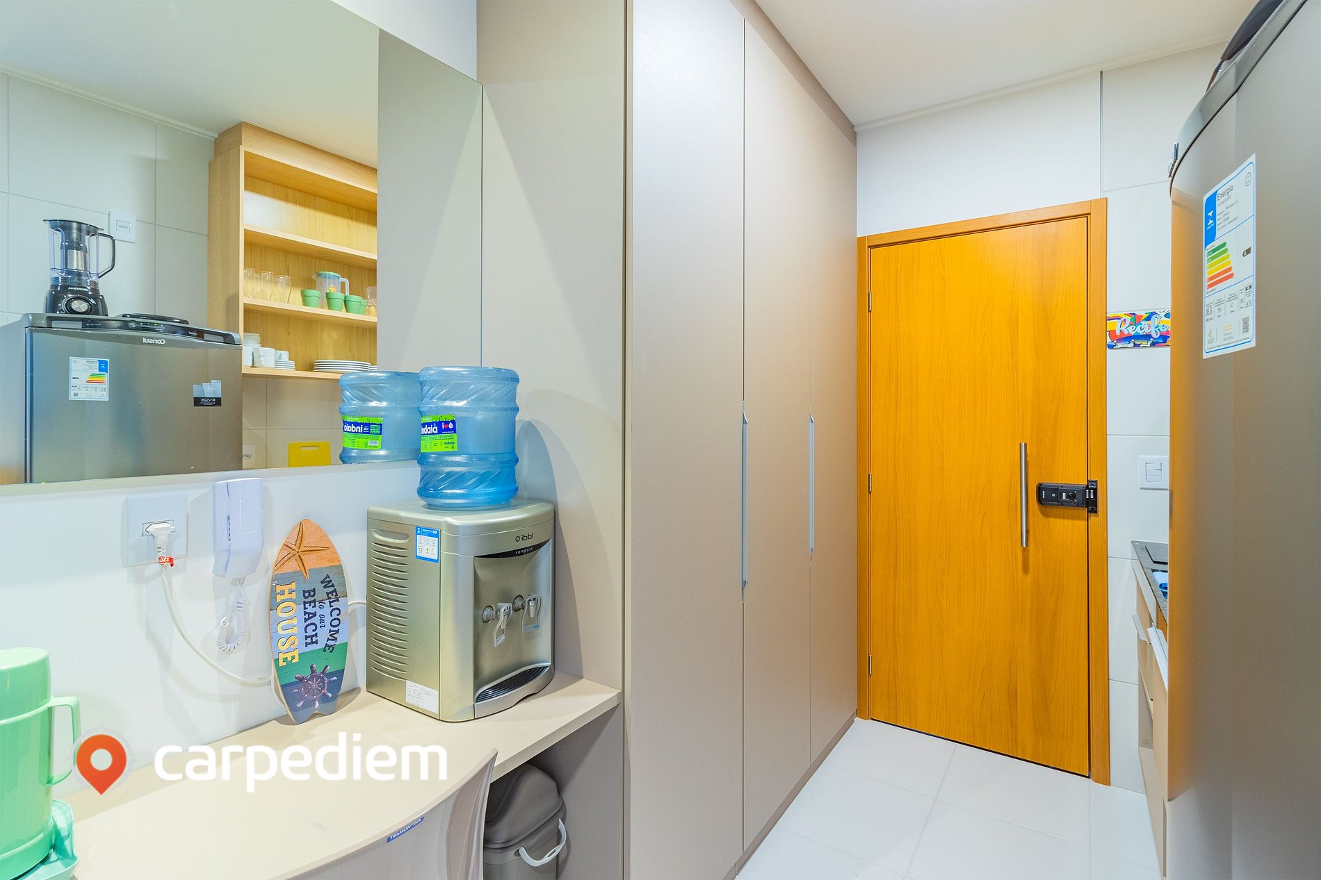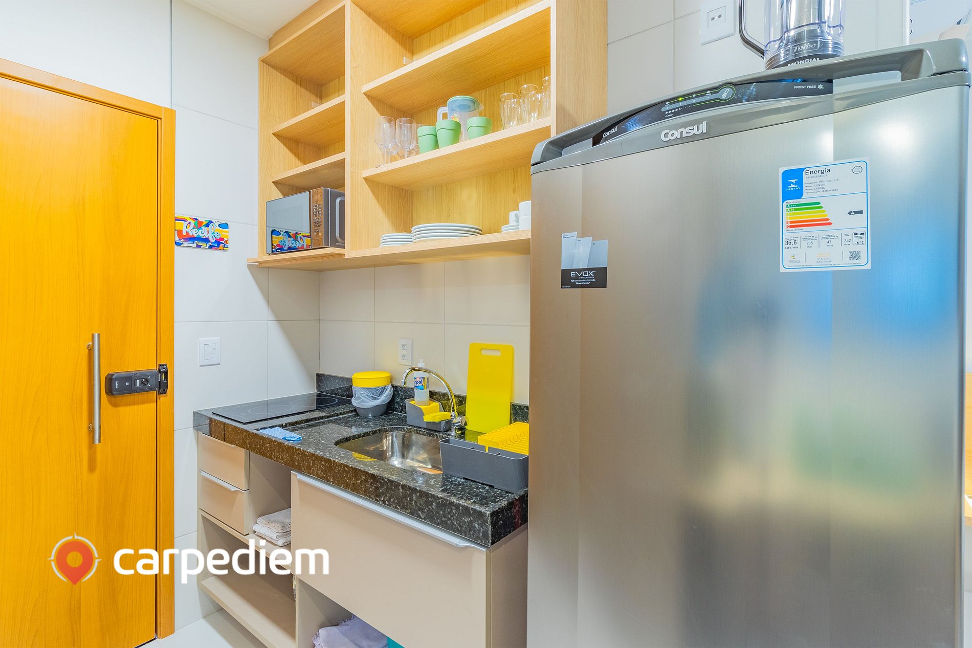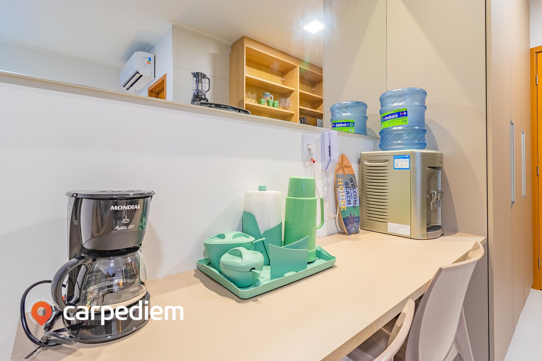 • Cozinha compacta e equipada: Estrutura completa para o dia a dia, com cooktop, geladeira, micro-ondas, máquina de café, liquidificador, torradeira e filtro de água, além de louças, talheres, panelas, pia, bancada e armários, ideal para preparar refeições com autonomia.