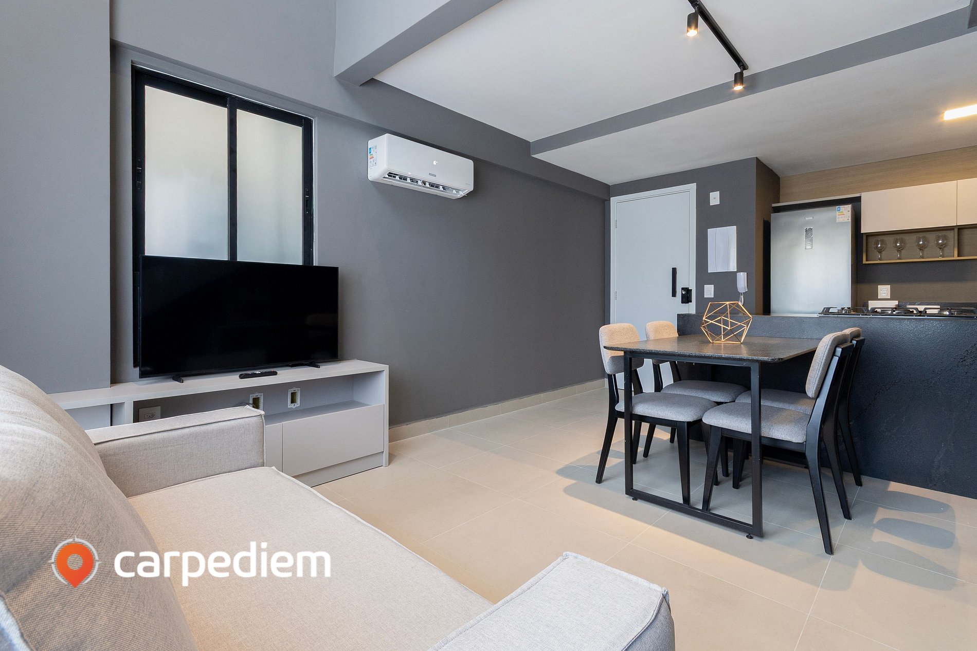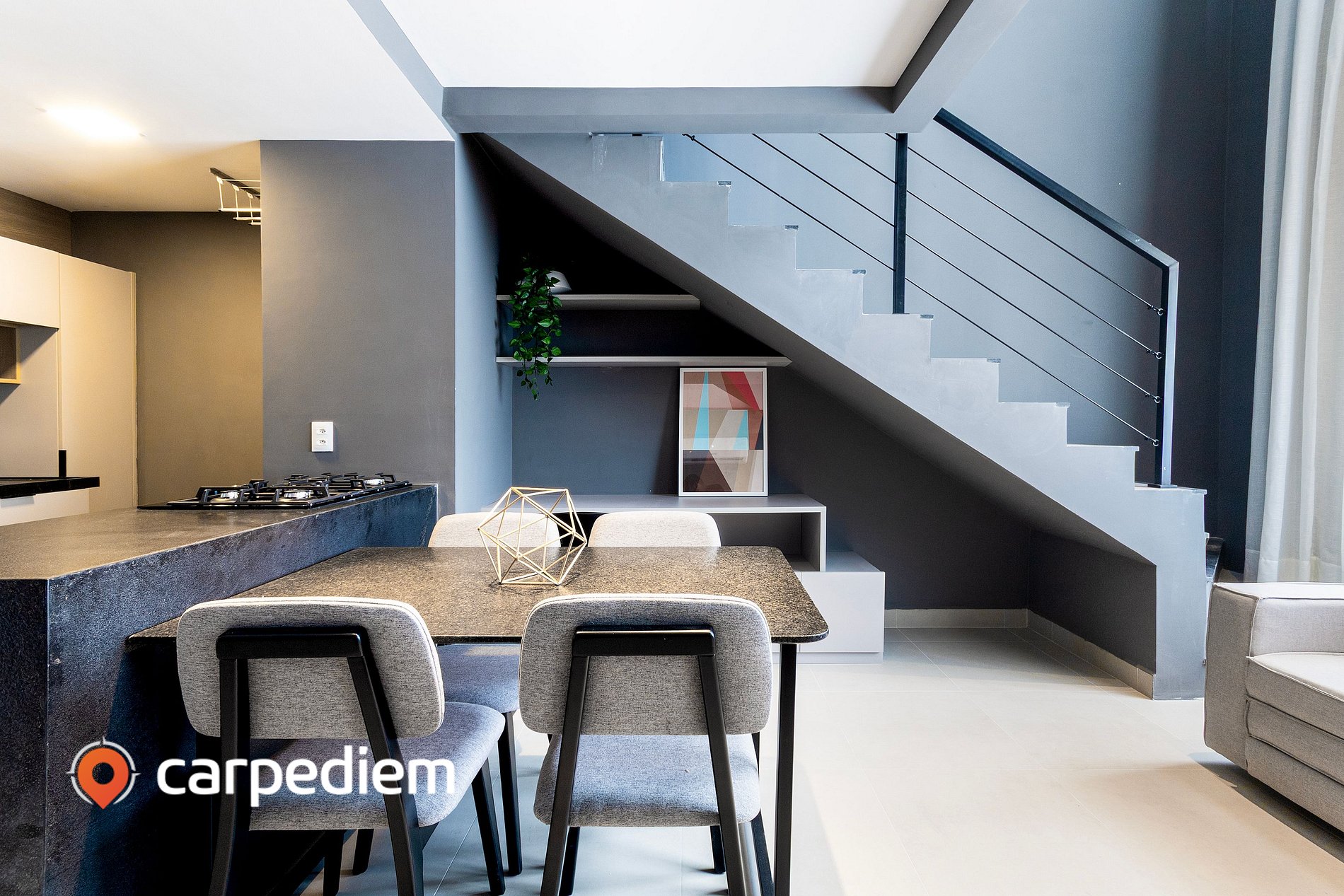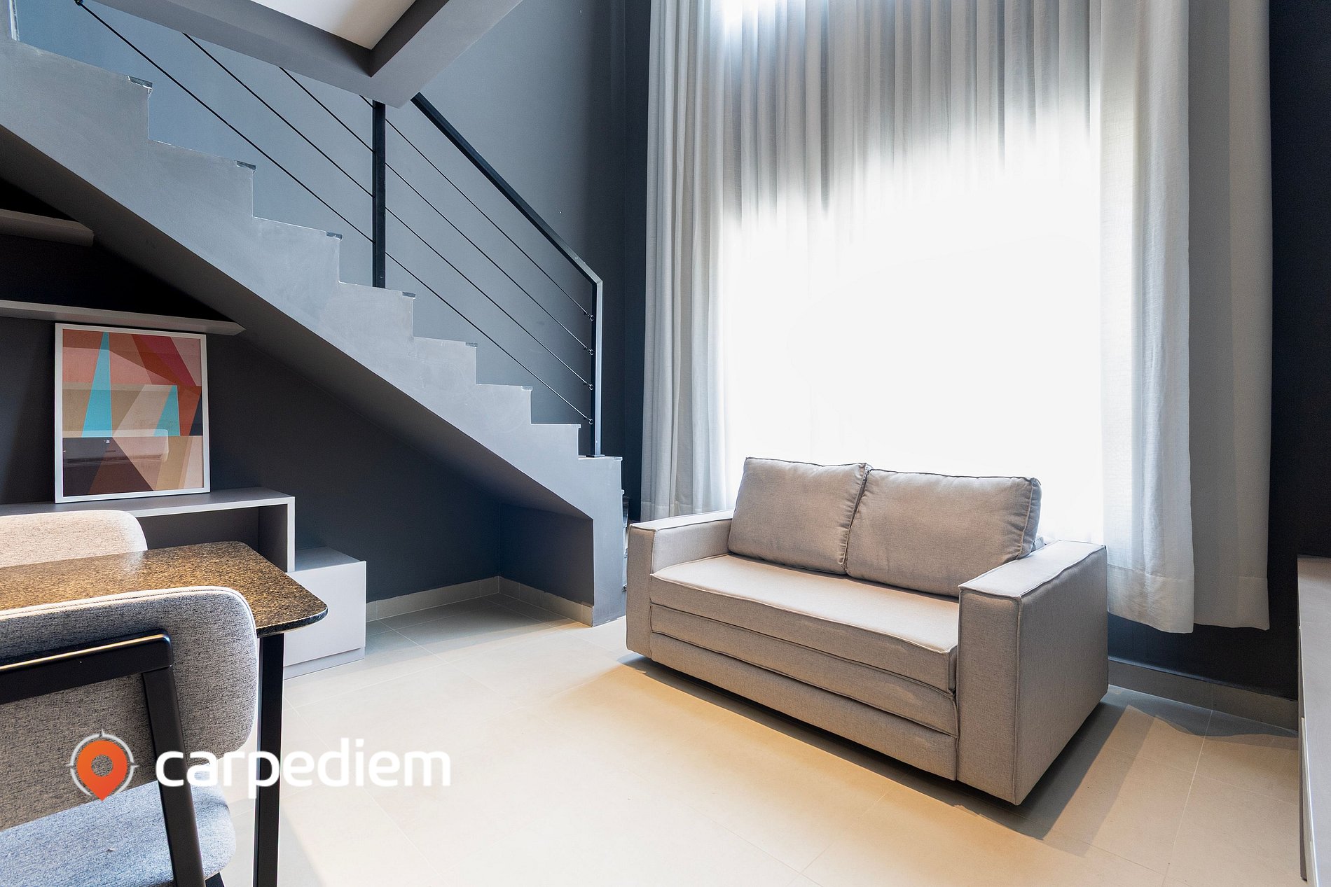• Sala de estar/jantar (piso inferior): espaço integrado, moderno e bem iluminado, com sofá-cama de casal, Smart TV, ar-condicionado e cortina blackout; a mesa de jantar com cadeiras complementa o ambiente, que também conta com uma charmosa estação de trabalho sob a escada, ideal para uso de notebook; em seus 43,25 m² bem distribuídos em dois pavimentos, o apartamento acomoda confortavelmente até 4 hóspedes, com Wi-Fi e interfone.