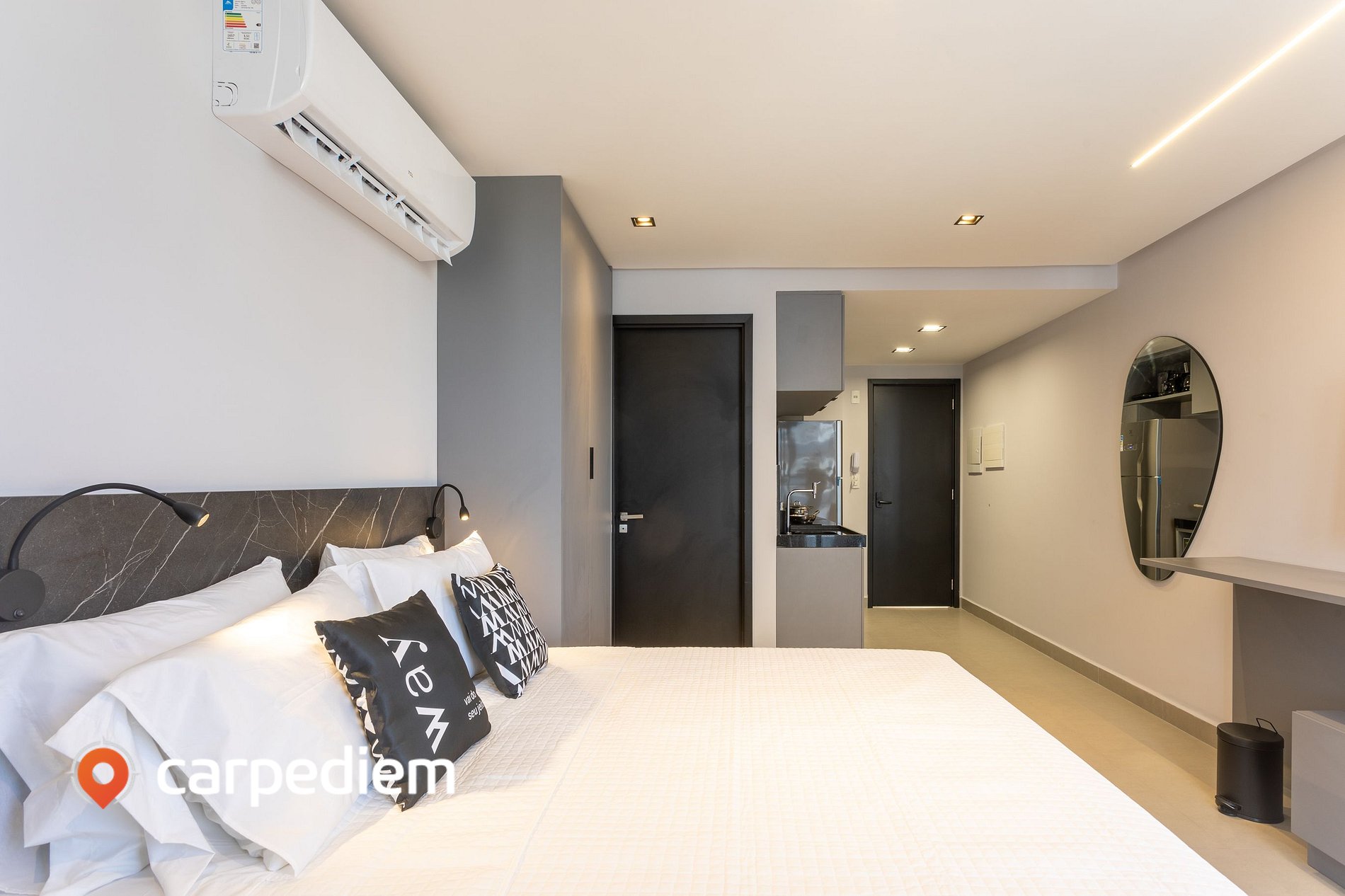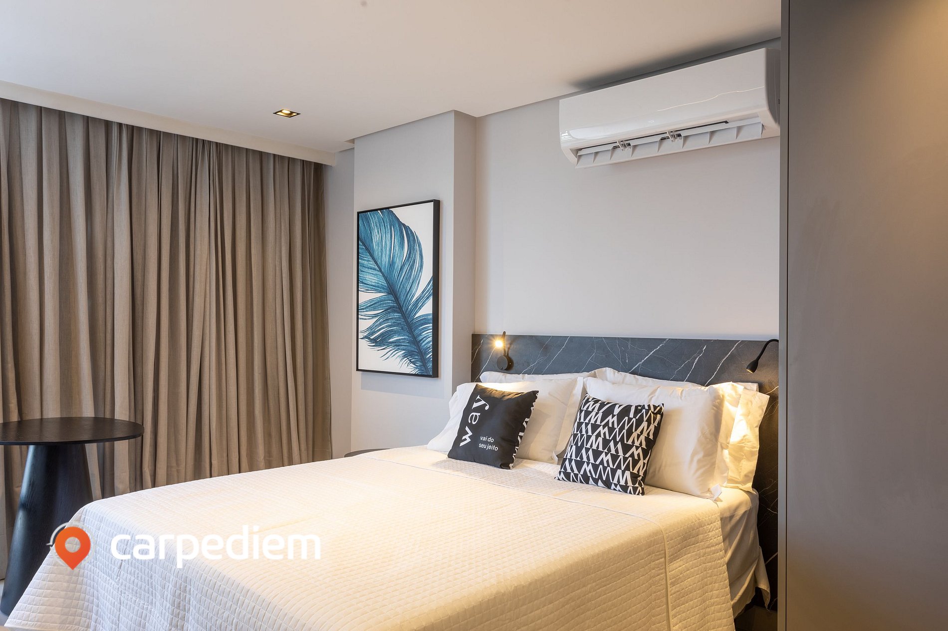 • O studio (acomoda até 3 hóspedes): O studio é compacto na medida certa, com um layout inteligente e aconchegante. A cama queen garante noites confortáveis e, para completar, a cama de solteiro acomoda o terceiro hóspede com conforto e praticidade. Um espaço que funciona muito bem para relaxar, trabalhar remoto e viver o dia a dia com leveza.