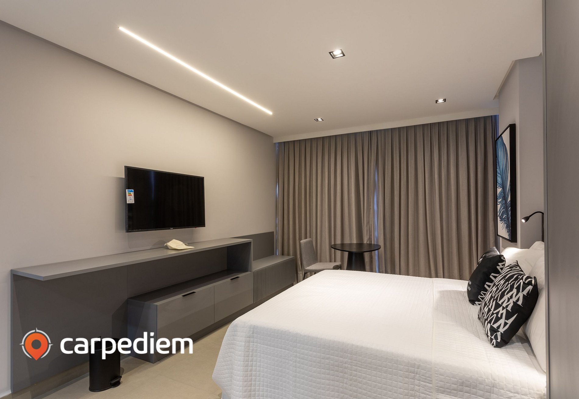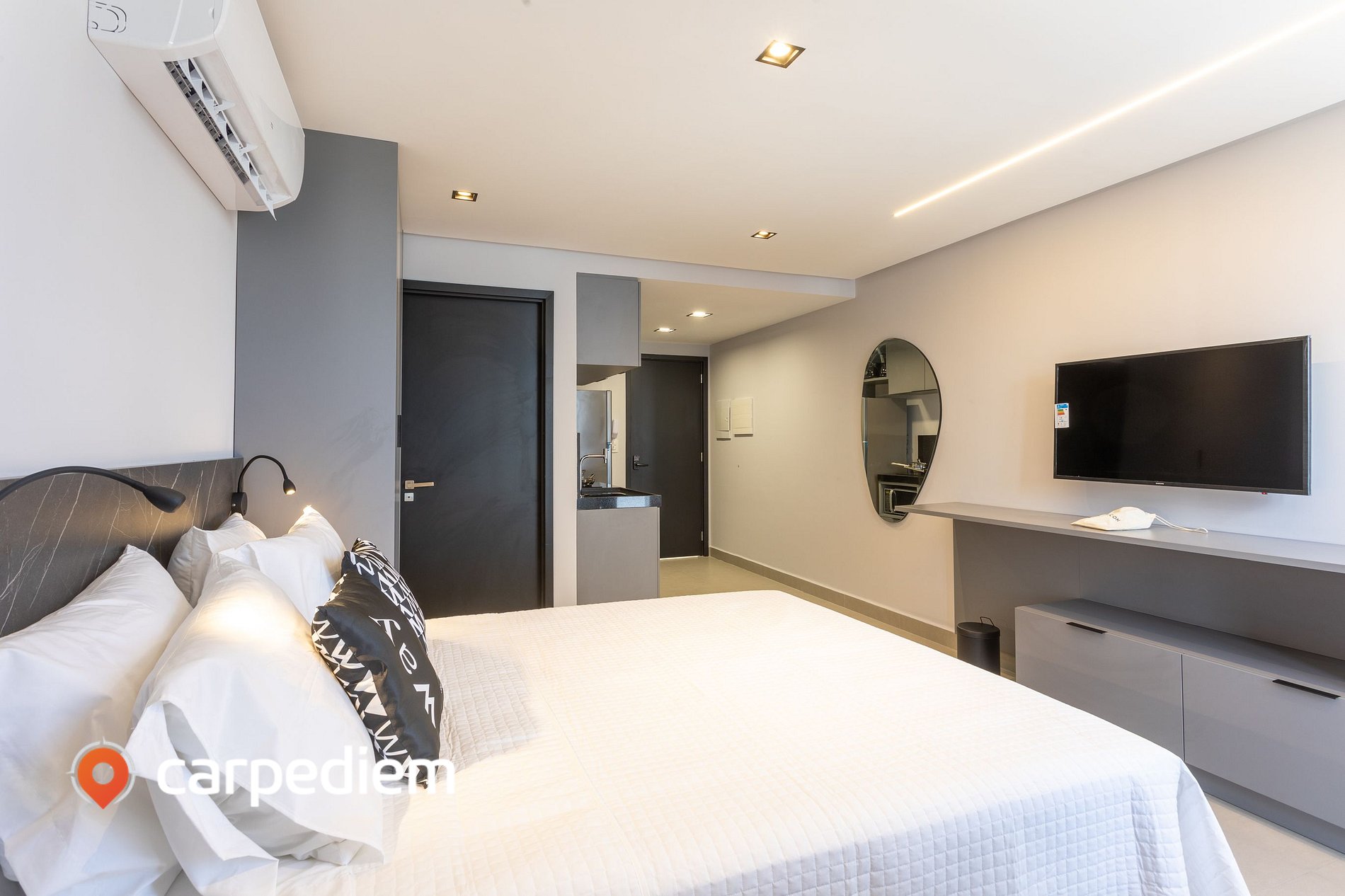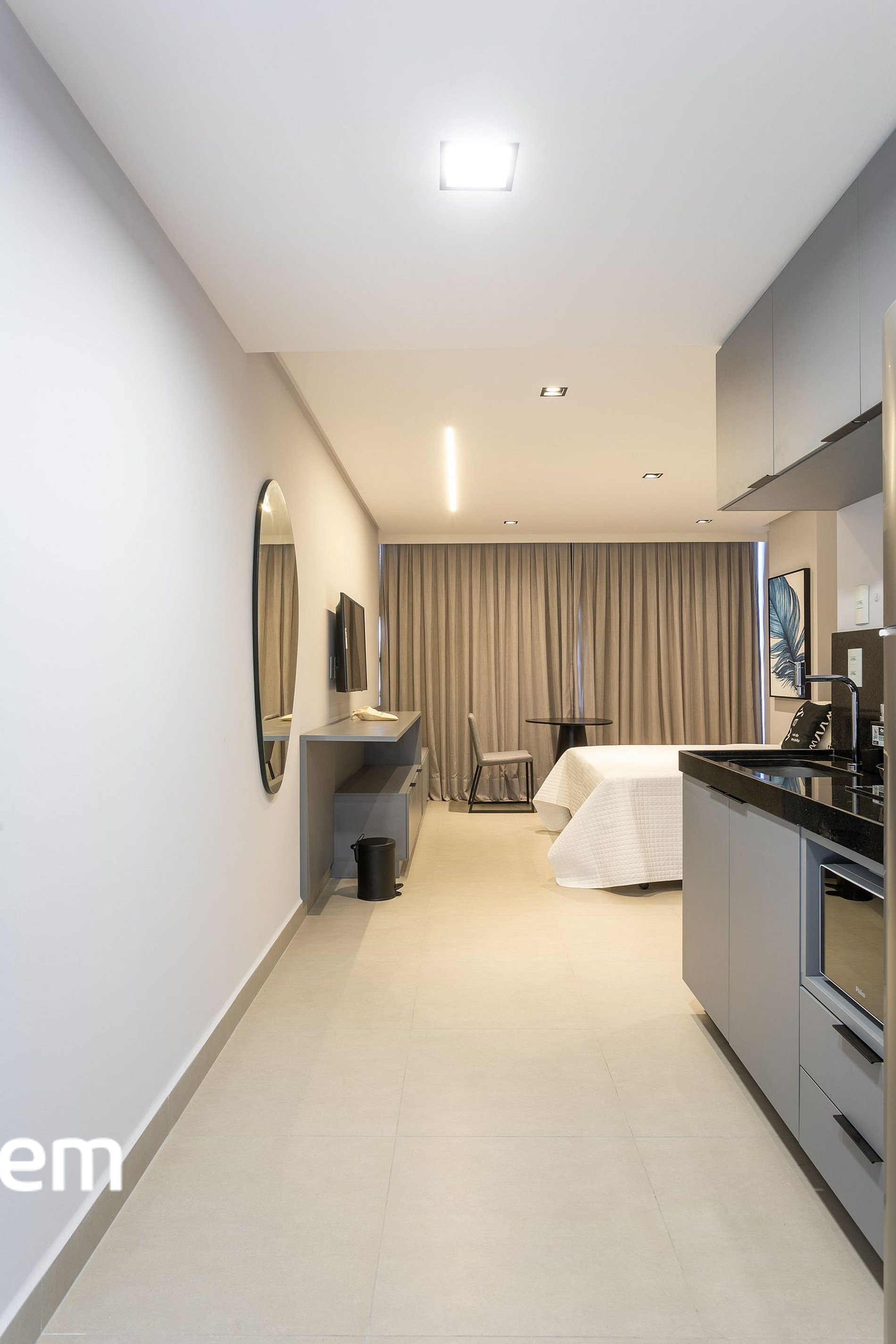 • O studio (acomoda até 3 hóspedes): O studio é compacto na medida certa, com um layout inteligente e aconchegante. A cama queen garante noites confortáveis e, para completar, a cama de solteiro acomoda o terceiro hóspede com conforto e praticidade. Um espaço que funciona muito bem para relaxar, trabalhar remoto e viver o dia a dia com leveza.