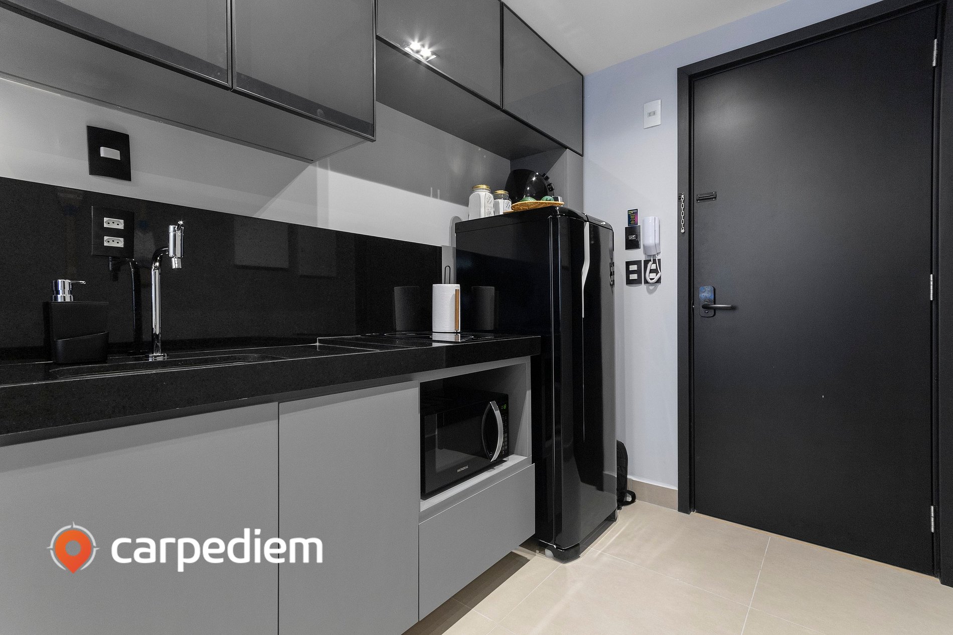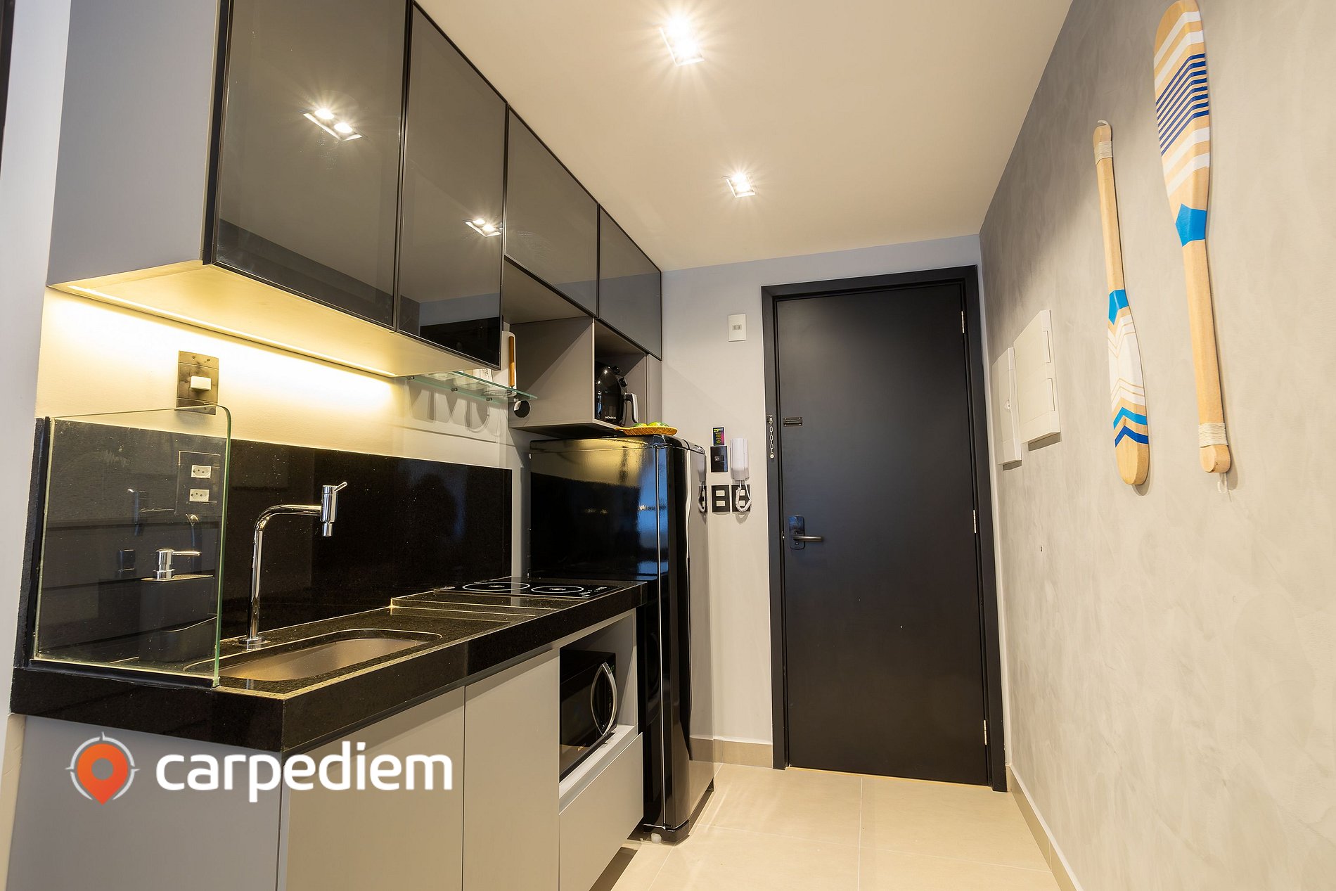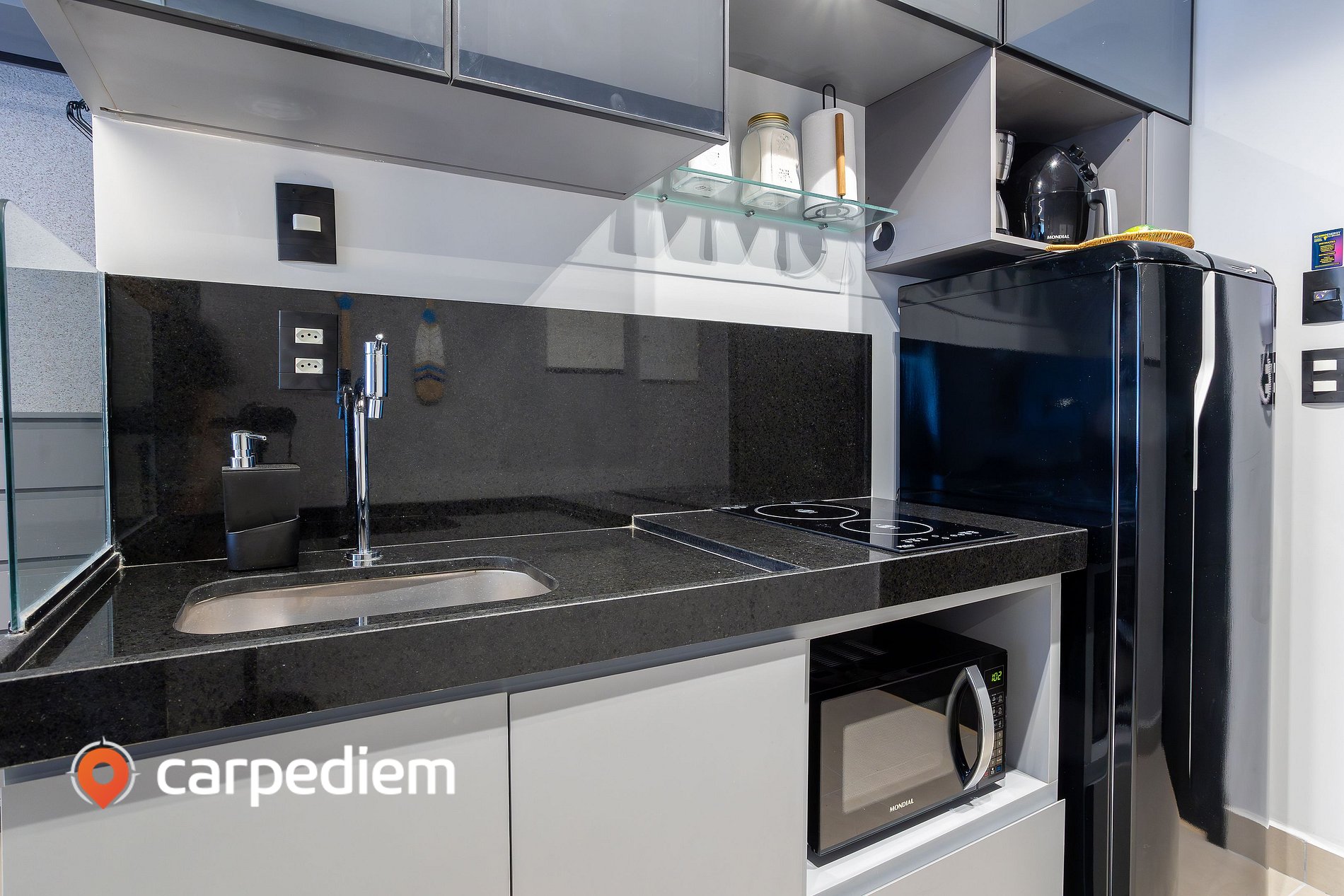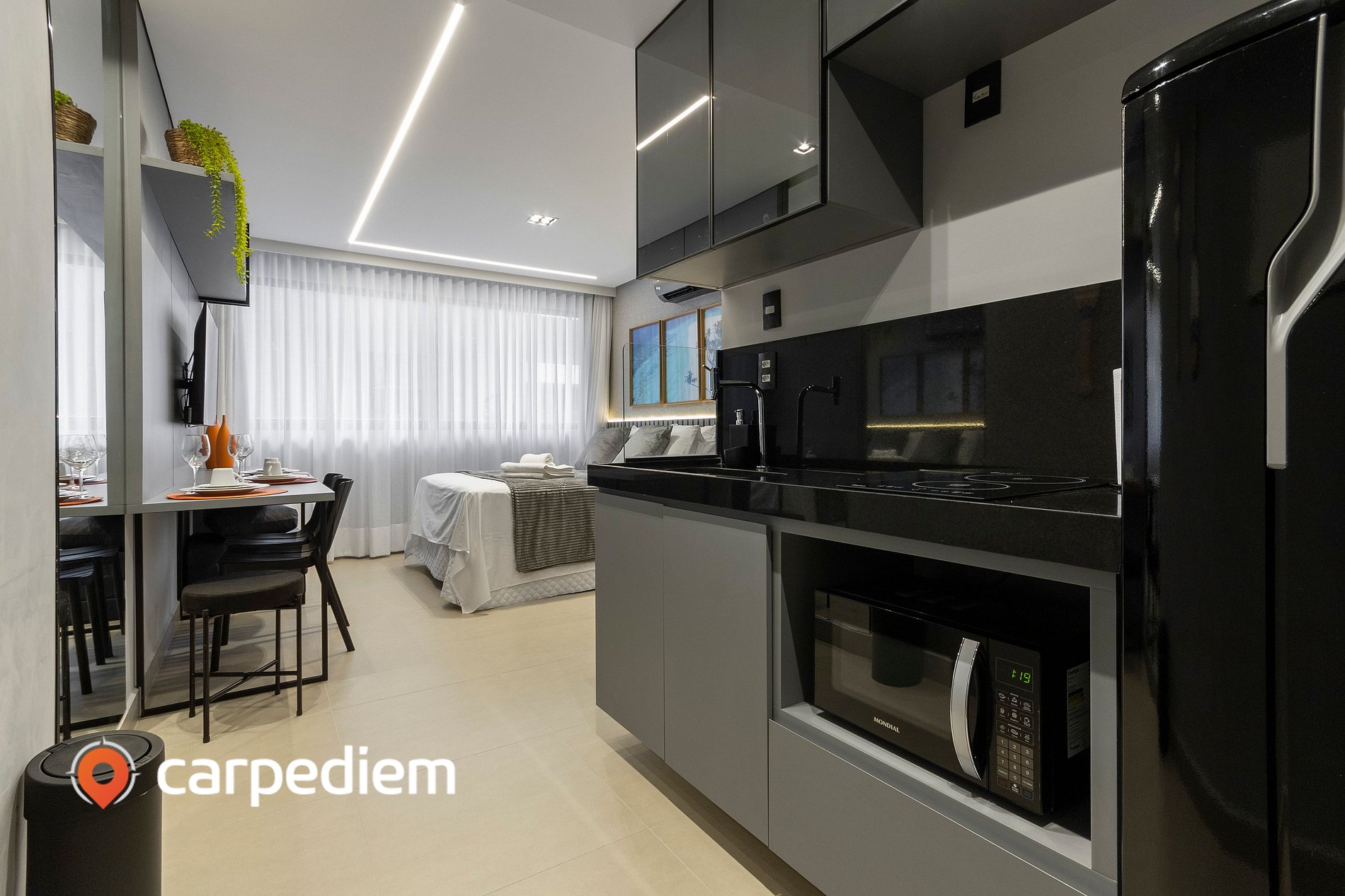 • Cozinha compacta equipada: fogão, geladeira, micro-ondas, liquidificador, máquina de café, além de louças e talheres e itens básicos para o dia a dia.