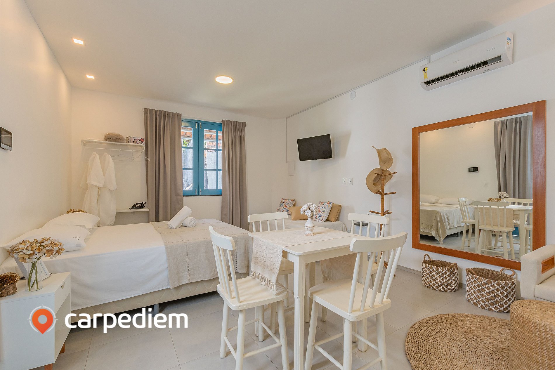 • Suíte acolhedora: A suíte de 24 m² é compacta, funcional e extremamente confortável. A cama queen garante noites tranquilas, o ar-condicionado traz frescor após um dia de sol, e a TV com Wi-Fi completa o ambiente para relaxar ou trabalhar com tranquilidade.