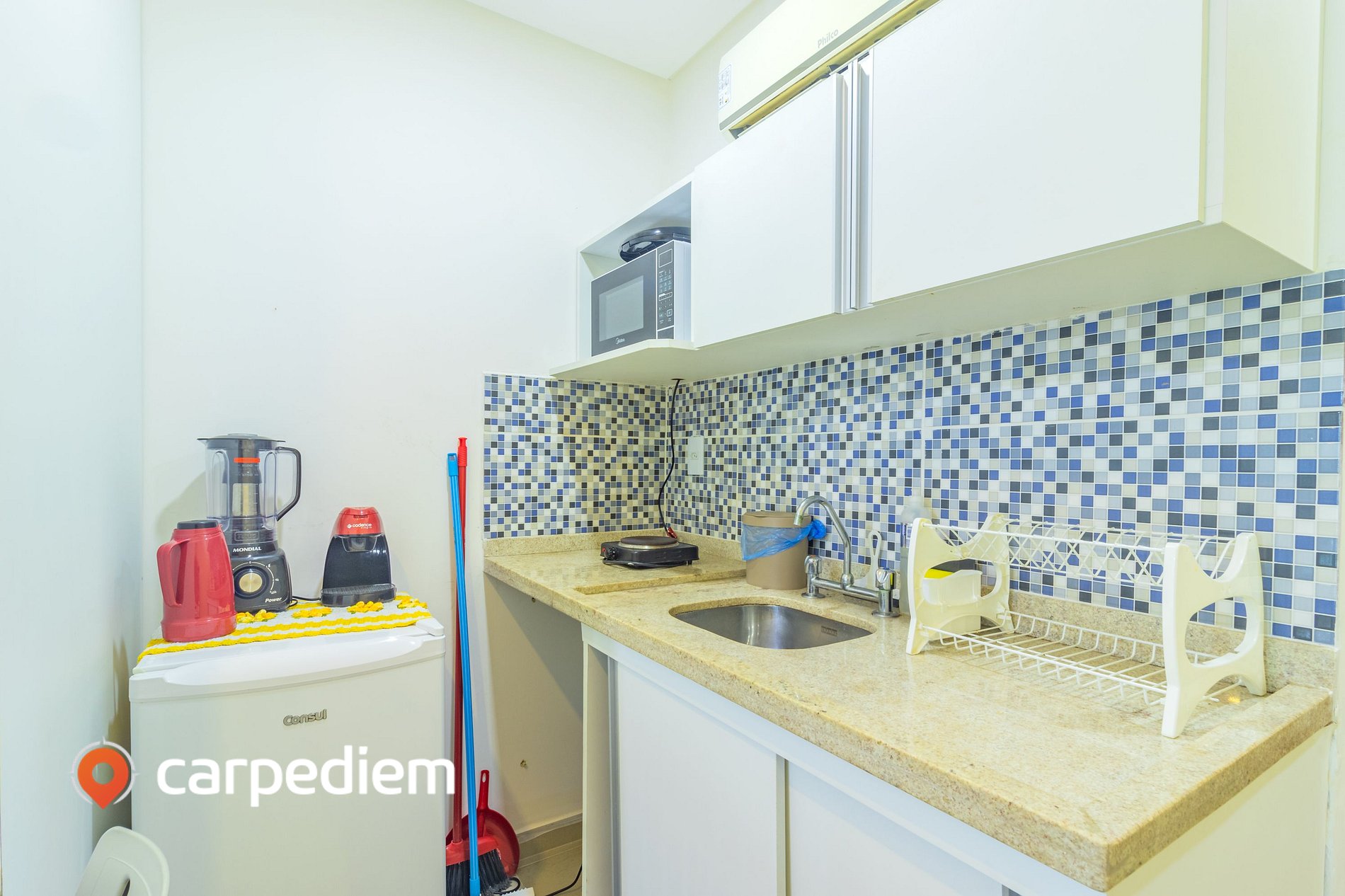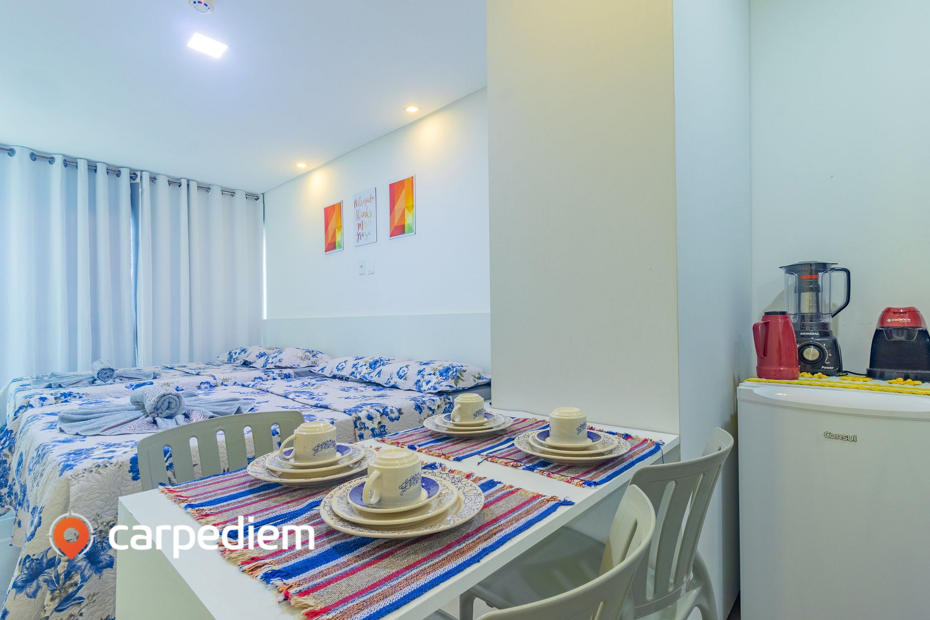 • Cozinha compacta totalmente equipada: ideal para preparar refeições com comodidade, contando com fogão, geladeira, micro-ondas, liquidificador, torradeira, máquina de café, mesa de jantar, louças, talheres e itens básicos de cozinha.