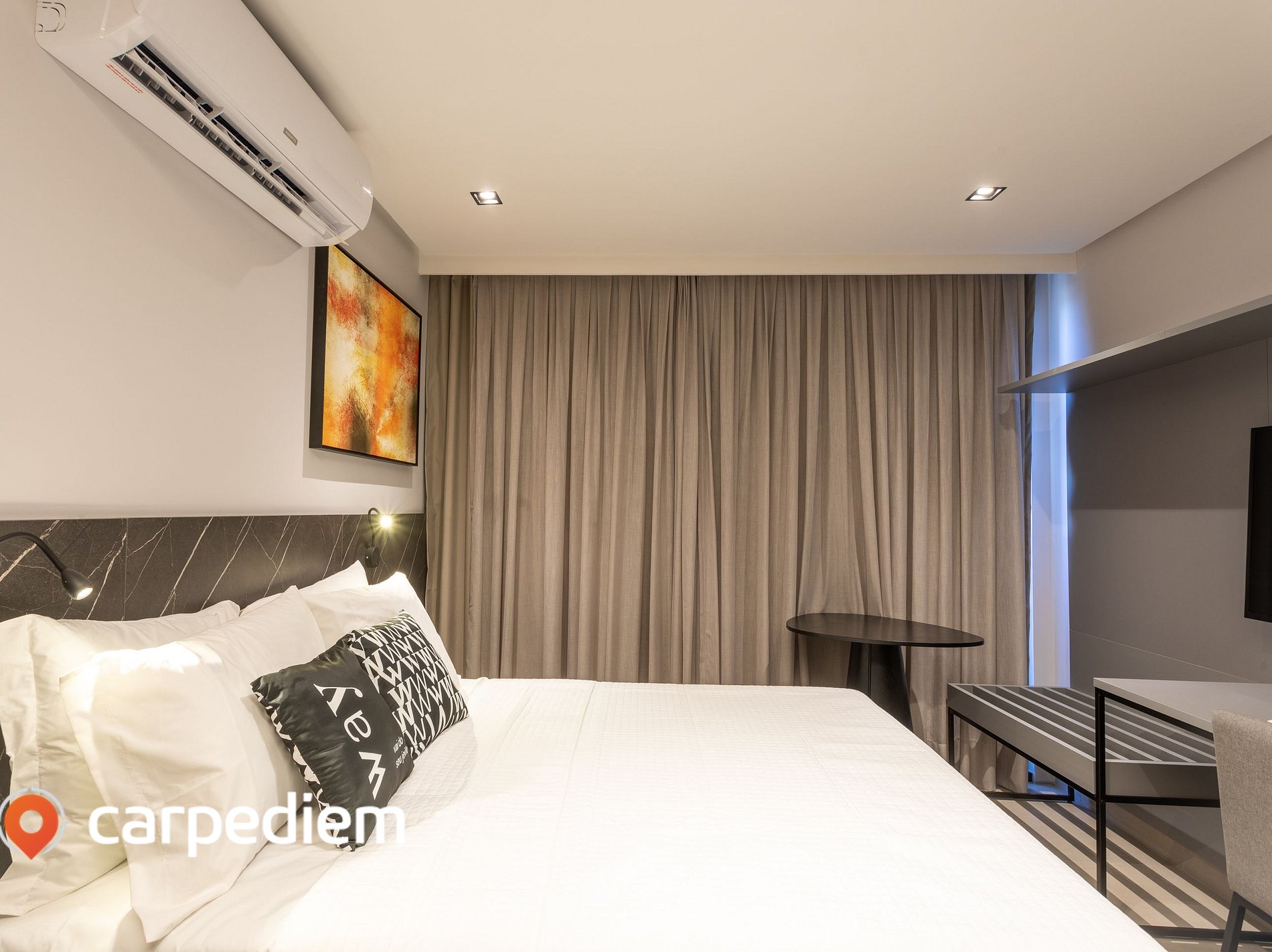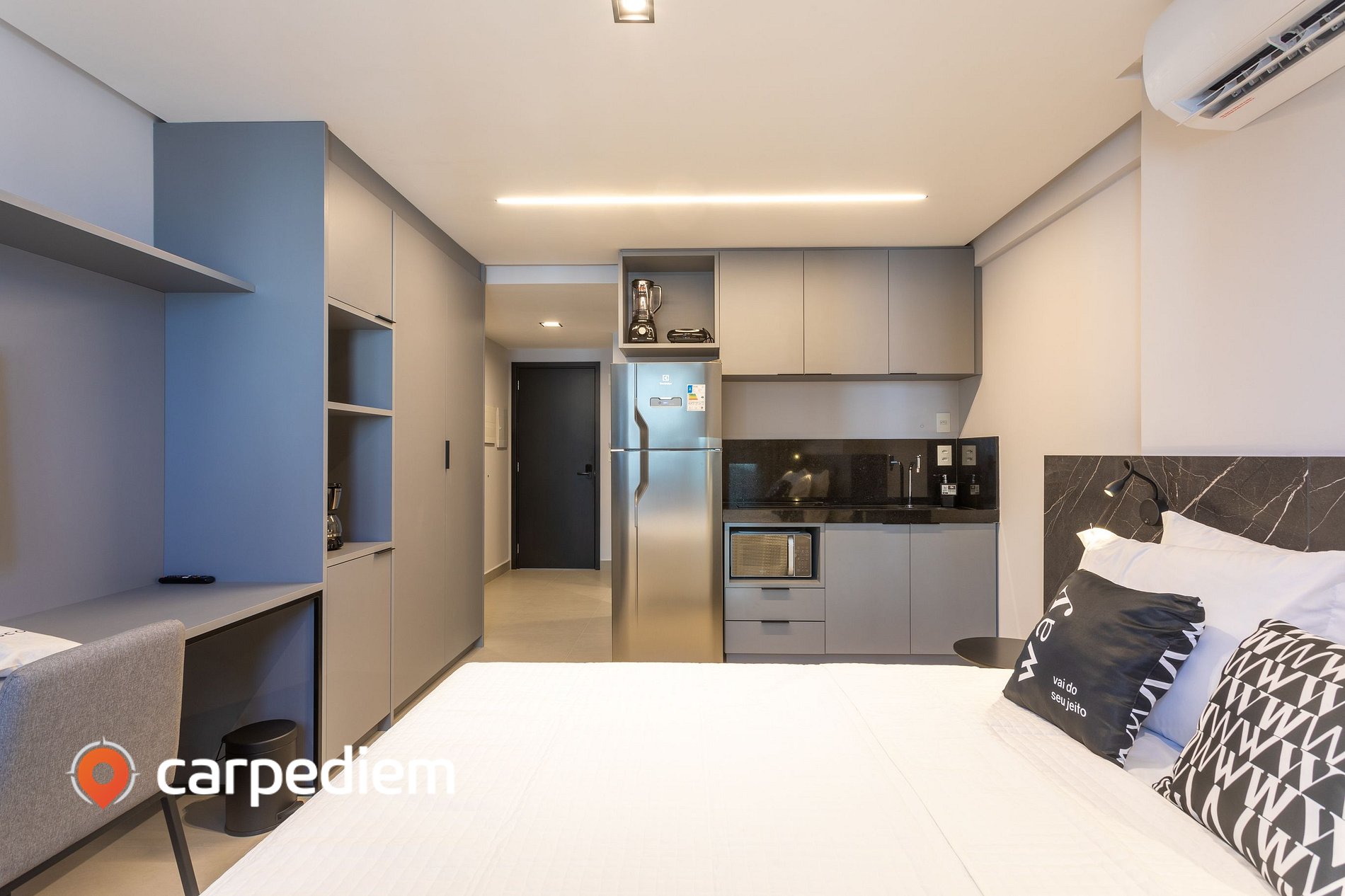 • Organização e praticidade: armários, cabides, roupas de cama e espaço pensado para manter o studio funcional durante toda a estada.