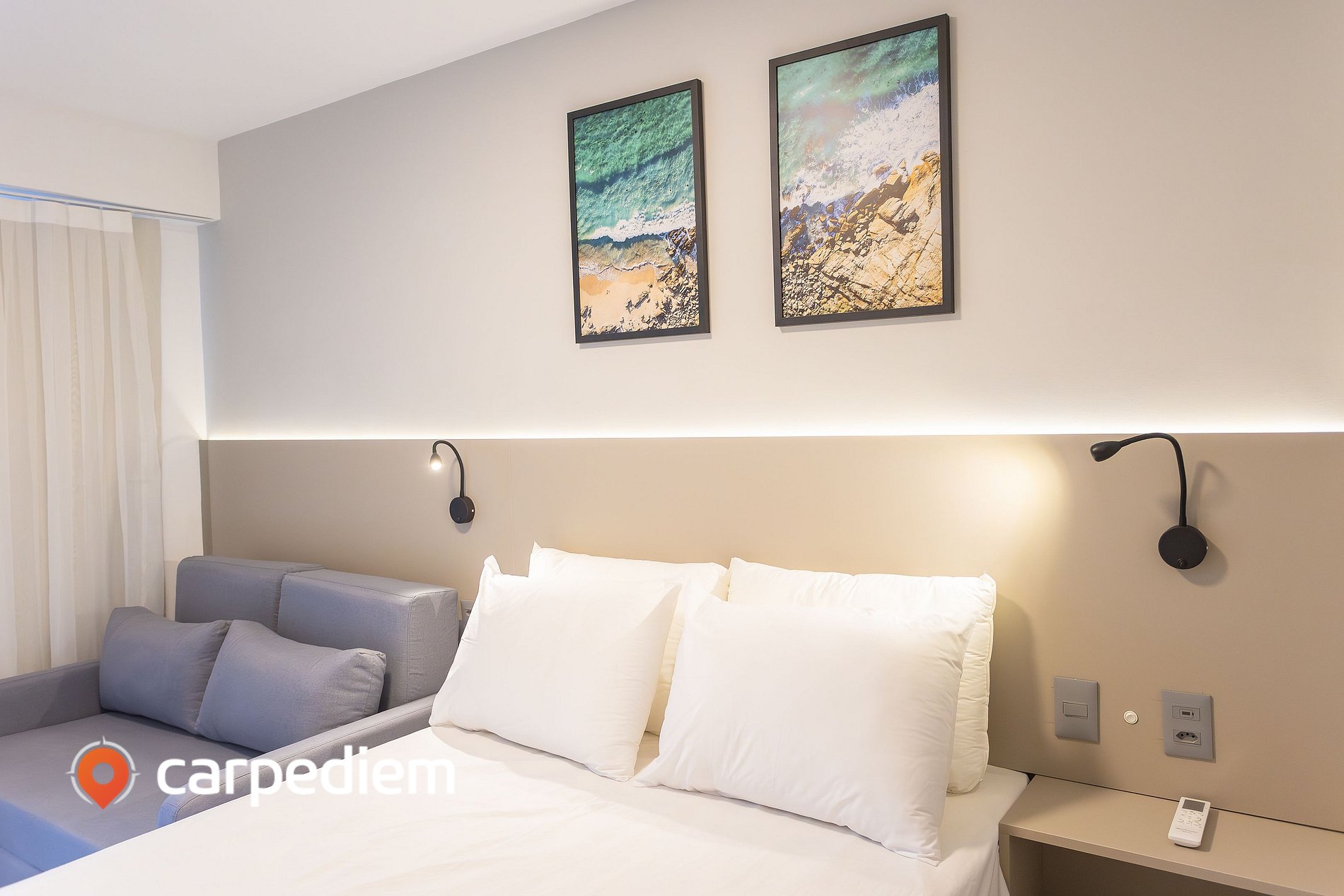 • Com 23 m², o espaço foi cuidadosamente distribuído para acomodar até 4 hóspedes com 1 cama de casal e 1 sofá-cama casal, ar-condicionado, Wi-Fi e TV, roupas de cama inclusas, cortinas blackout, luz de leitura e tomadas próximas à cama para maior comodidade, entretenimento e praticidade durante toda a estadia.