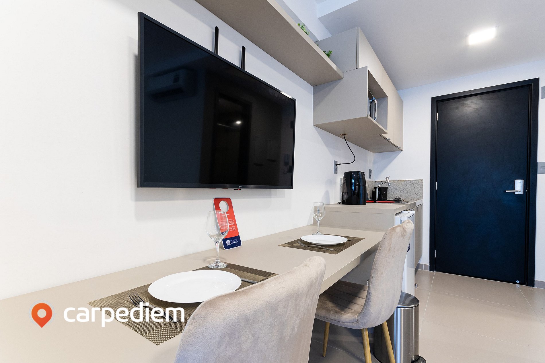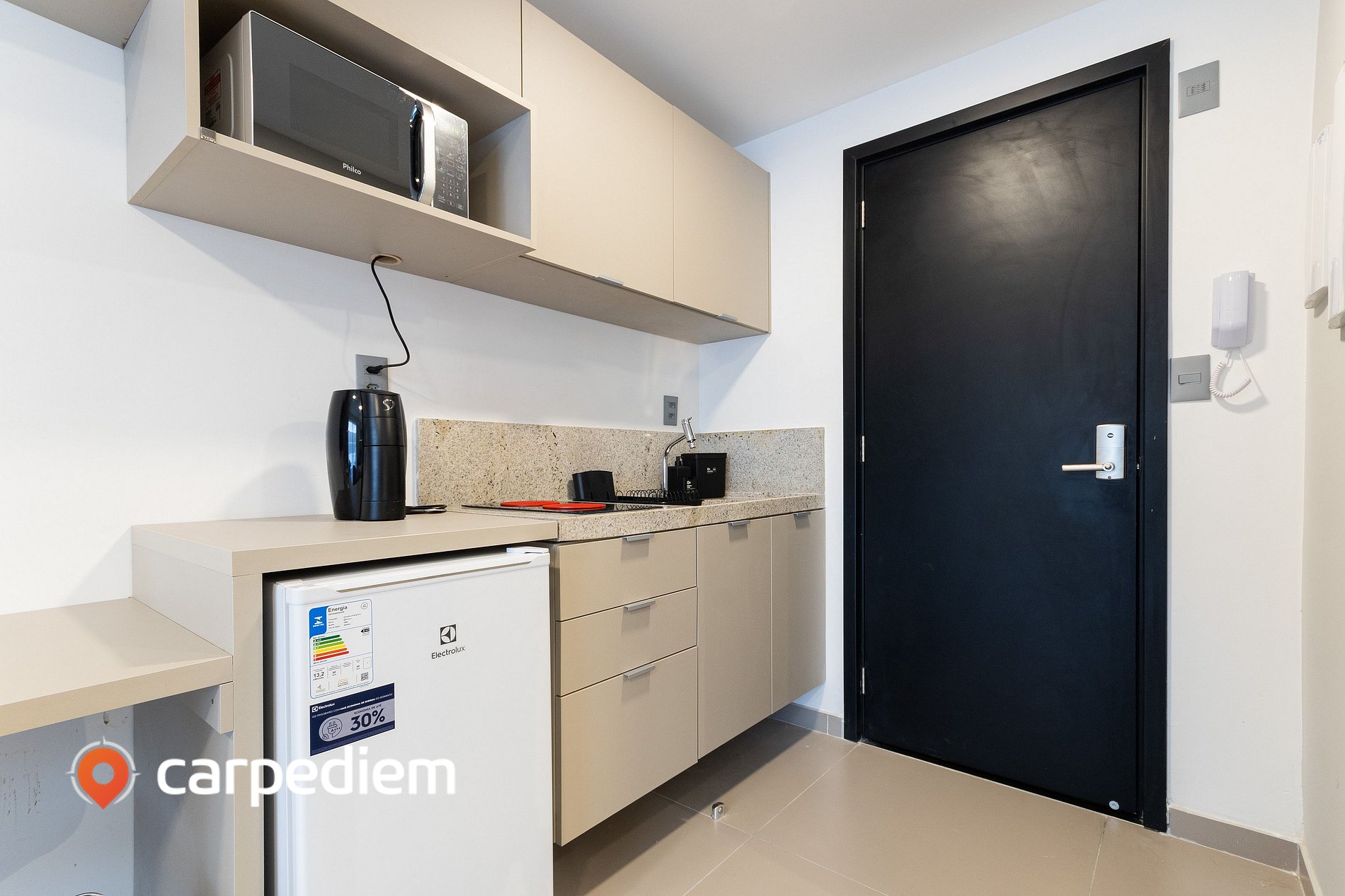 • Cozinha compacta e equipada: equipada com cooktop, frigobar, micro-ondas, máquina de café, liquidificador, armários, além de panelas, louças e talheres, facilitando a preparação de refeições durante a estada.