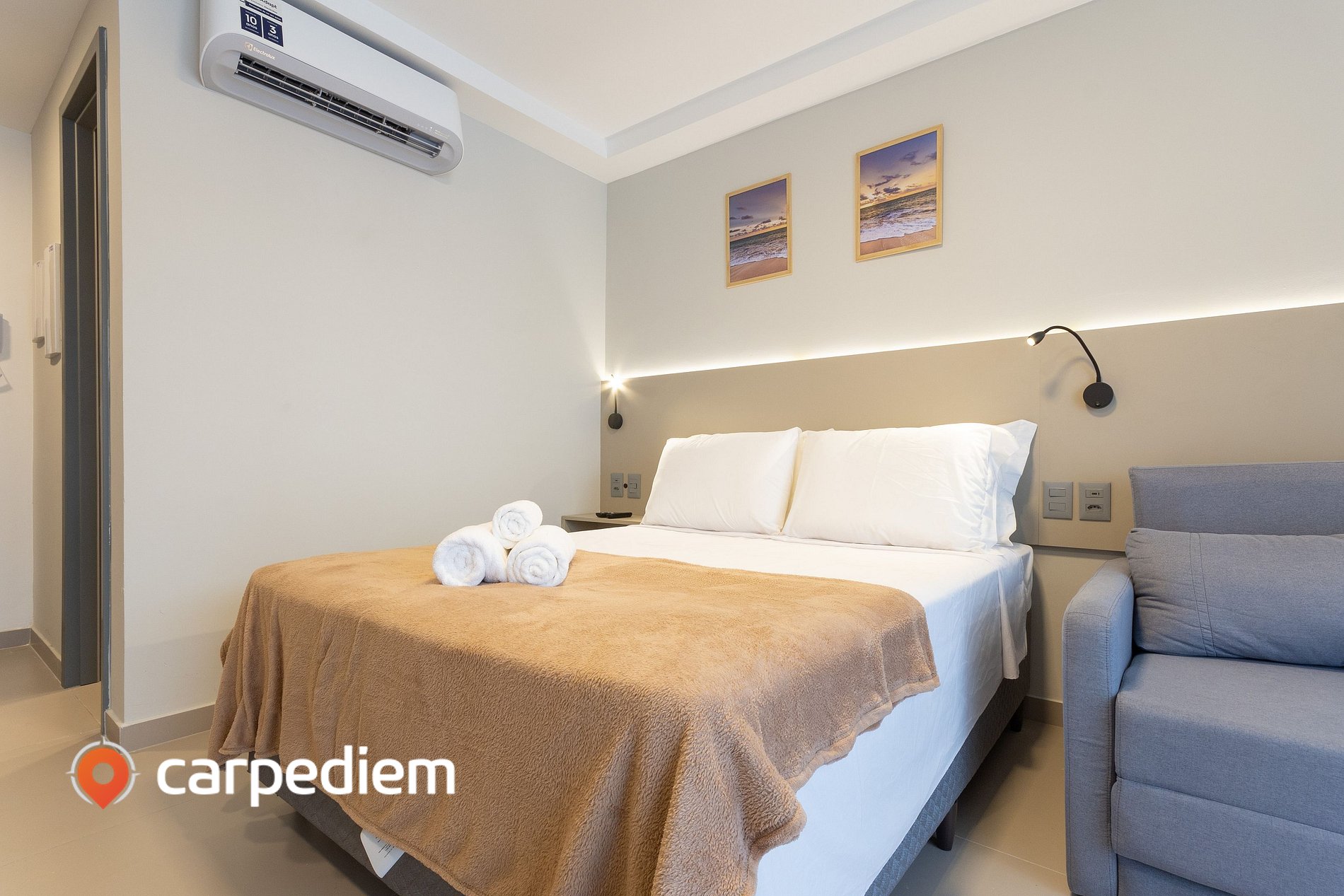 • Studio integrado e amplo: espaço bem distribuído que acomoda até 4 hóspedes, com cama casal queen e sofá-cama, ar-condicionado, Smart TV, cortina com blackout, guarda-roupa espaçoso, mesa de cabeceira com tomada ao lado da cama e luz de leitura, garantindo conforto tanto para descanso quanto para estadias mais longas.