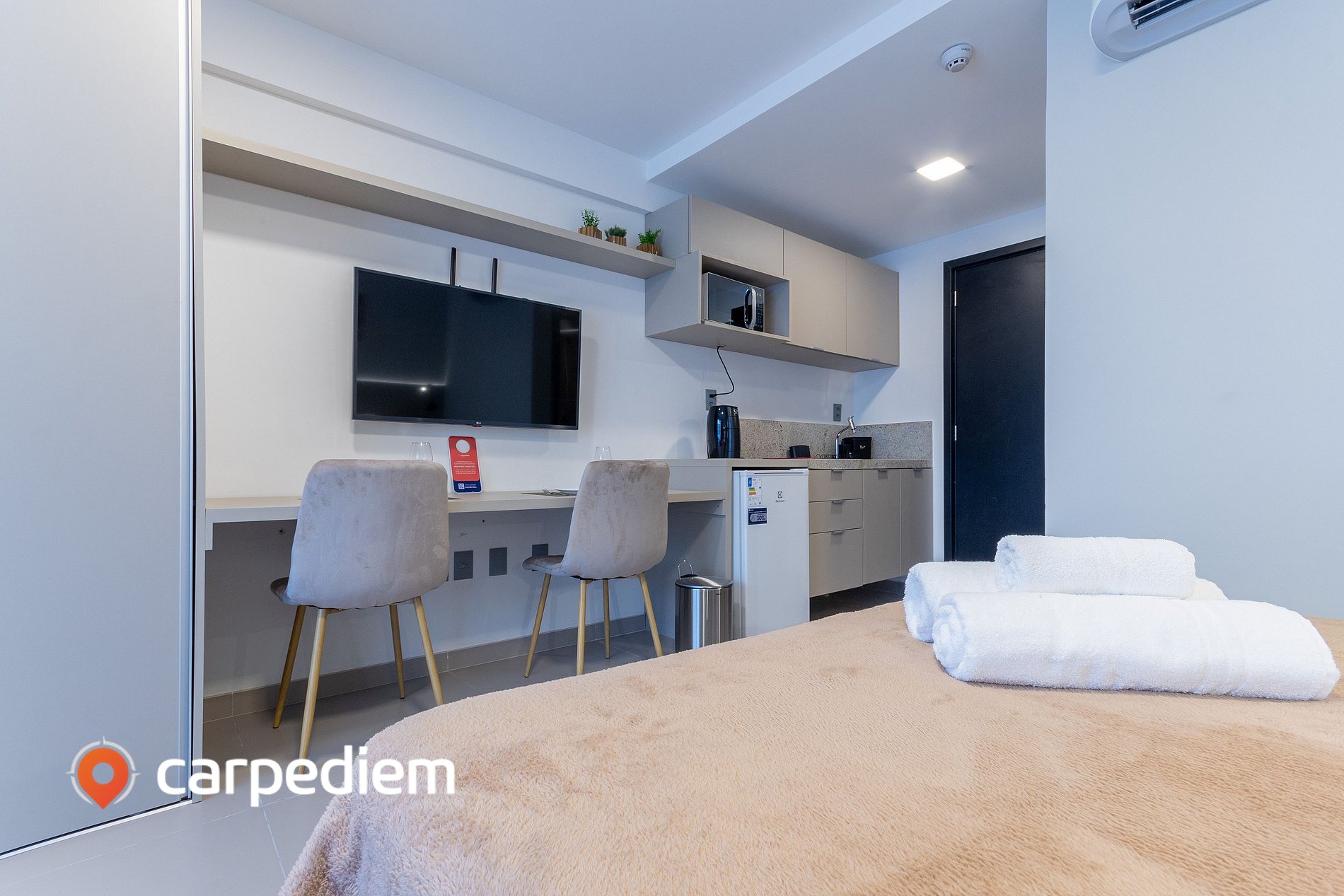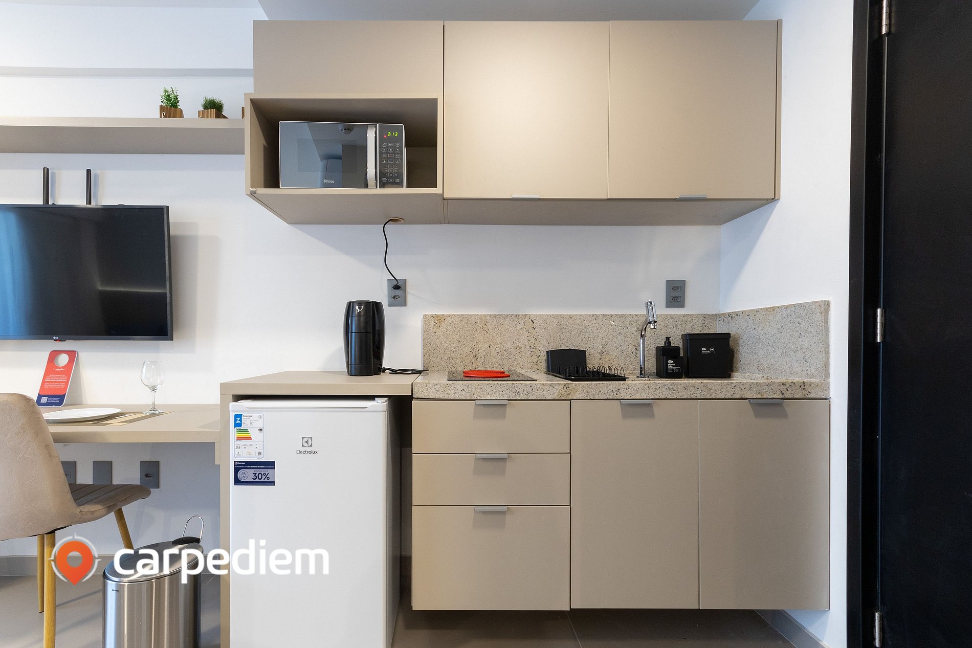 • Cozinha compacta e equipada: equipada com cooktop, frigobar, micro-ondas, máquina de café, liquidificador, armários, além de panelas, louças e talheres, facilitando a preparação de refeições durante a estada.
