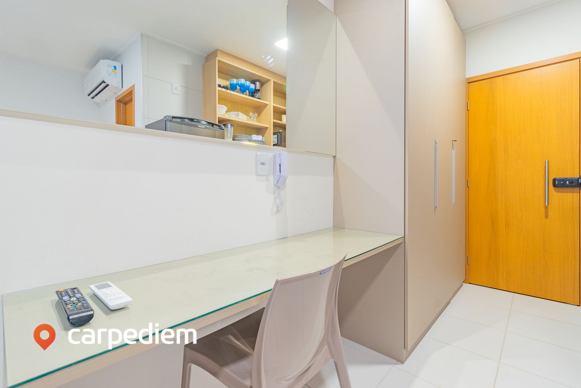 • Cozinha compacta e equipada, com fogão, geladeira, micro-ondas, airfryer, liquidificador, torradeira, louças, talheres e itens básicos de cozinha