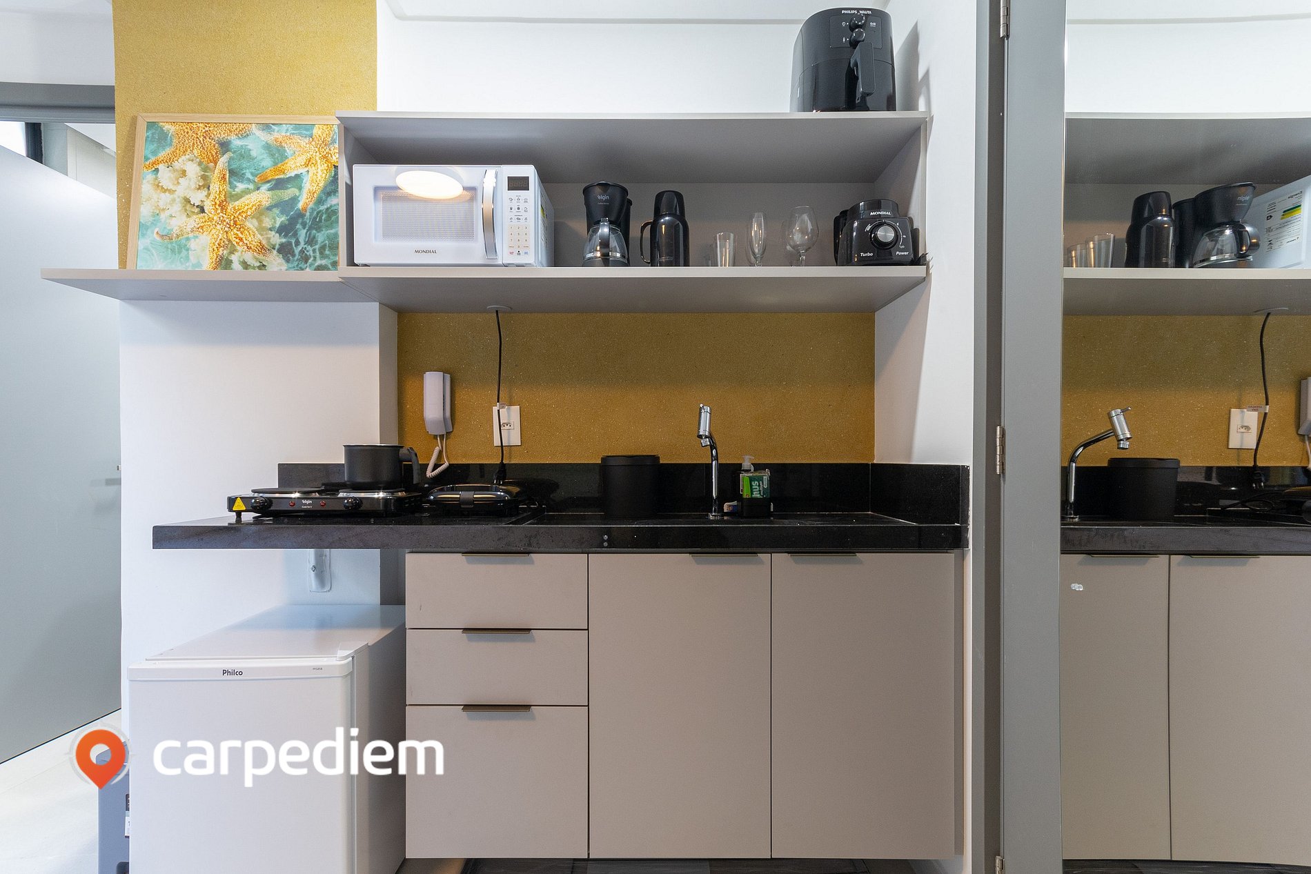 • Cozinha compacta e equipada: completa para o dia a dia, com cooktop, frigobar, micro-ondas, airfryer, liquidificador, máquina de café, garrafa térmica, torradeira, além de panelas, louças e talheres.