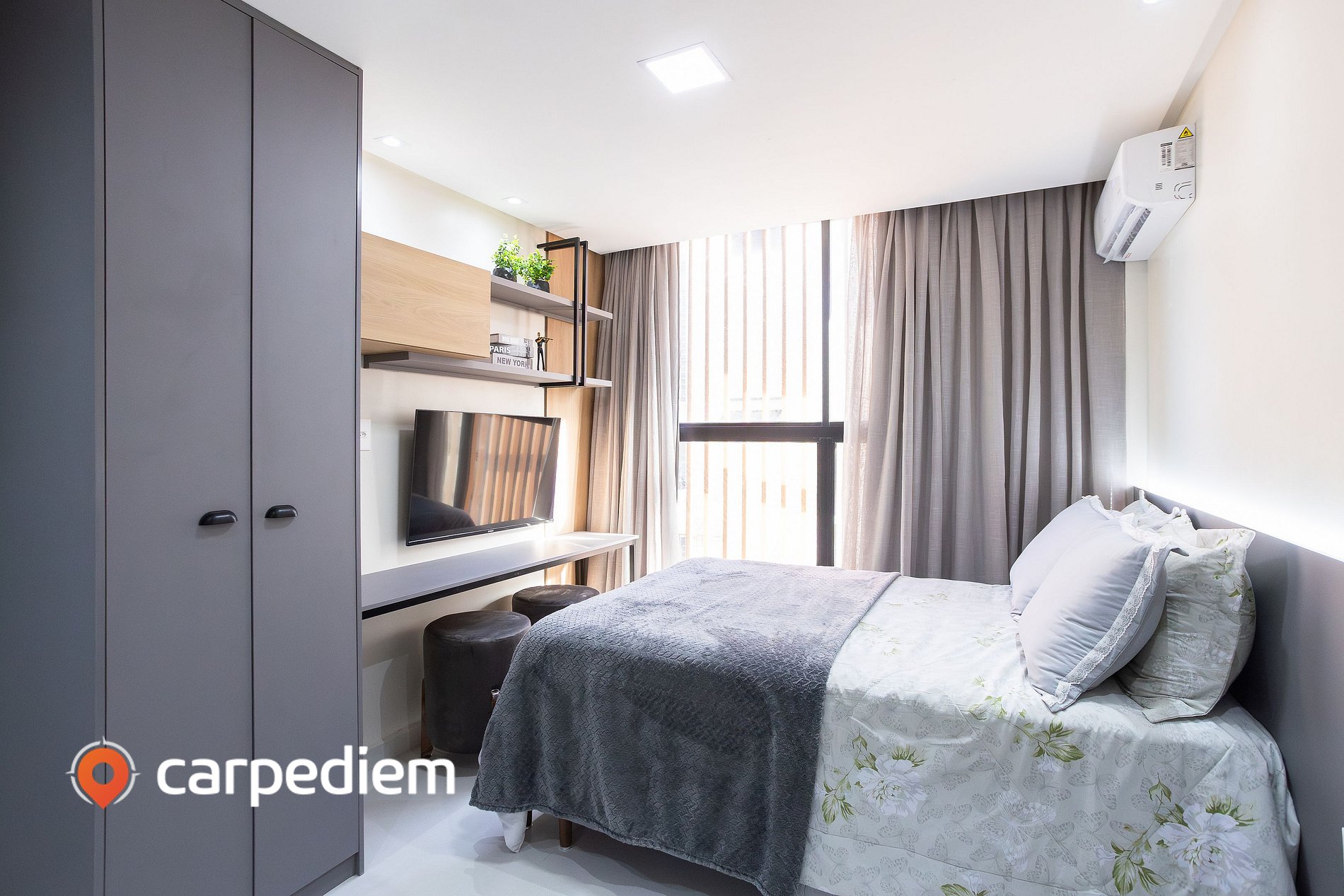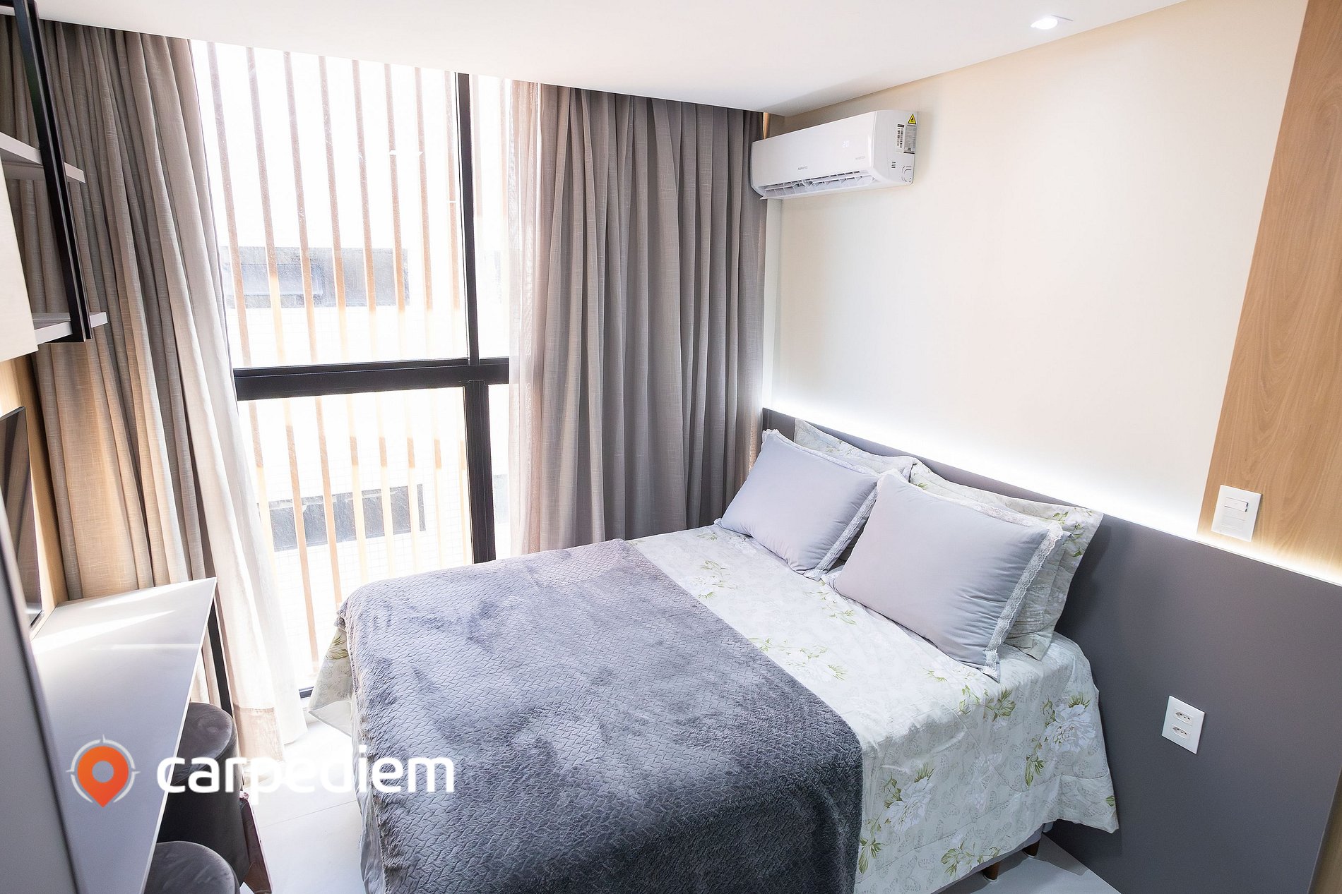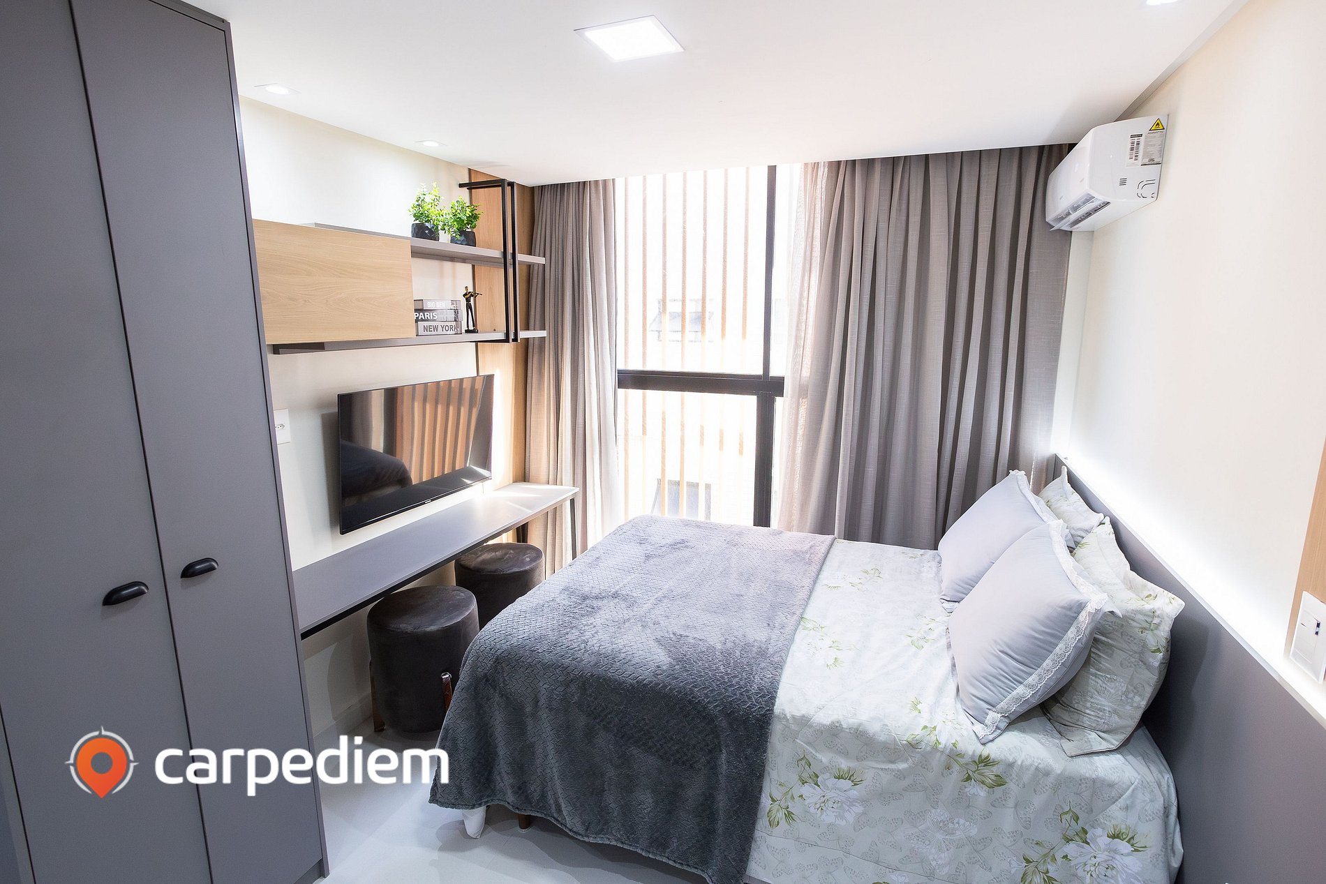 • Conforto e praticidade: ar-condicionado, Smart TV, cortina com blackout e tomadas ao lado da cama, pensadas para o dia a dia.