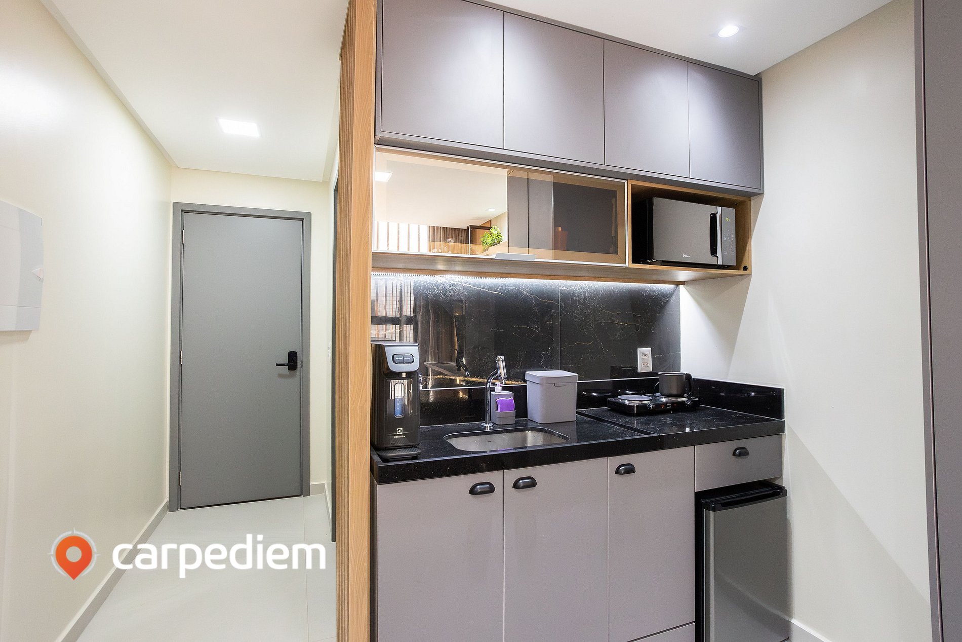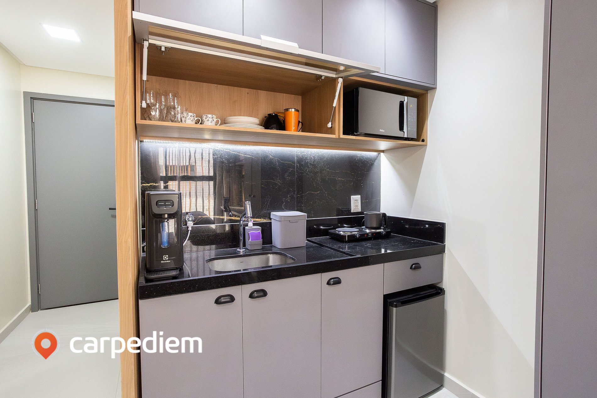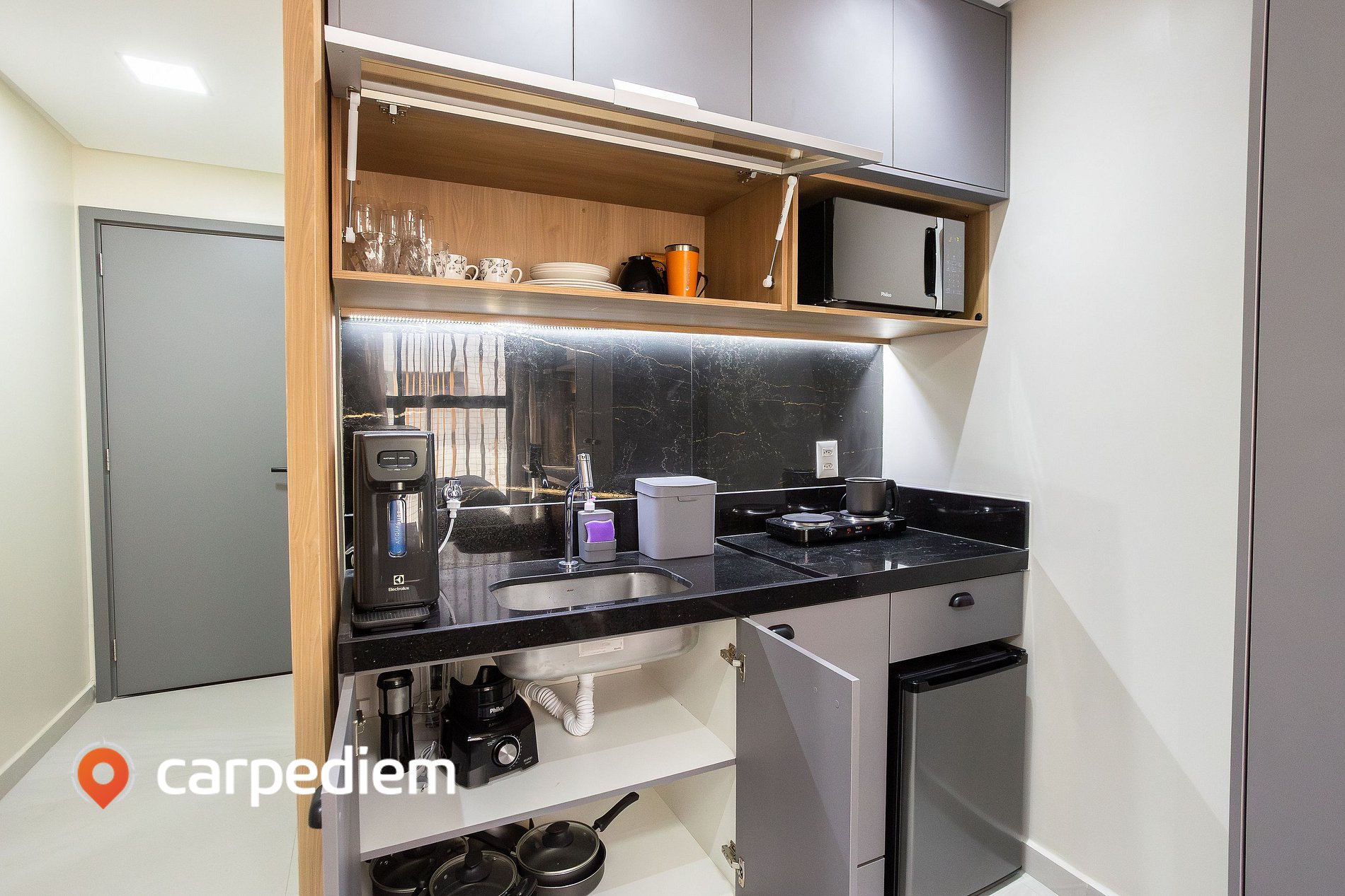• Cozinha compacta e equipada: armários planejados, cooktop, frigobar, micro-ondas, gelágua, liquidificador, máquina de café, além de panelas, louças e talheres.
