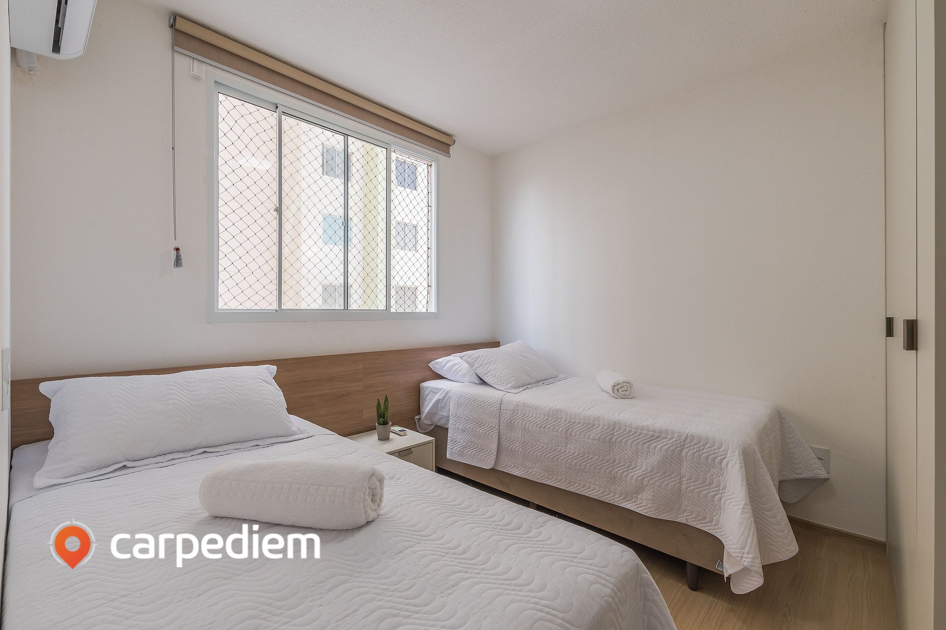 • Suíte 1 ideal para descanso em família: equipada com 2 camas de solteiro e 1 cama auxiliar, ar-condicionado, cortina, mesa de cabeceira, espelho e armário, oferecendo conforto, organização e mais privacidade durante a estadia.
