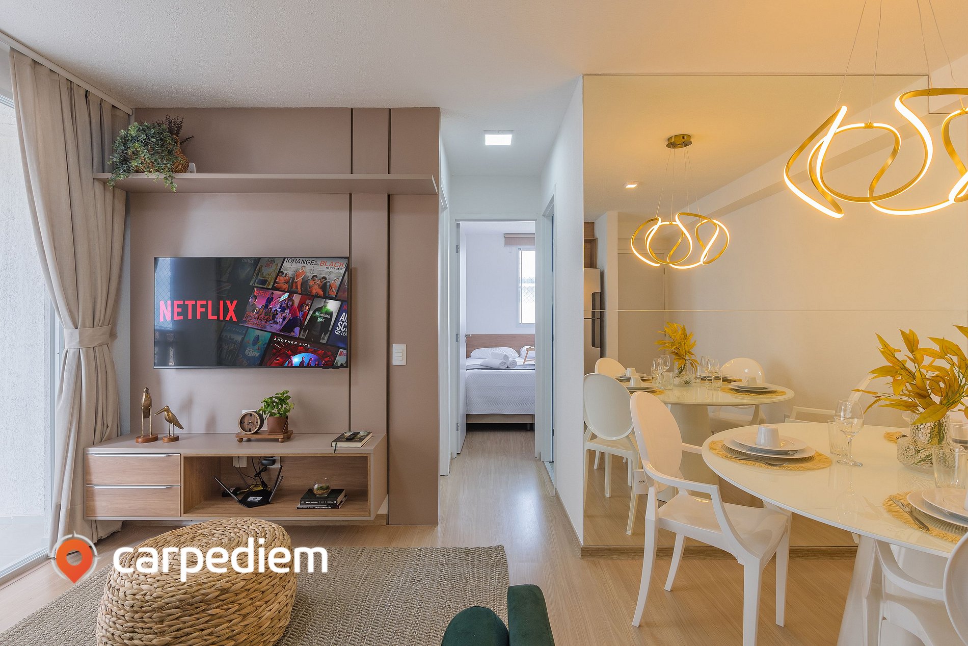 • Sala de estar funcional e acolhedora: ambiente perfeito para relaxar, com sofá-cama, Smart TV, espelho e mesa de jantar com 4 cadeiras para refeições e momentos em grupo.