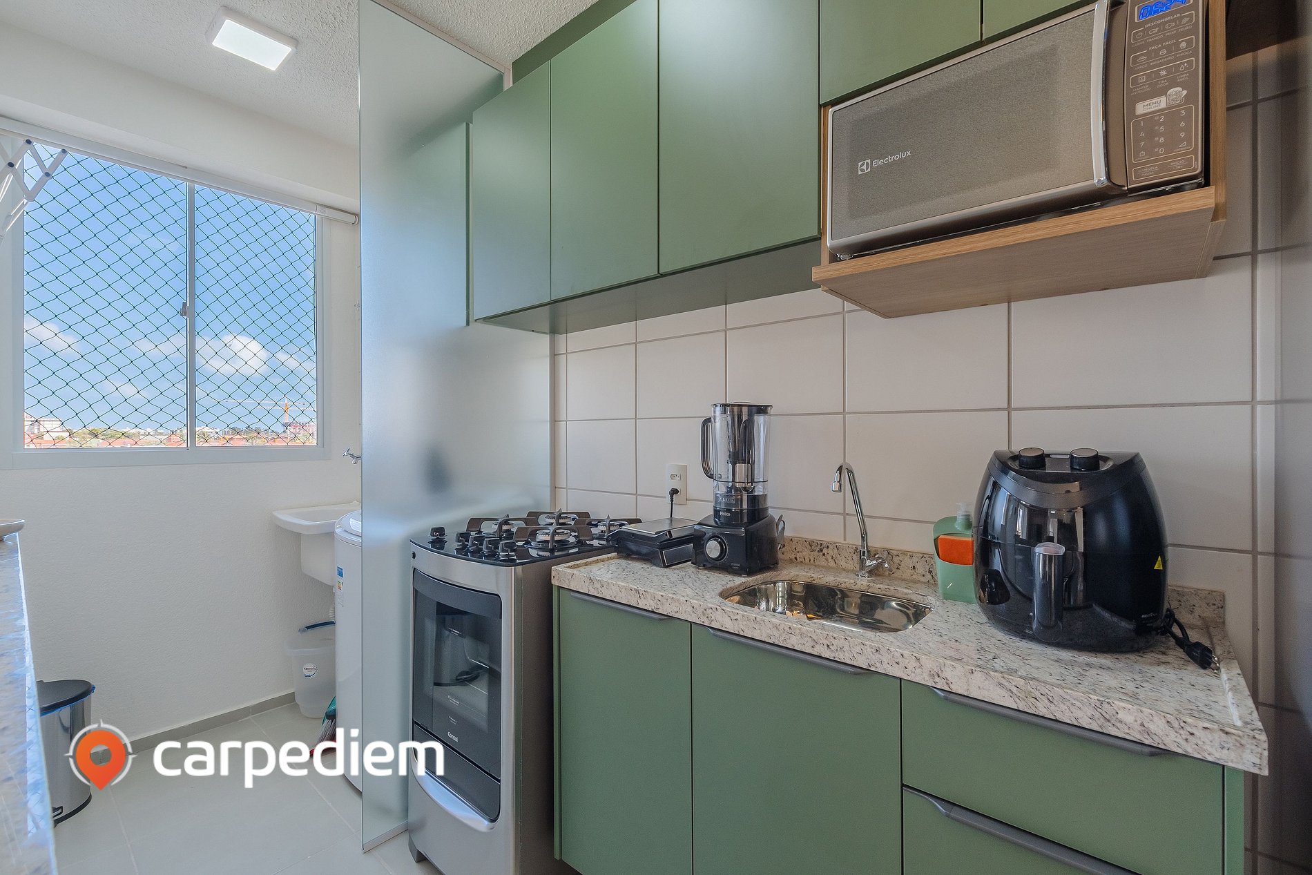 • Cozinha completa e funcional: compacta e equipada com geladeira duplex frost free, micro-ondas, fogão, forno, airfryer, liquidificador, máquina de café, torradeira, armários, panelas, louças e talheres, perfeita para quem gosta de praticidade no dia a dia.