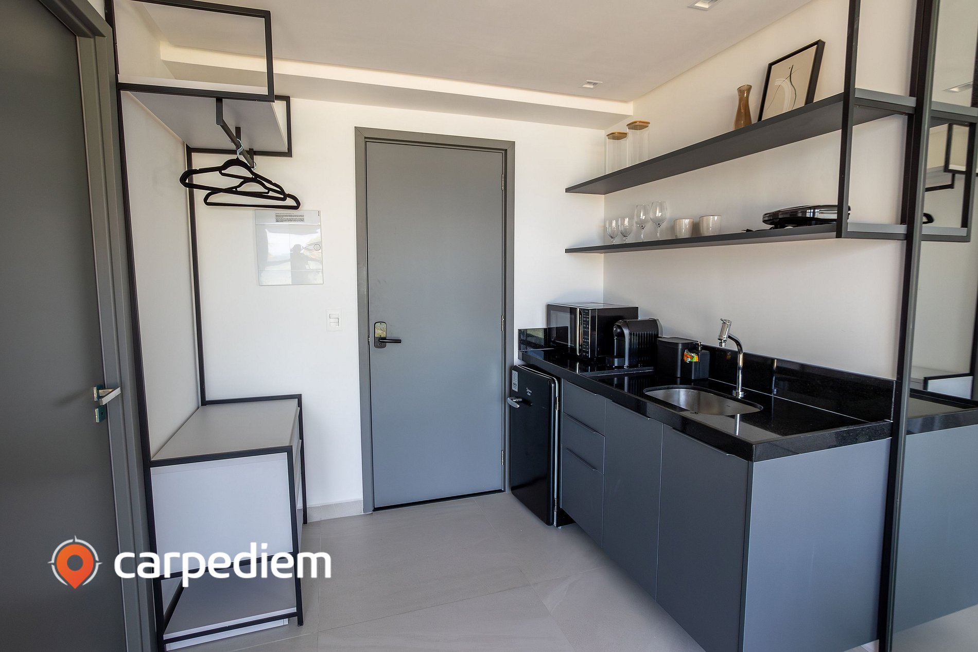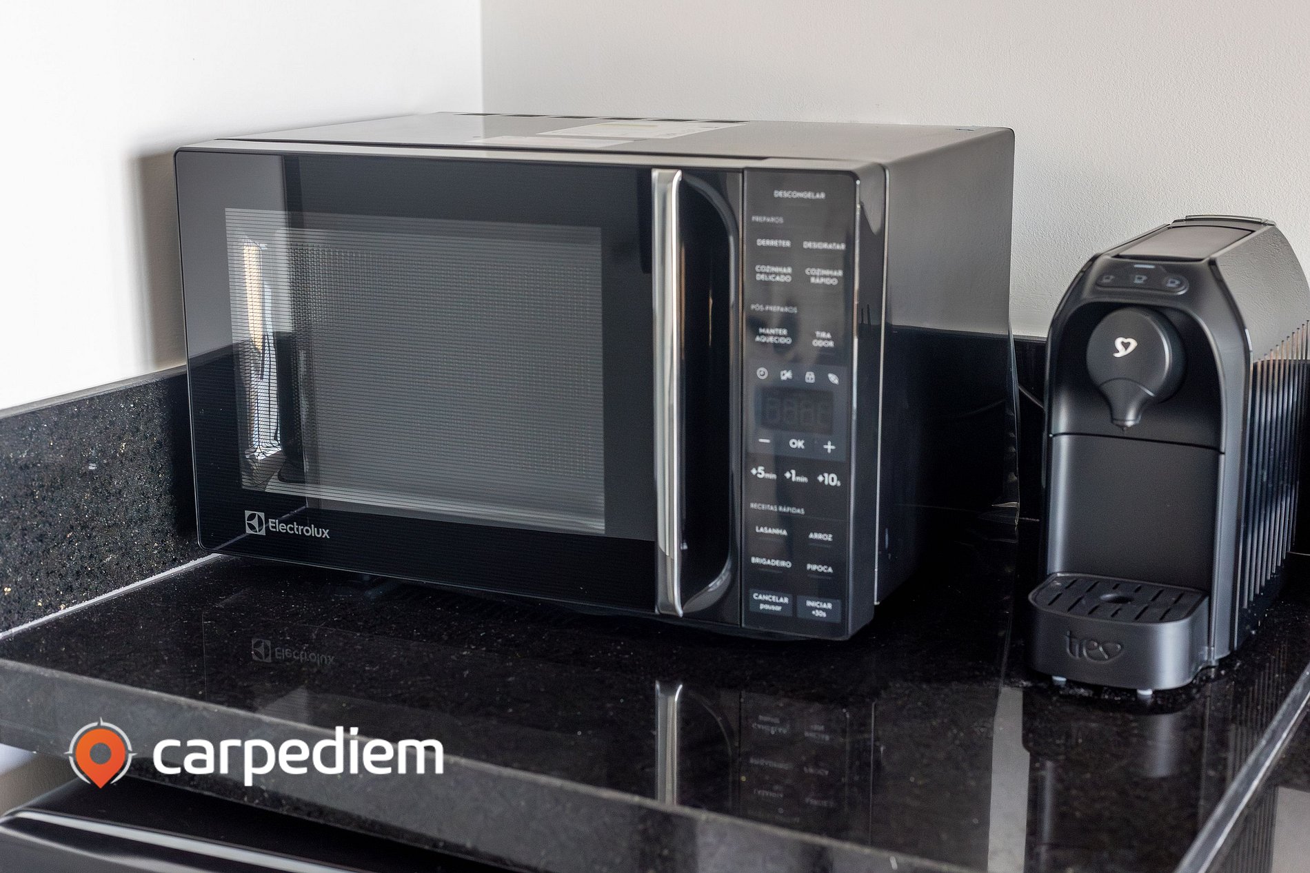 • Cozinha compacta e equipada: prática para o dia a dia, com cooktop, micro-ondas, frigobar, máquina de café, sanduicheira, além de panelas, louças e talheres, facilitando o preparo de refeições rápidas durante a estada.