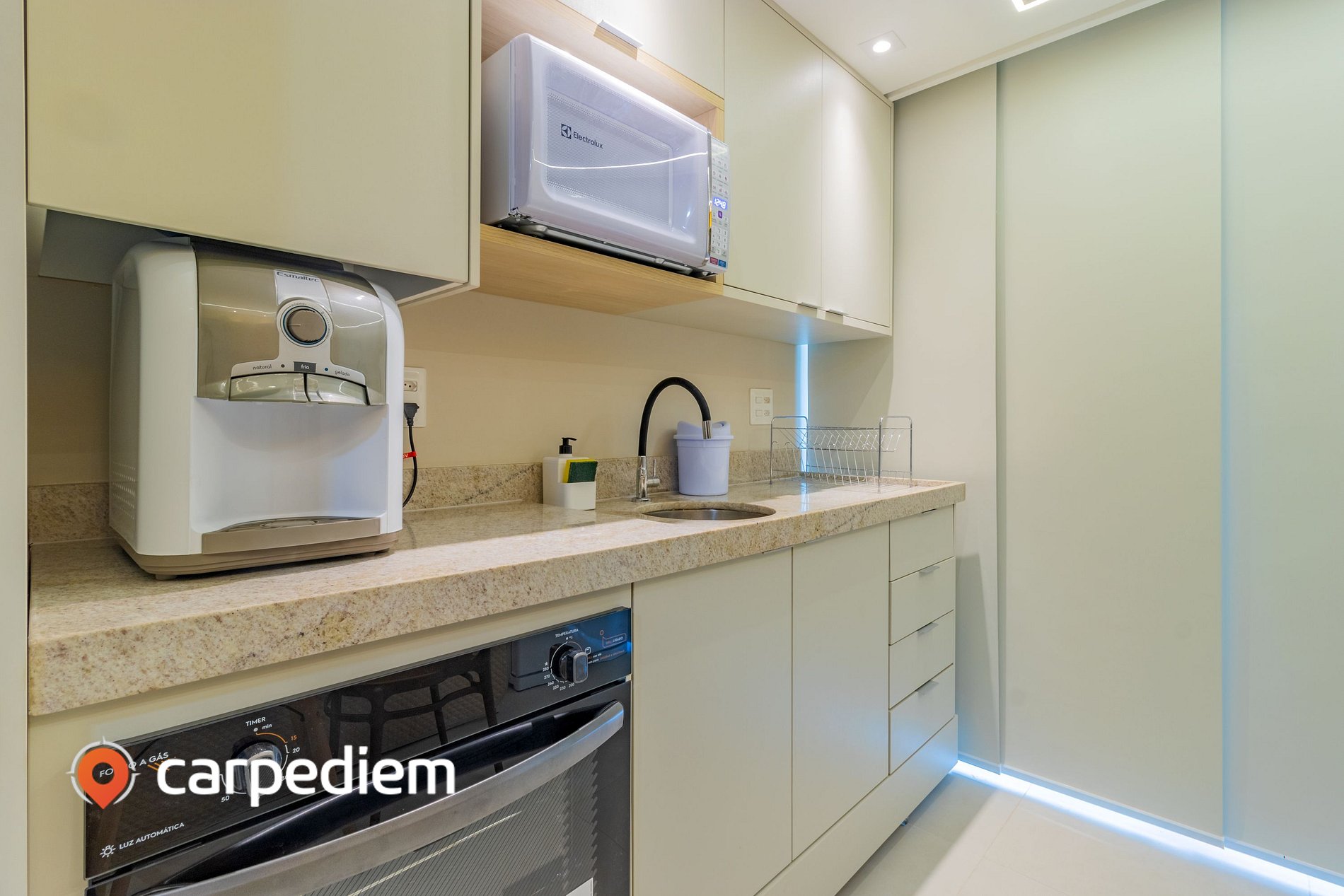 • Cozinha compacta e totalmente equipada, com fogão, forno, geladeira, micro-ondas, liquidificador, torradeira, máquina de café, pia, louças, talheres e itens básicos de cozinha.