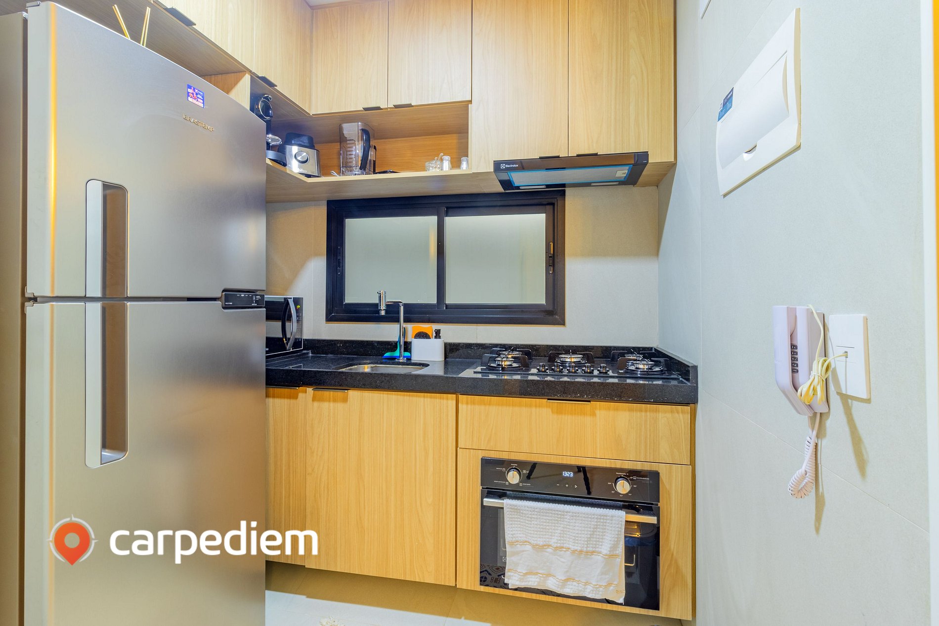 • Cozinha: compacta e bem equipada para o dia a dia, com cooktop 4 bocas com sugar, forno, micro-ondas, liquidificador, cafeteira, armários e geladeira duplex frost free.