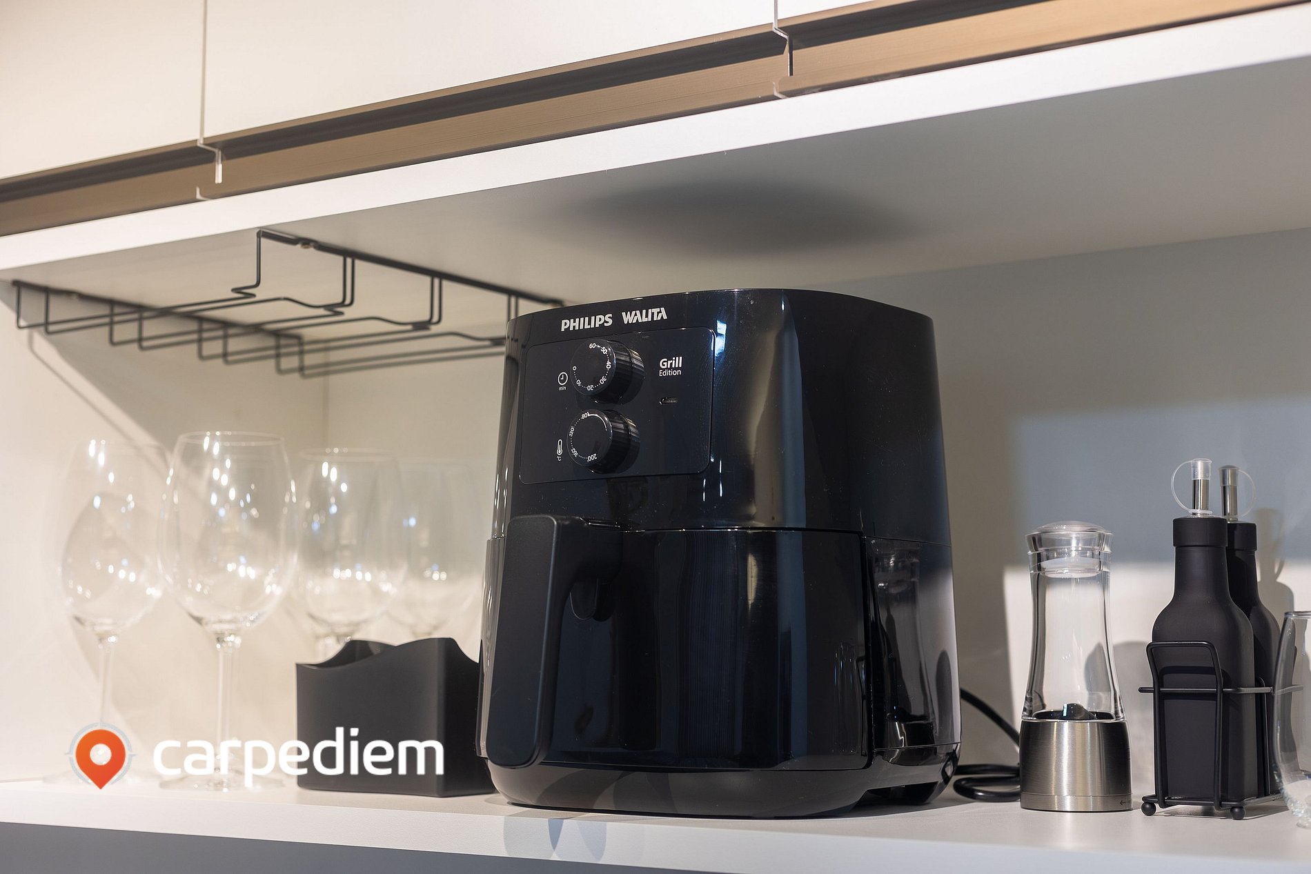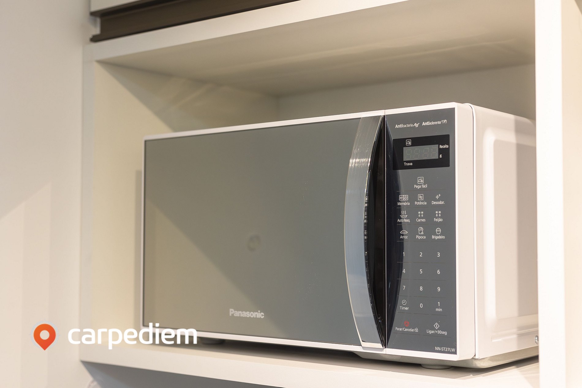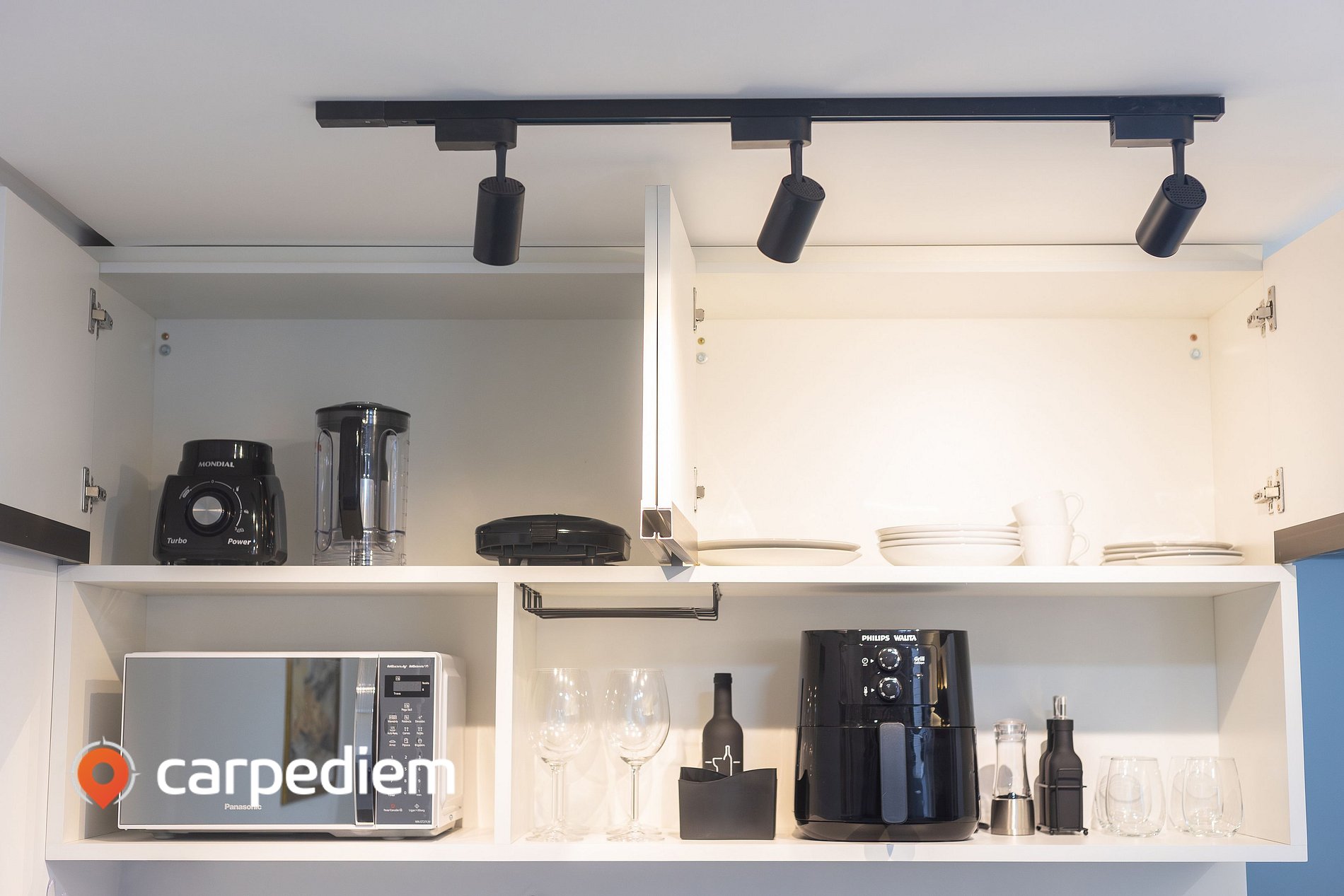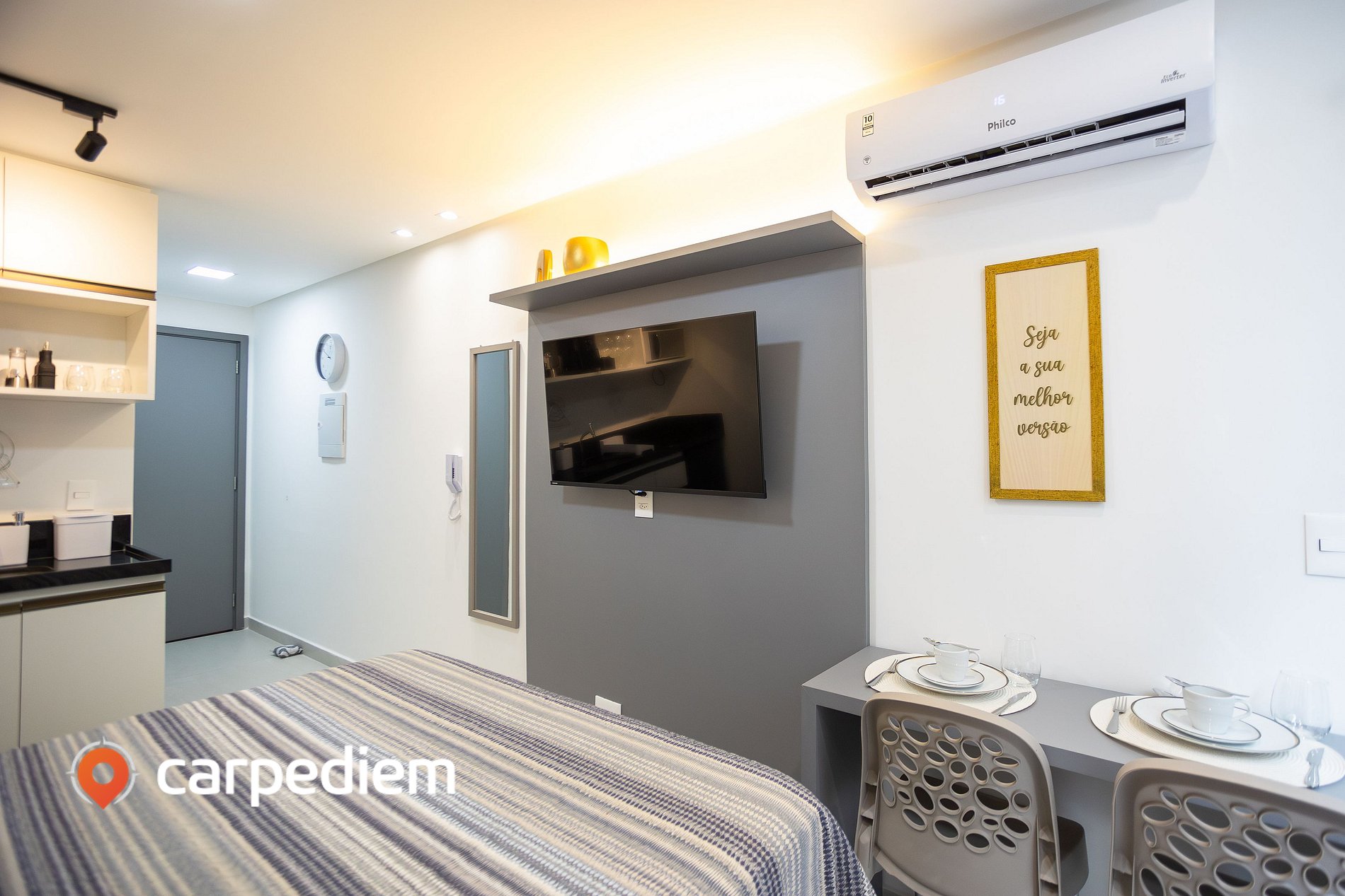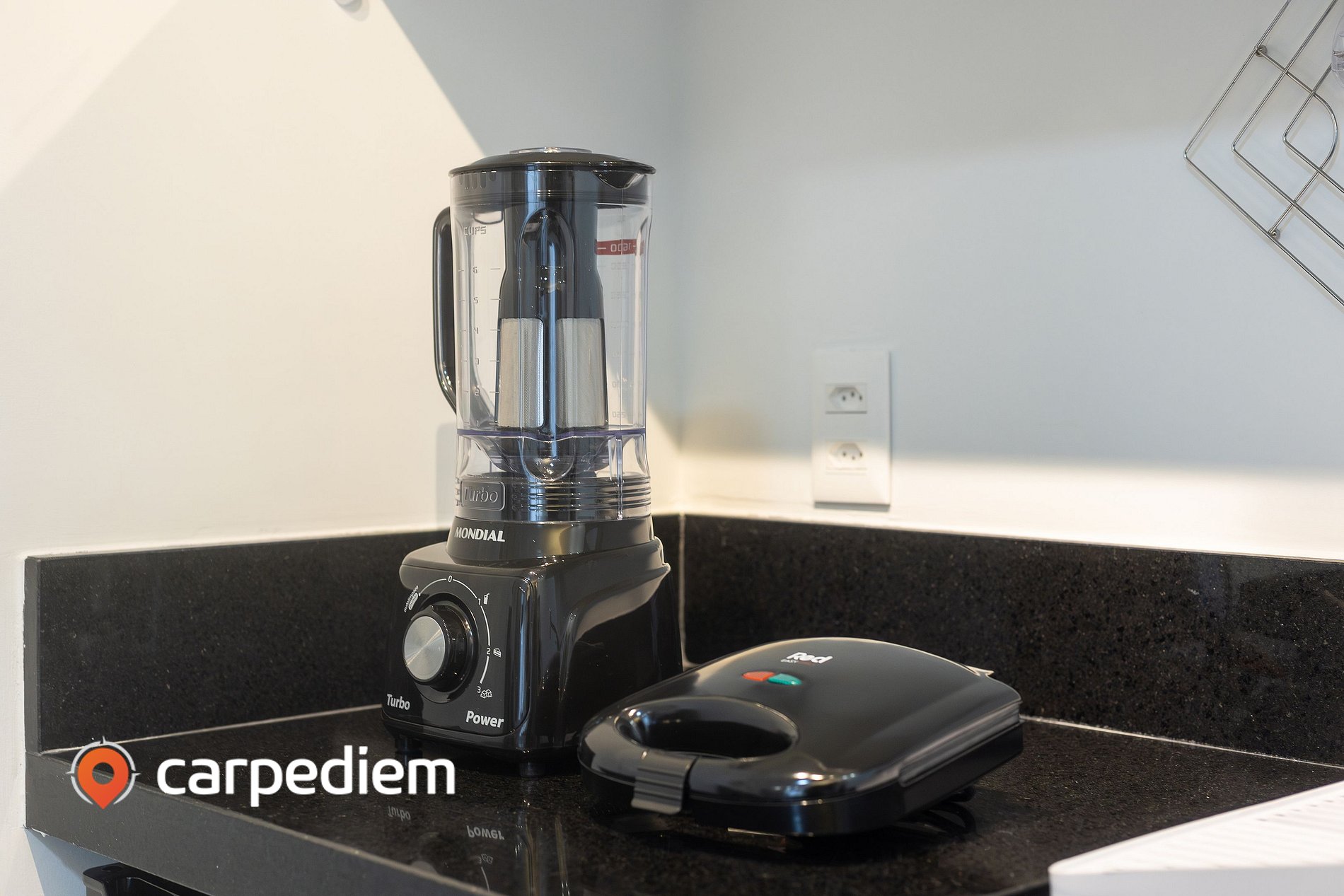 • Cozinha compacta e equipada: prática para o dia a dia, com fogão, micro-ondas, airfryer, máquina de café, sanduicheira, liquidificador, além de armários para organização dos utensílios.