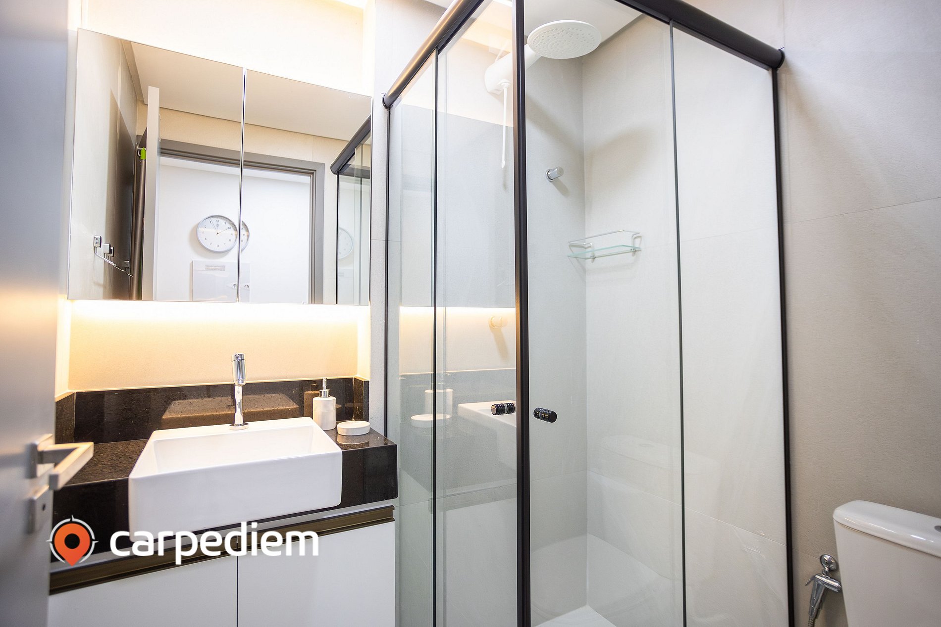 • Banheiro privativo: funcional e bem distribuído, com box de vidro, espelho, armário, secador de cabelo e ferro de passar, oferecendo comodidade para a rotina.