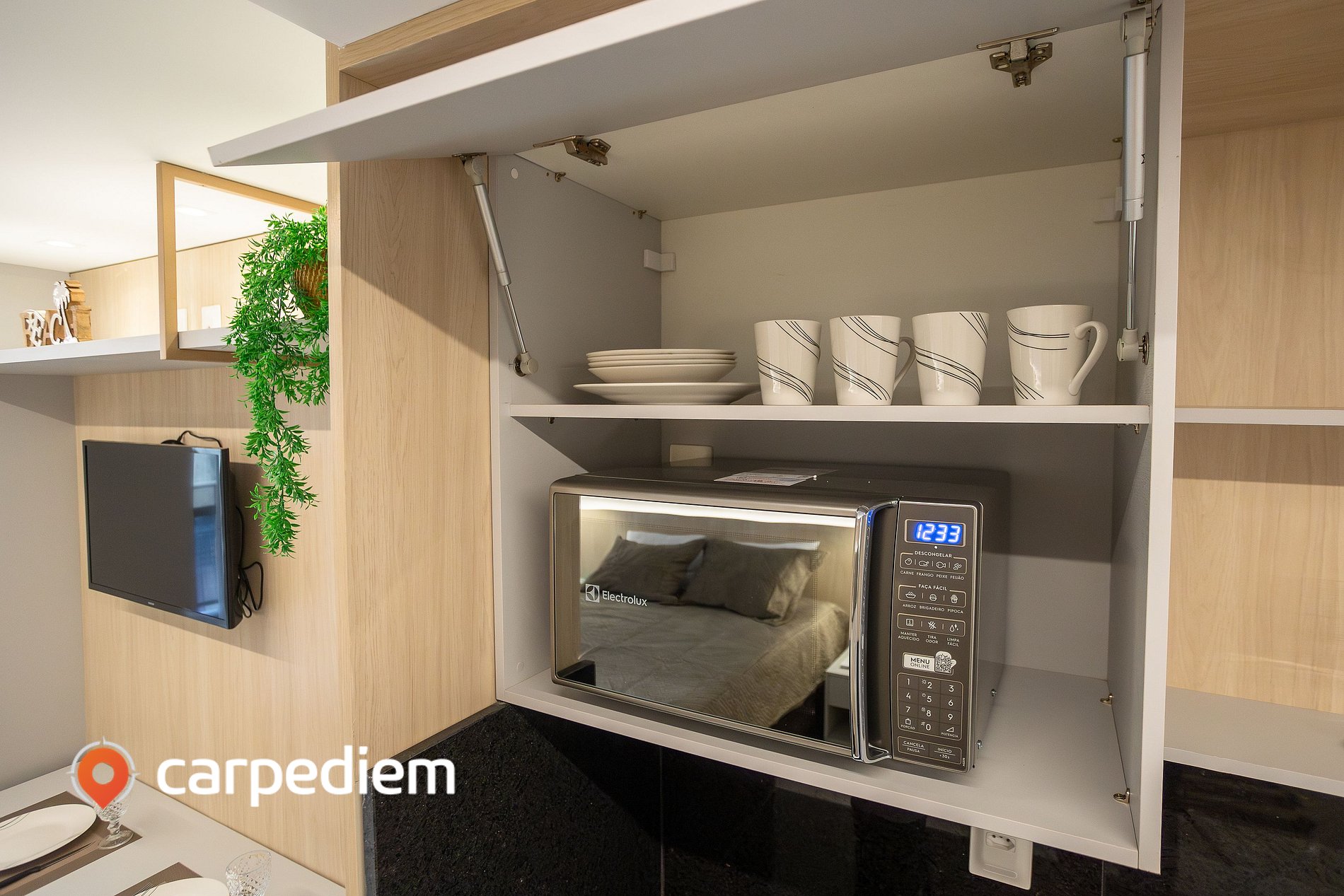 • Cozinha compacta: Prática e bem equipada para o dia a dia, conta com frigobar, cooktop, micro-ondas, armários, além de panelas, louças e talheres, máquina de café e liquidificador — ideal para refeições rápidas ou um café tranquilo pela manhã.