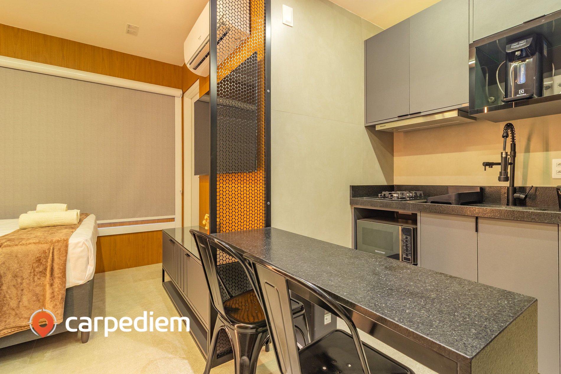Um estúdio aconchegante de 24m², perfeito para quem busca praticidade sem abrir mão do conforto. Com capacidade para acomodar até quatro hóspedes, o espaço conta com Wi‑Fi, ar-condicionado e TV, garantindo conectividade e entretenimento durante toda a estadia. Além disso, possui banheiro privativo e uma cozinha compacta, ideal para preparar refeições rápidas com praticidade. Seja para uma viagem a lazer ou uma estadia a trabalho, este estúdio é uma excelente escolha para quem valoriza conforto, economia e uma boa localização.