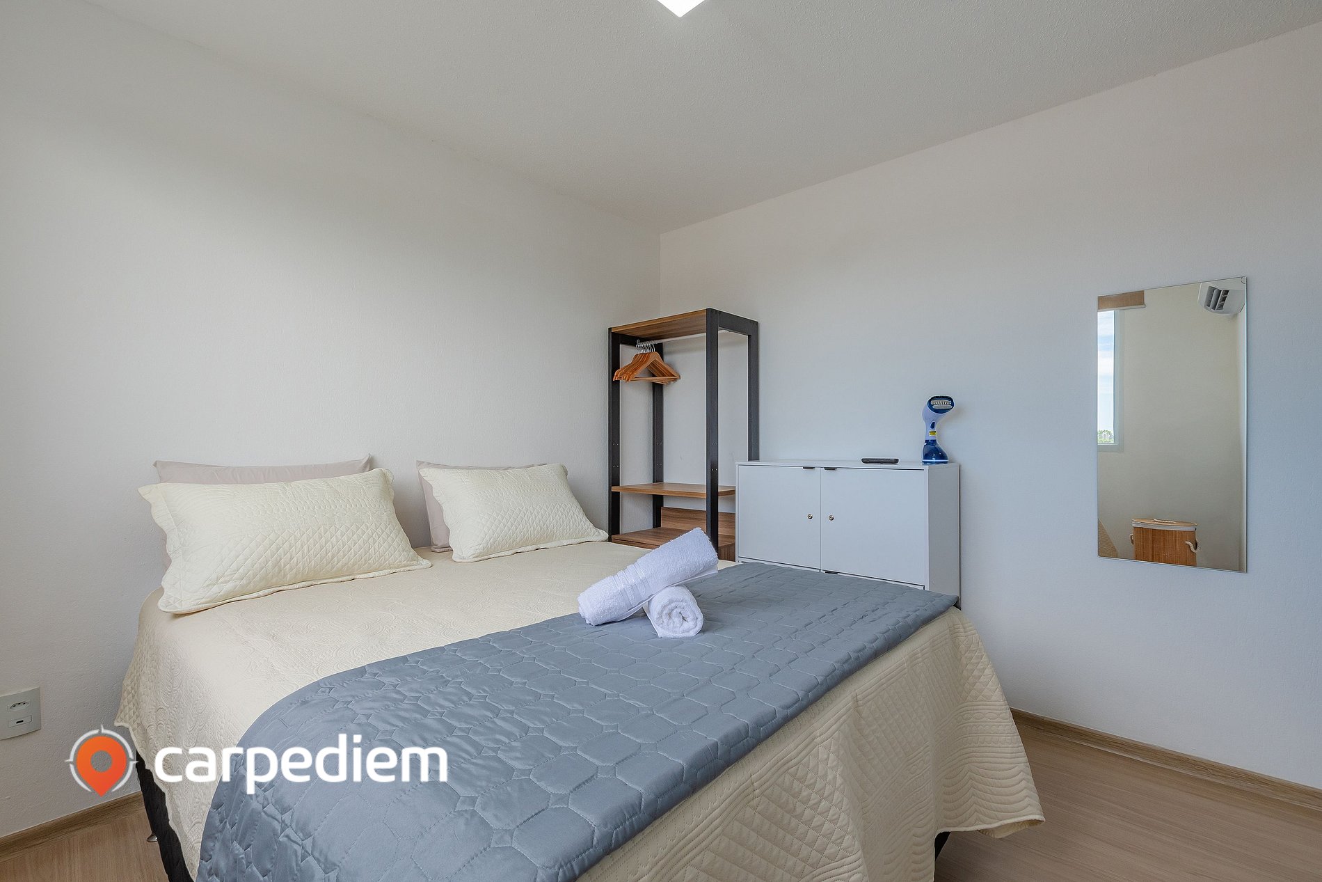 • Suíte 1 com cama queen, cortina blackout, ar-condicionado, armário, arara com cabides, espelho de corpo inteiro e tomada ao lado da cama, unindo conforto e praticidade na sua rotina.