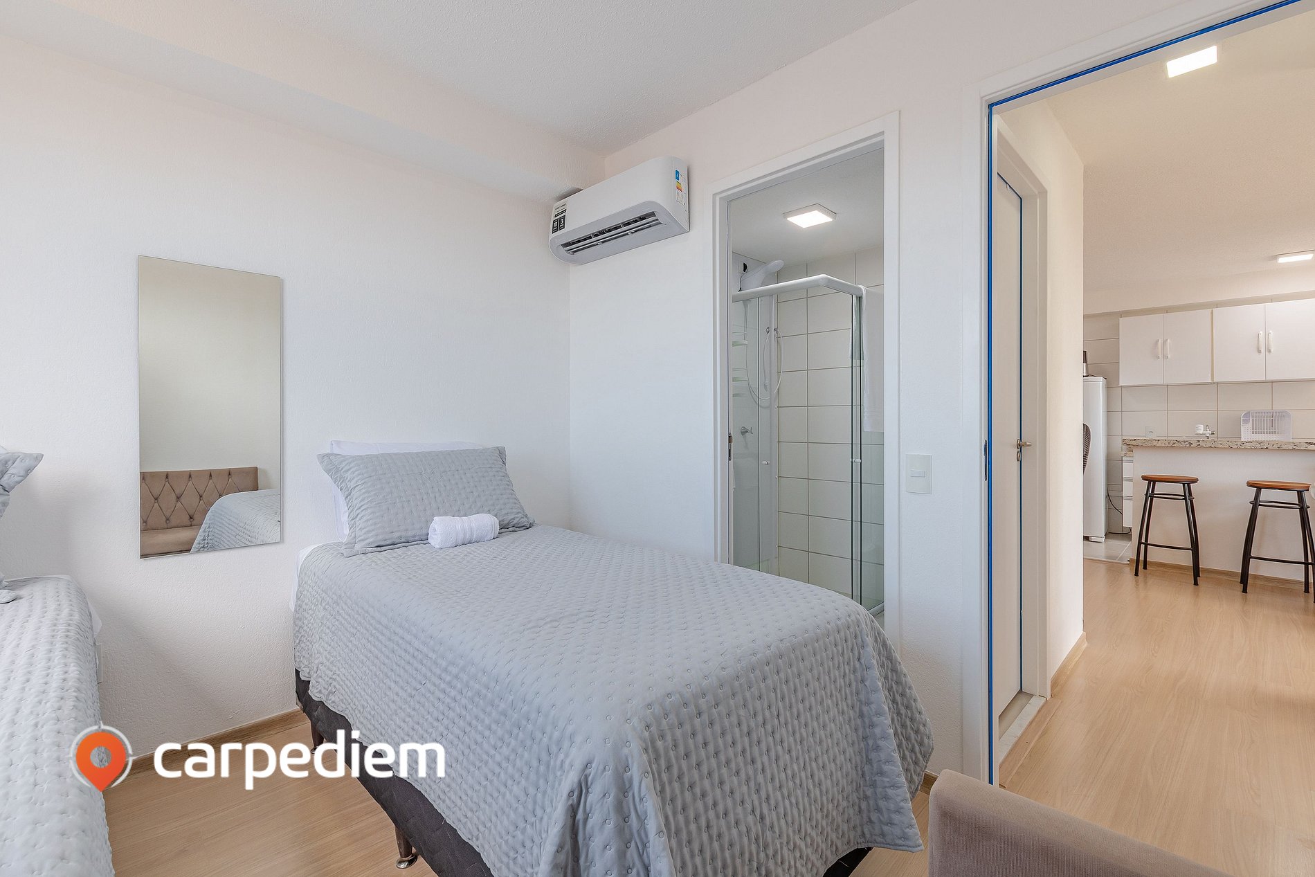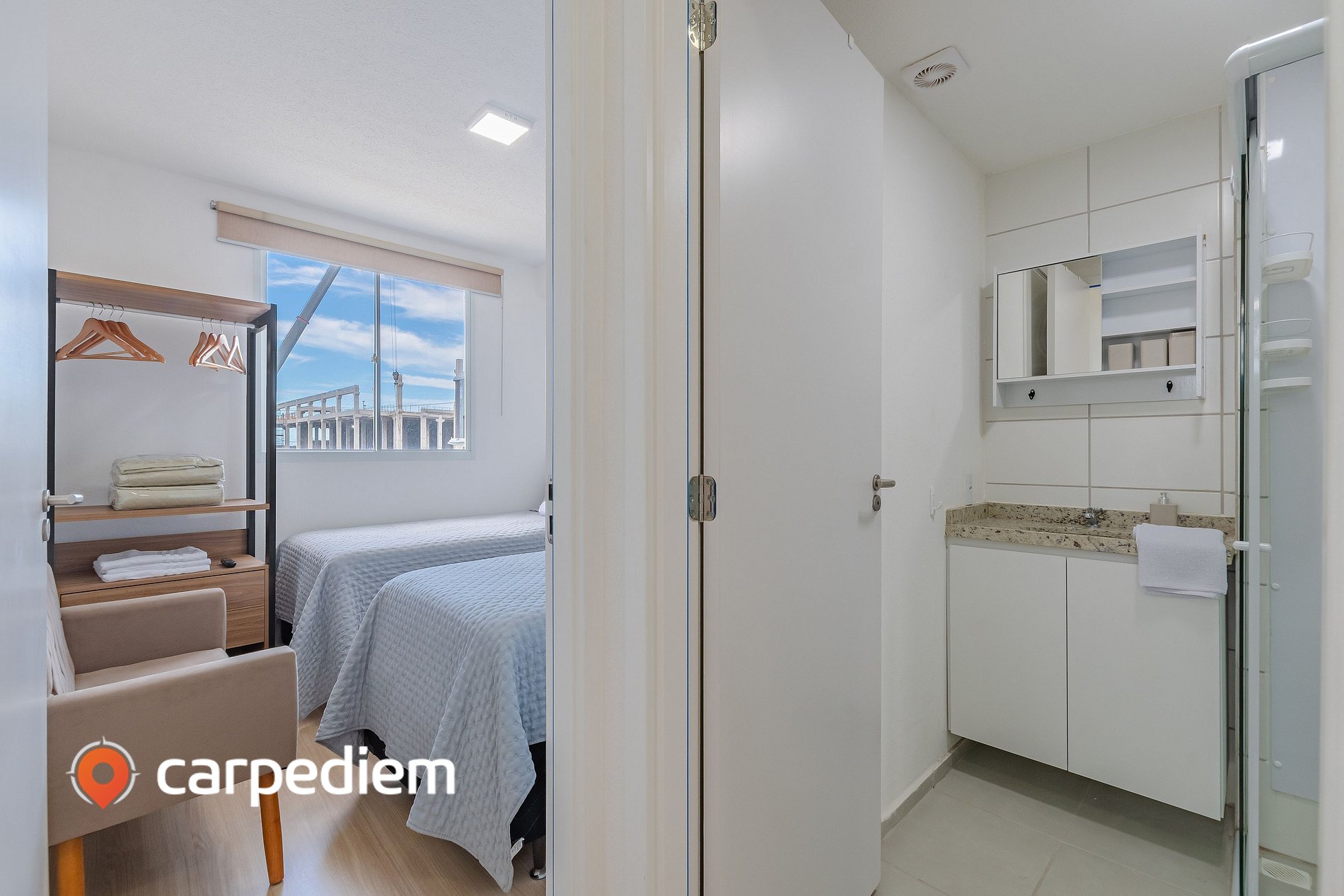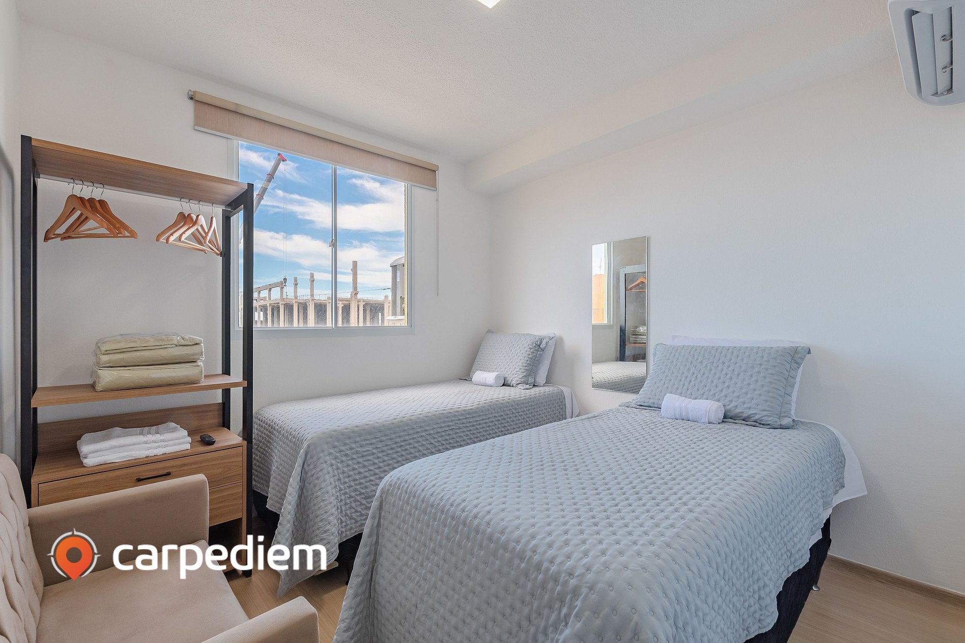 • Suíte 2 com duas camas de solteiro, sofá, ar-condicionado, cortina blackout, armário, arara com cabides e espelho de corpo inteiro, ideal para acomodar família ou amigos com conforto.