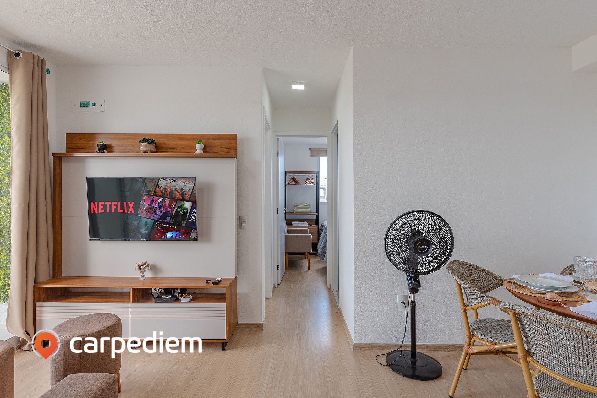 • Sala de estar acolhedora com sofá, Smart TV, ventilador, cortina e mesa de jantar com 4 cadeiras, criando o ambiente ideal para relaxar após um dia de praia ou compartilhar refeições em boa companhia.