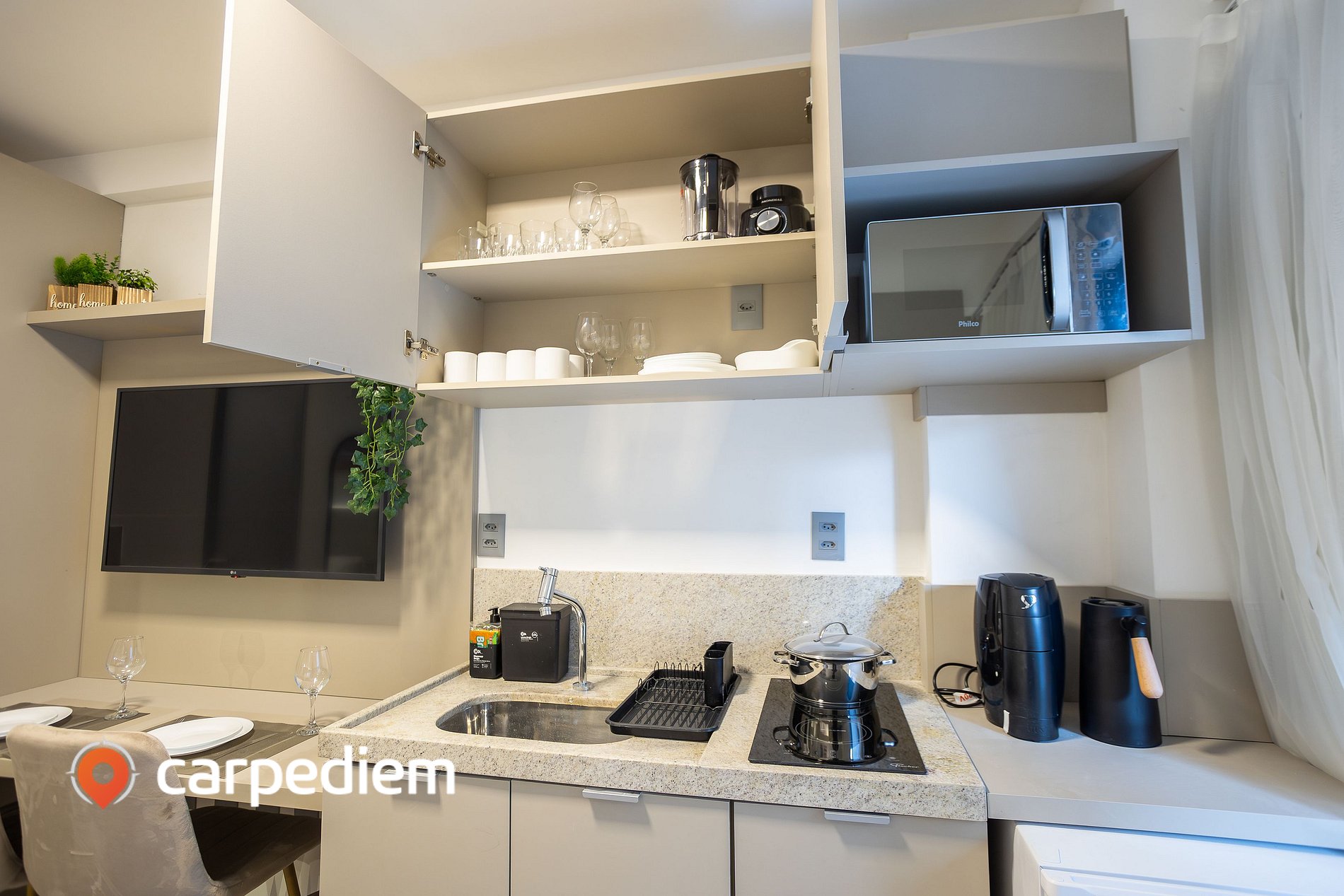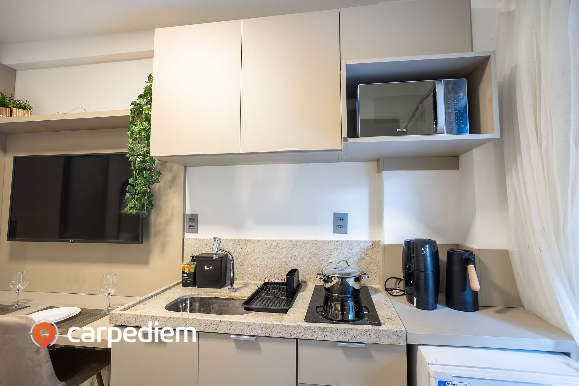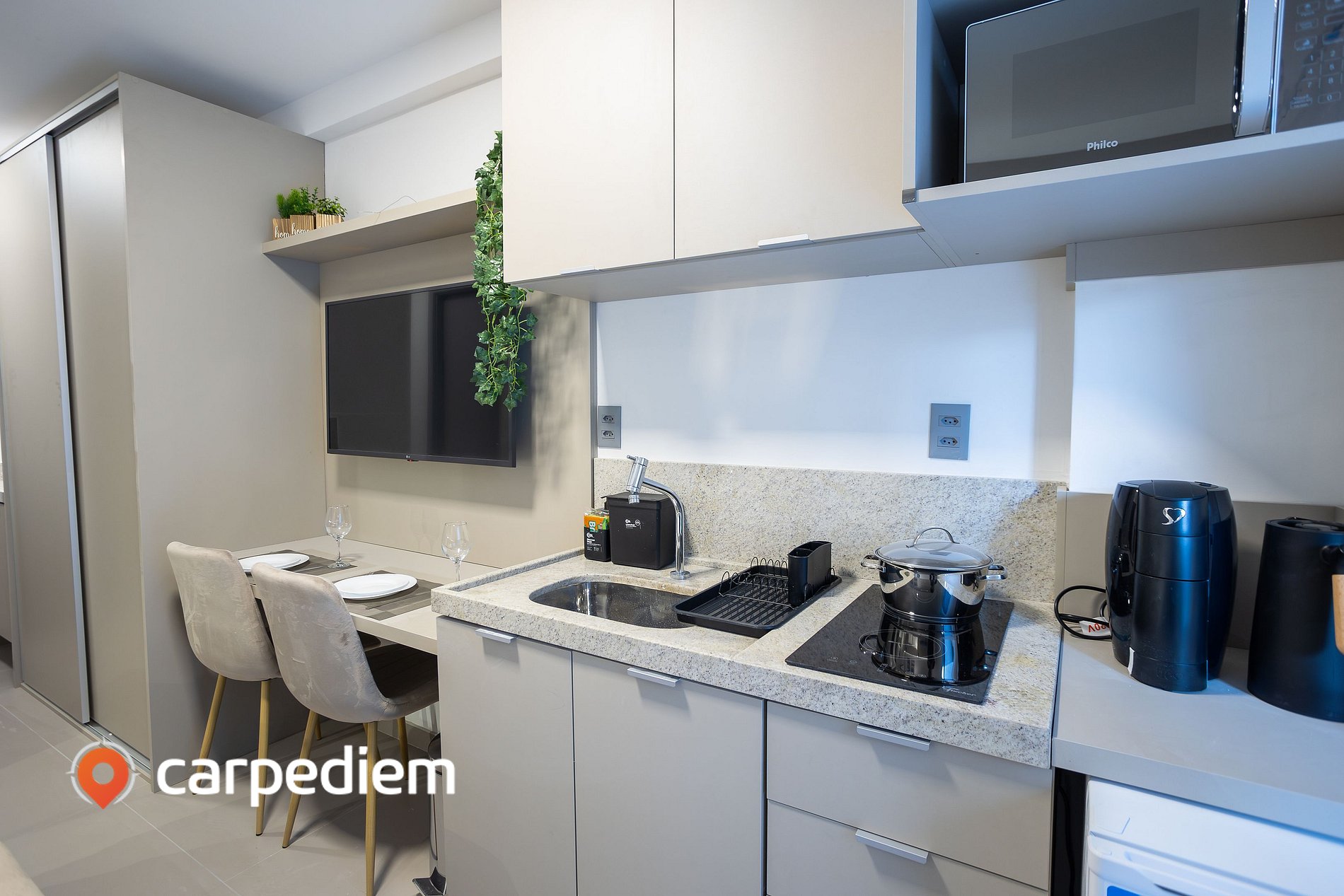 • Cozinha equipada com cooktop duas bocas, frigobar, micro-ondas, máquina de café, garrafa de café, liquidificador, torradeira, pia, bancada, armários, louças, talheres e panelas, prática para o dia a dia da estadia.