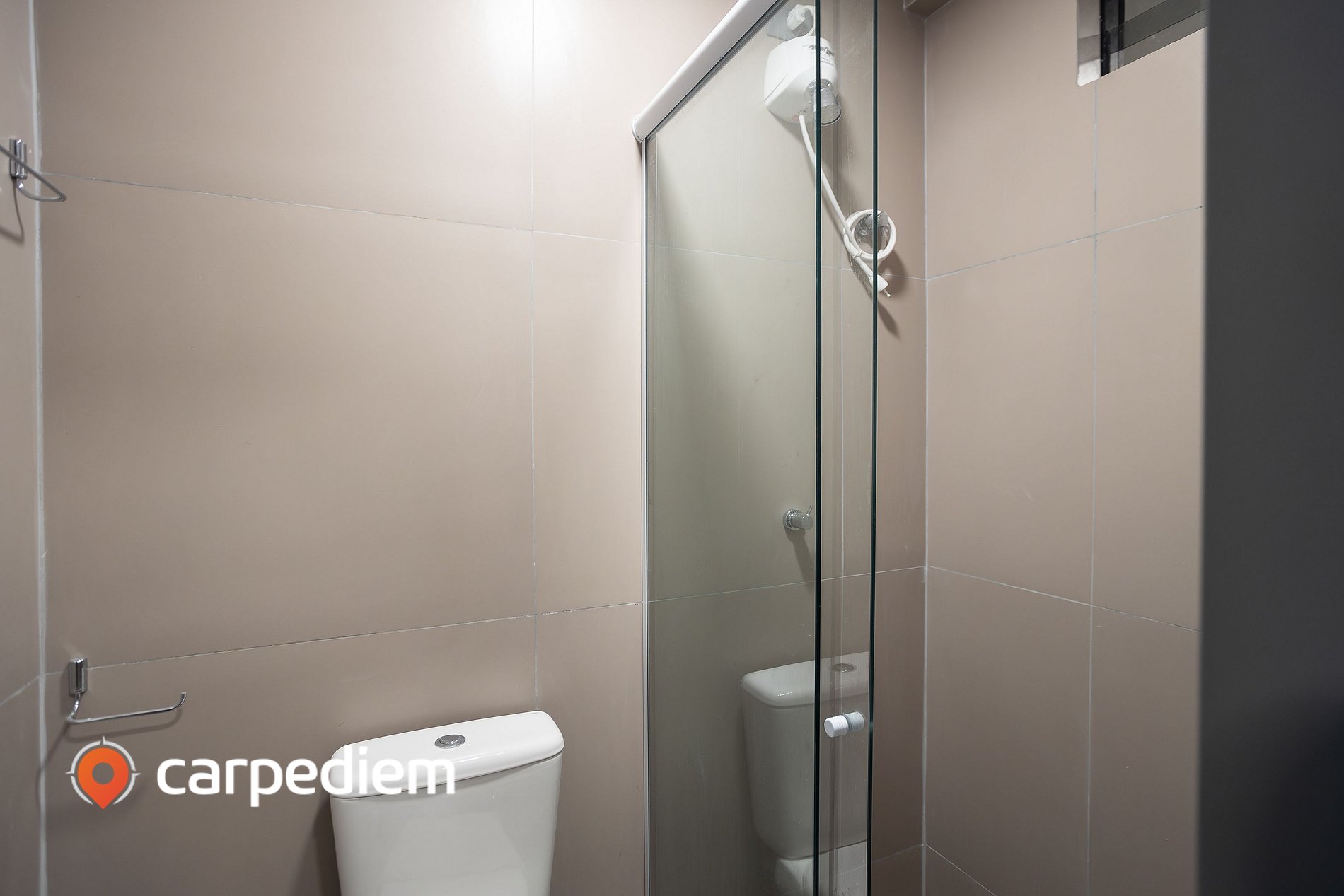 • Banheiro privativo com box de vidro, espelho e armário, além de secador de cabelo para maior comodidade.