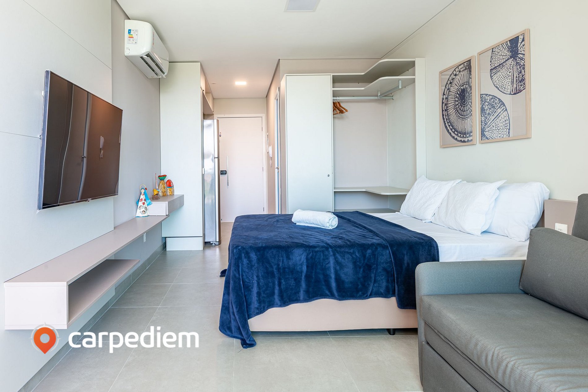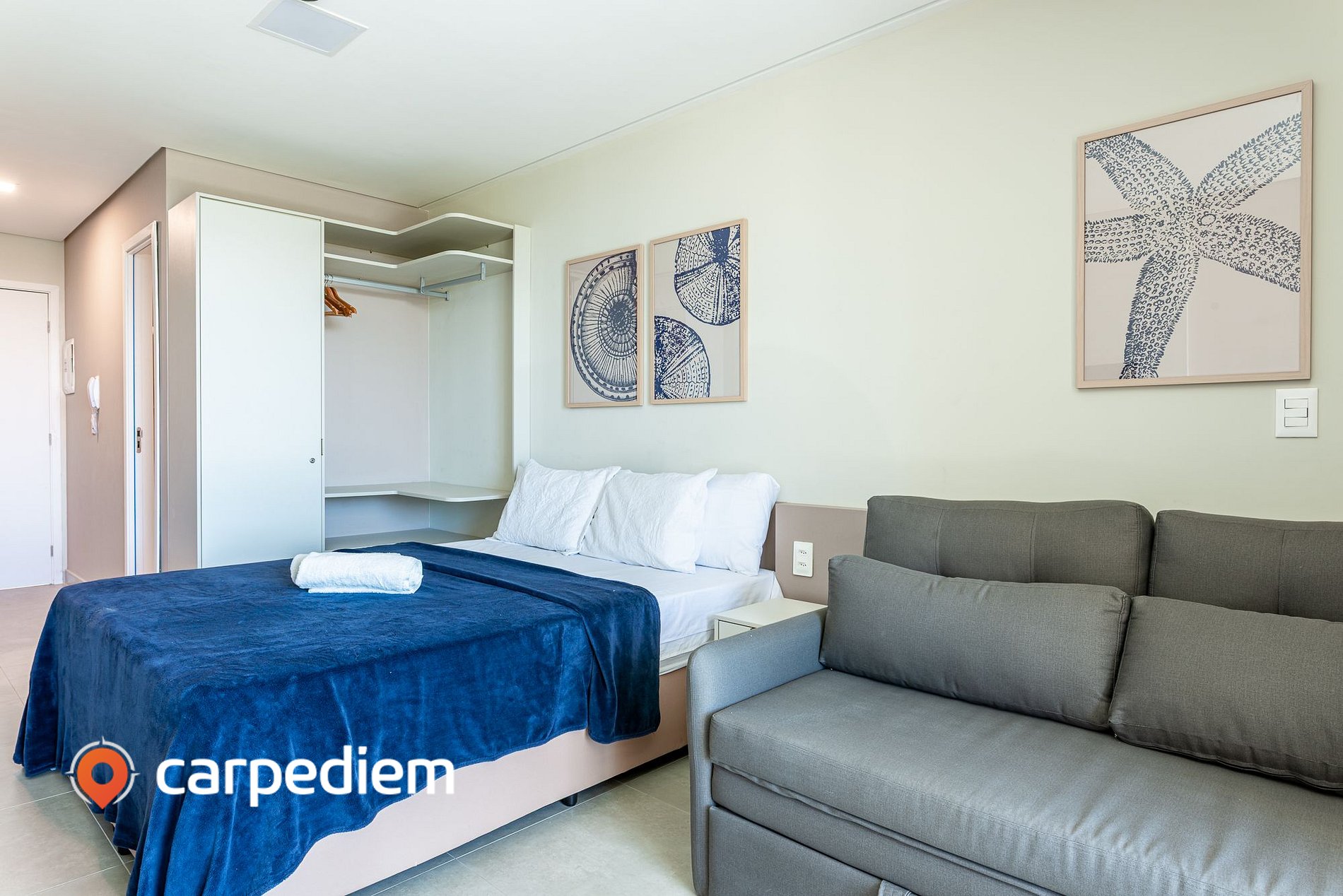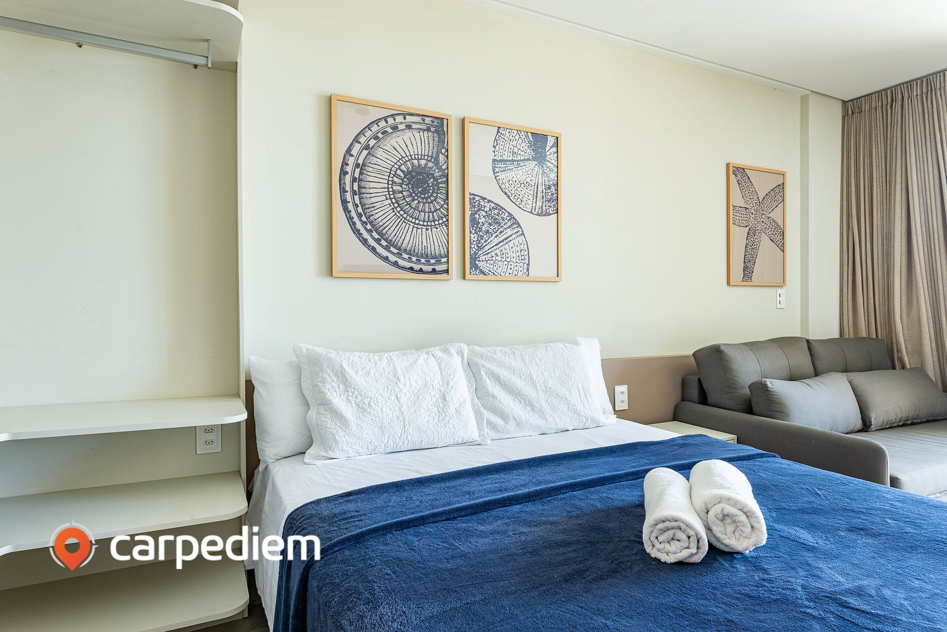 • Studio integrado e funcional: com cama de casal confortável, sofá-cama, ar-condicionado, TV, WI-FI, roupas de cama, armário e arara com cabides, cortinas blackout, perfeita para noites de descanso profundo em um ambiente moderno e aconchegante.