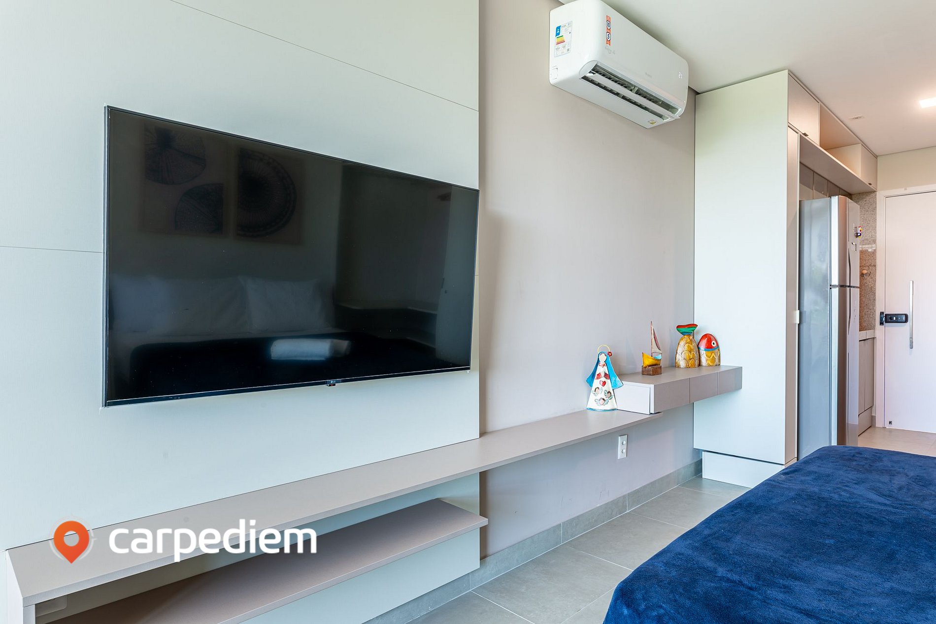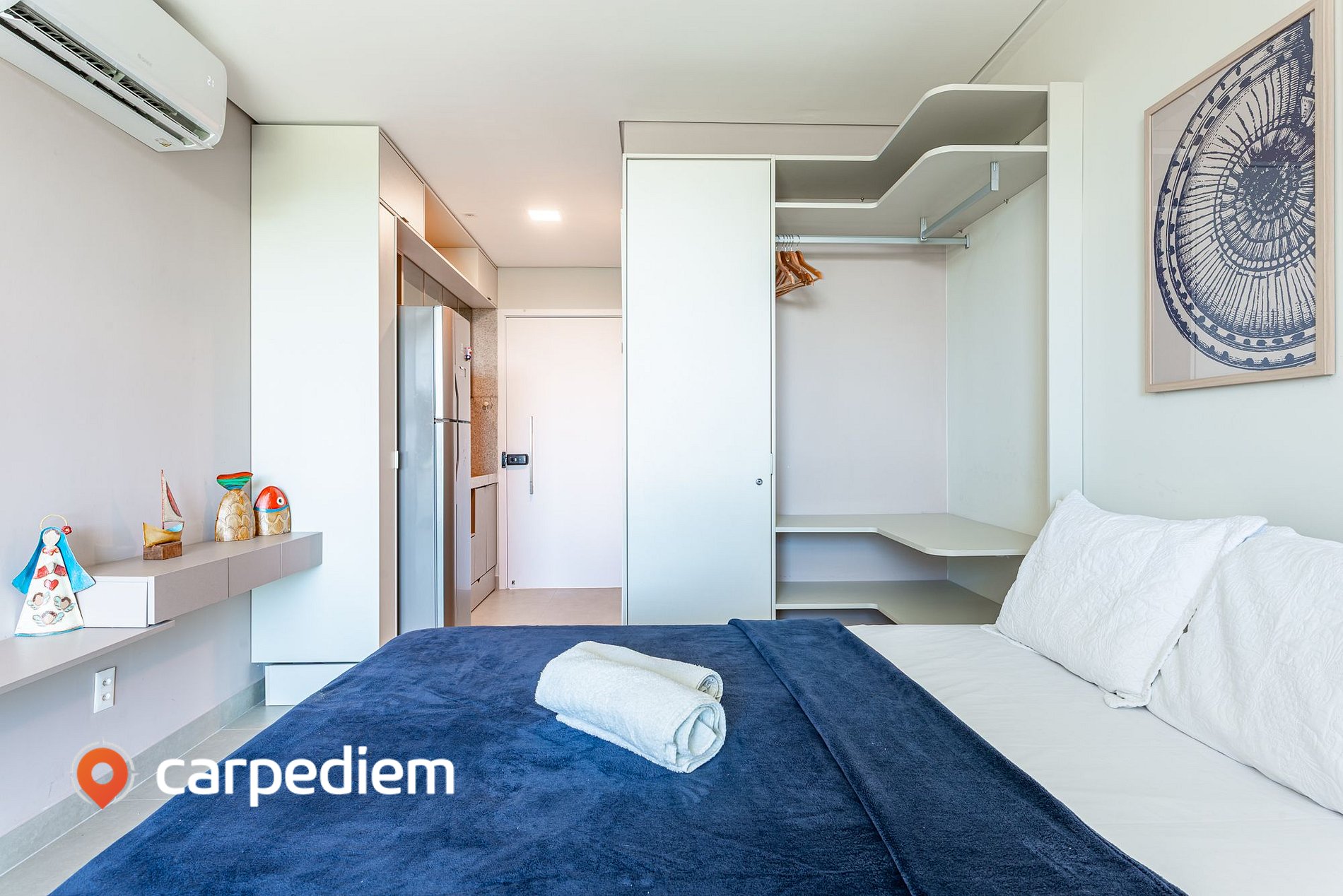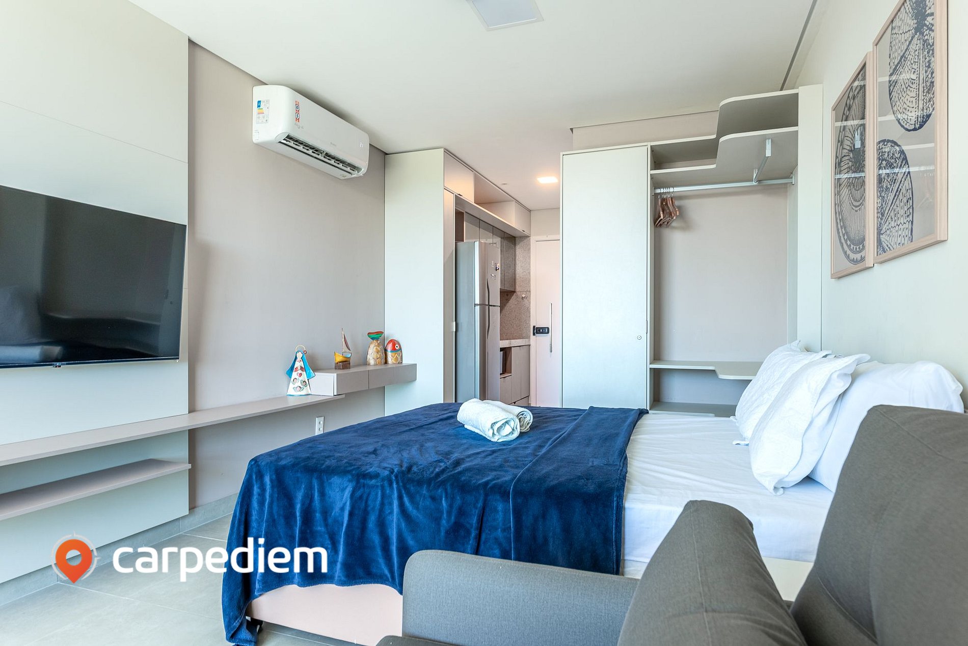 • Studio integrado e funcional: com cama de casal confortável, sofá-cama, ar-condicionado, TV, WI-FI, roupas de cama, armário e arara com cabides, cortinas blackout, perfeita para noites de descanso profundo em um ambiente moderno e aconchegante.