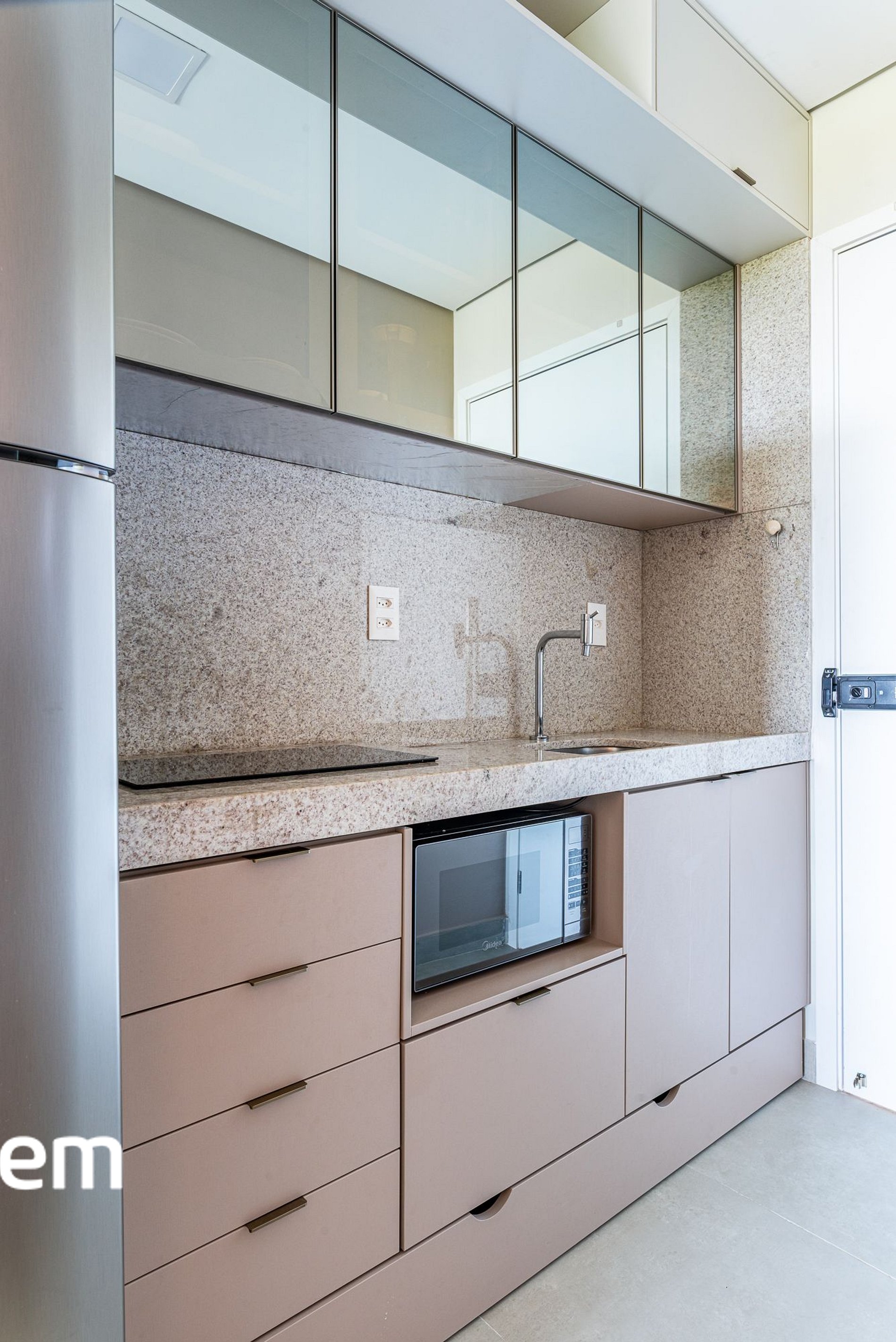 • Cozinha compacta equipada: armários planejados, geladeira frost free duplex, airfryer, torradeira e máquina de café para preparar suas refeições com facilidade.