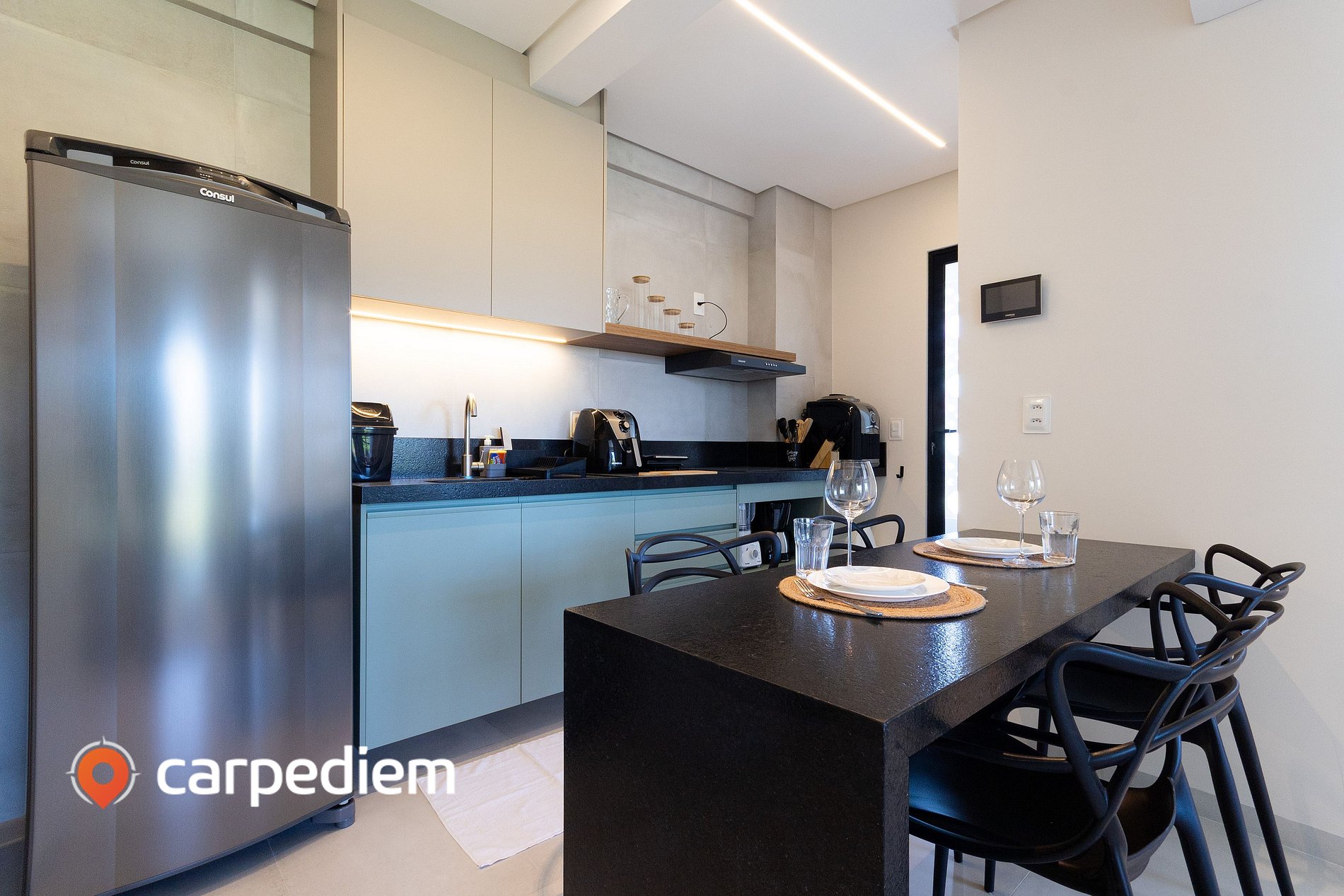 • Cozinha compacta e funcional: equipada com fogão, geladeira, liquidificador, máquina de café, AirFryer, grill para churrasco, louças, talheres e utensílios essenciais, além de mesa de jantar e copos de vinho.